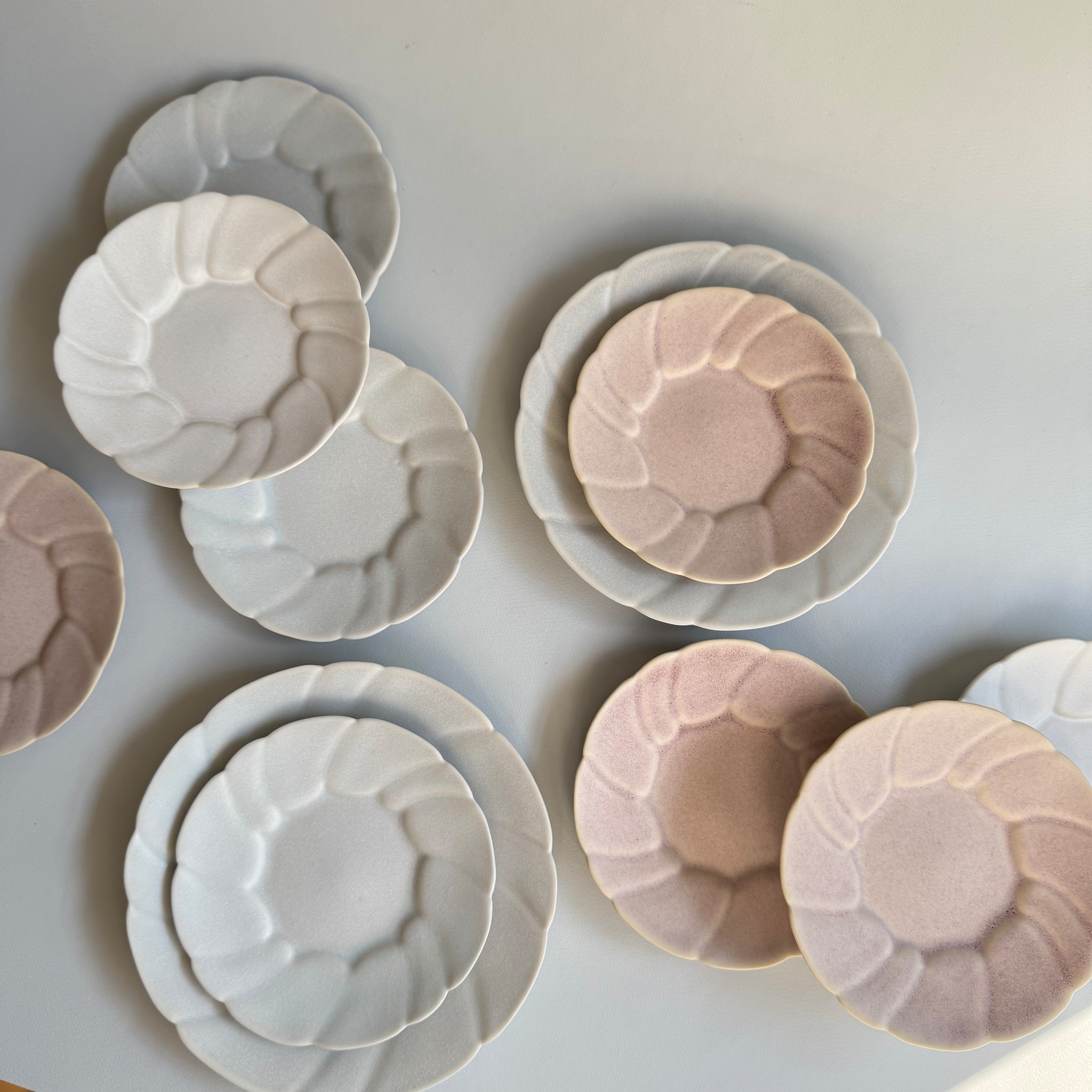 流れるような曲線が美しい楕円の鉢や取り皿にもソーサーにも嬉しい小皿など、
