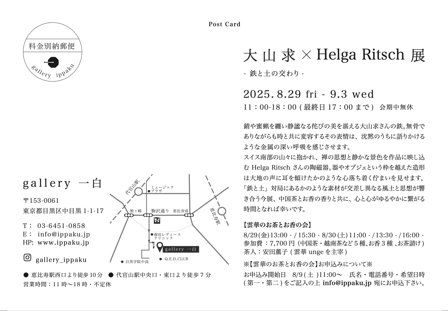 大山求×Helga Ritsch展に合わせ、『雲華 unge』主宰の安田薫子さんによるお茶とお香の会を開催いたします。