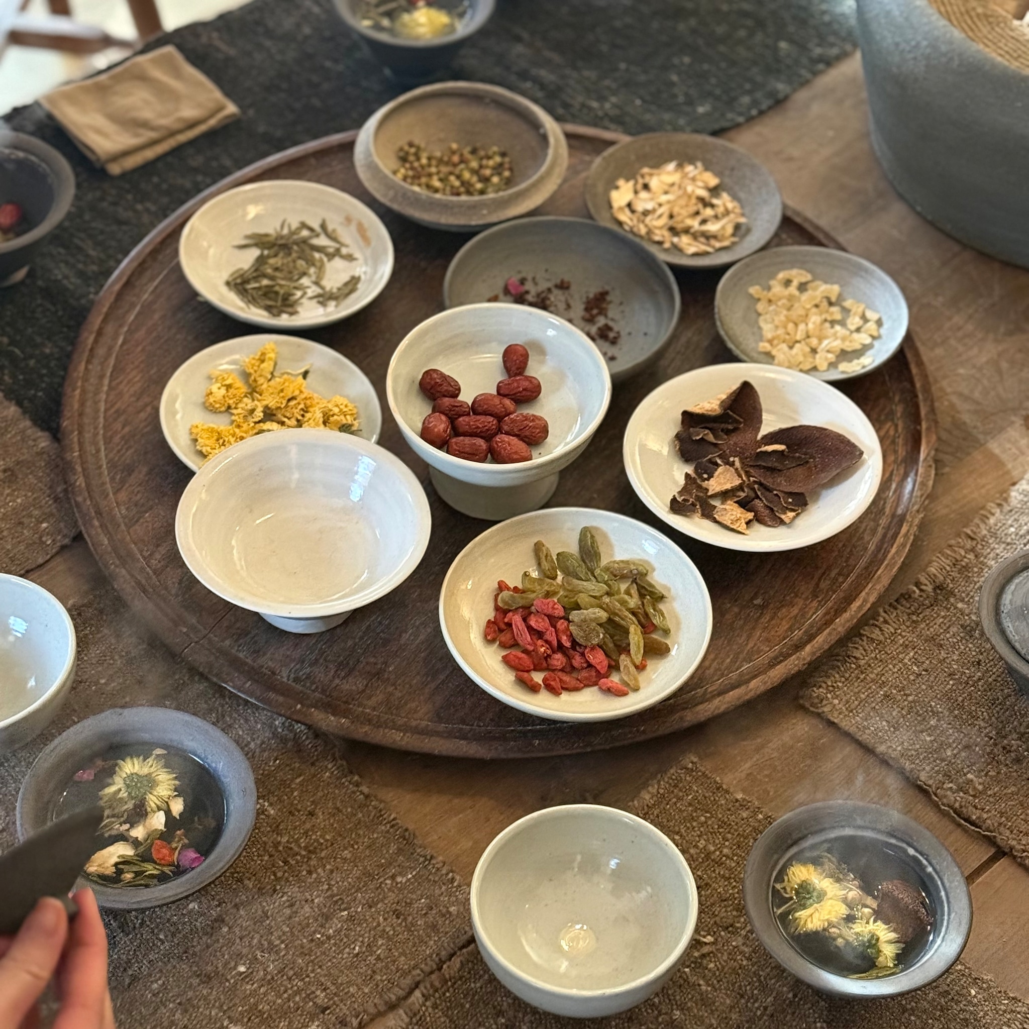 穏やかな時間の中で清水さんの焙じた童仙房のお茶やご自身で組み合わせを選ぶ八宝茶など、
