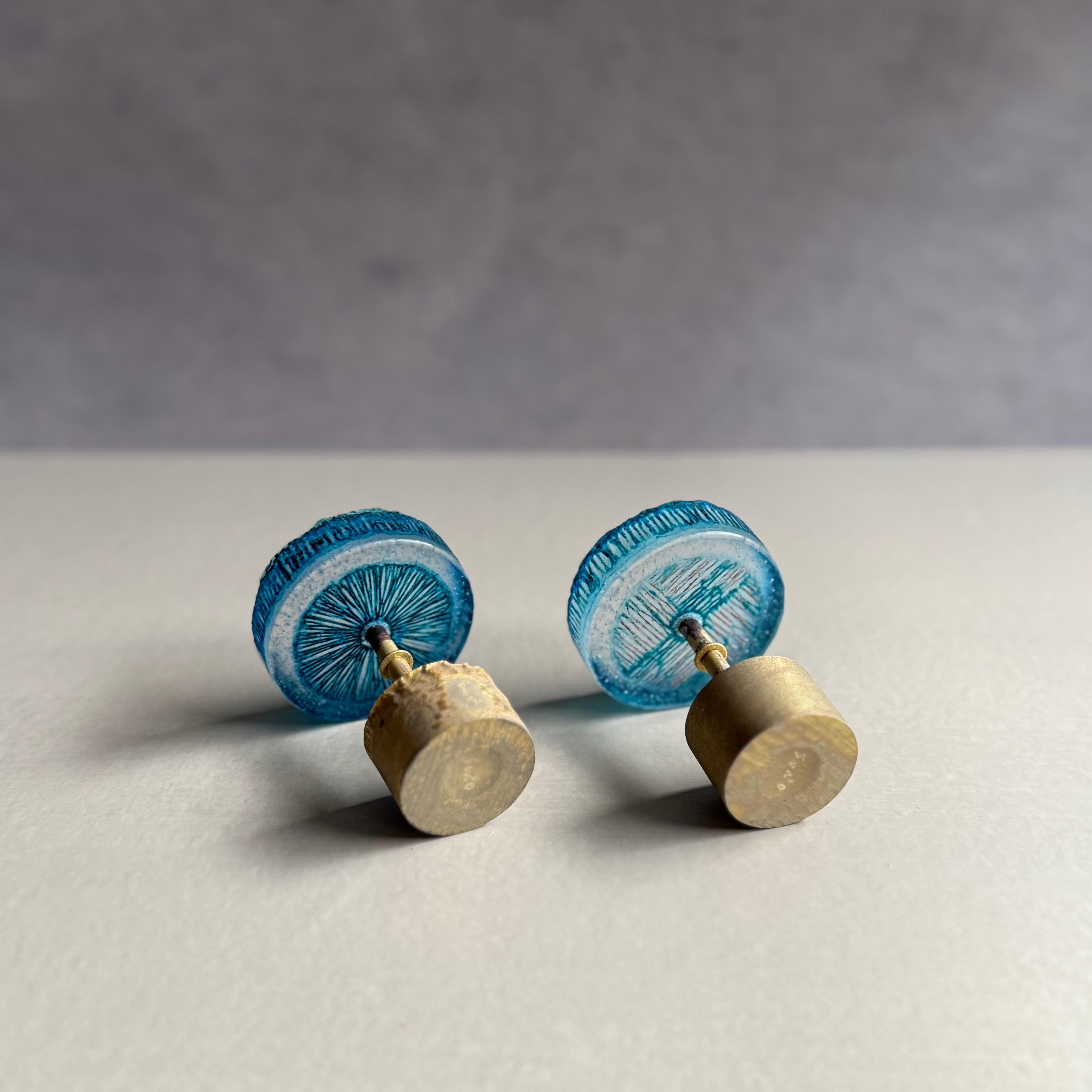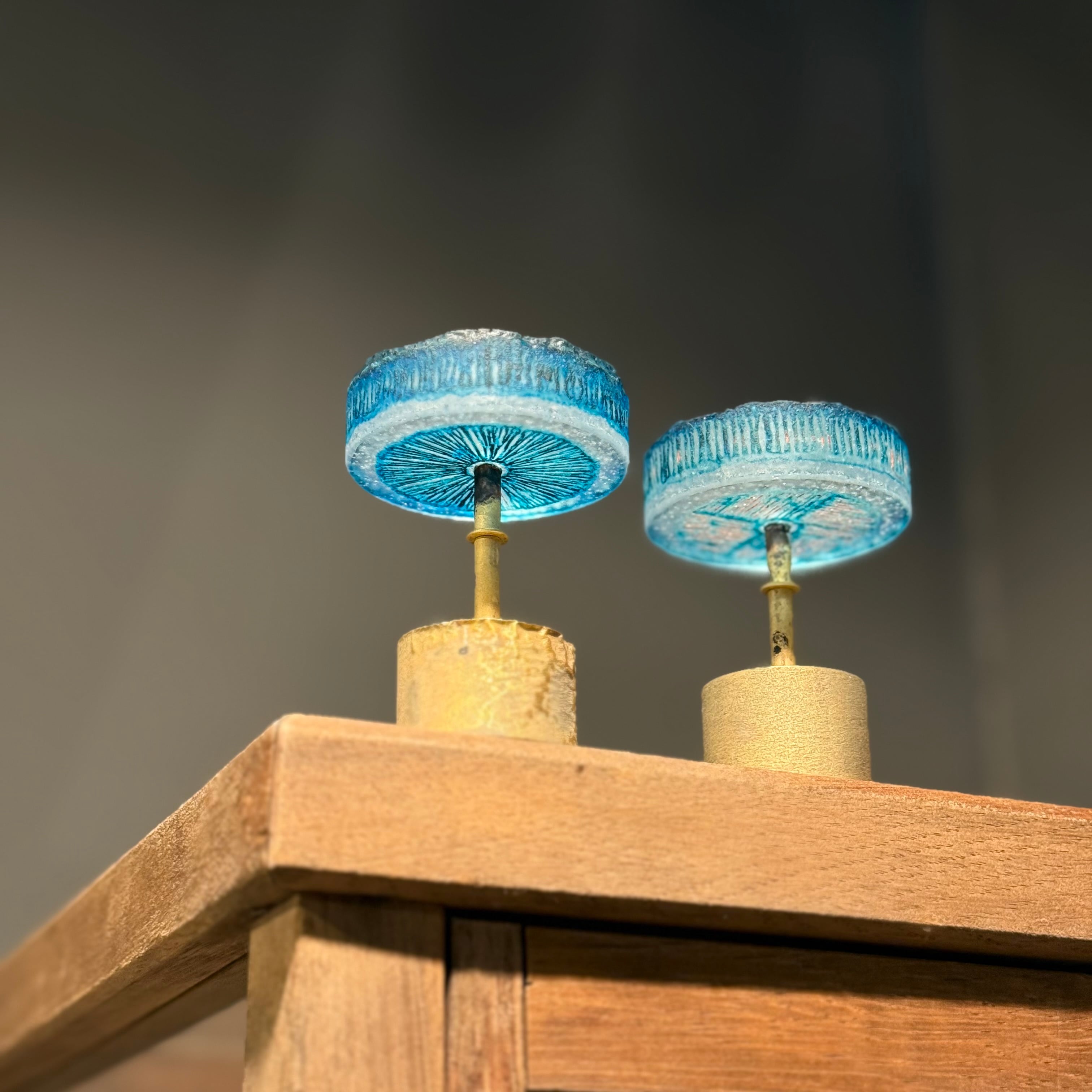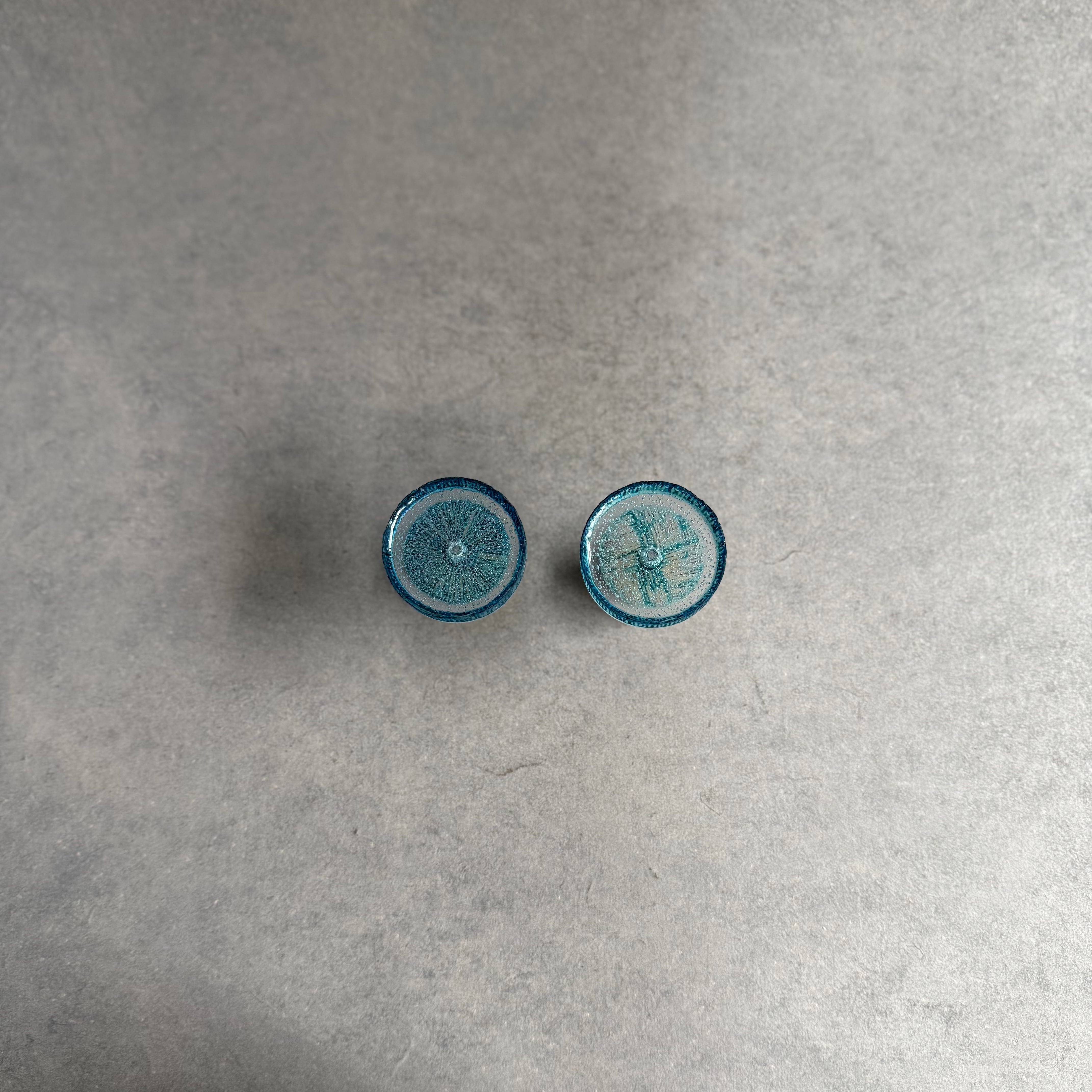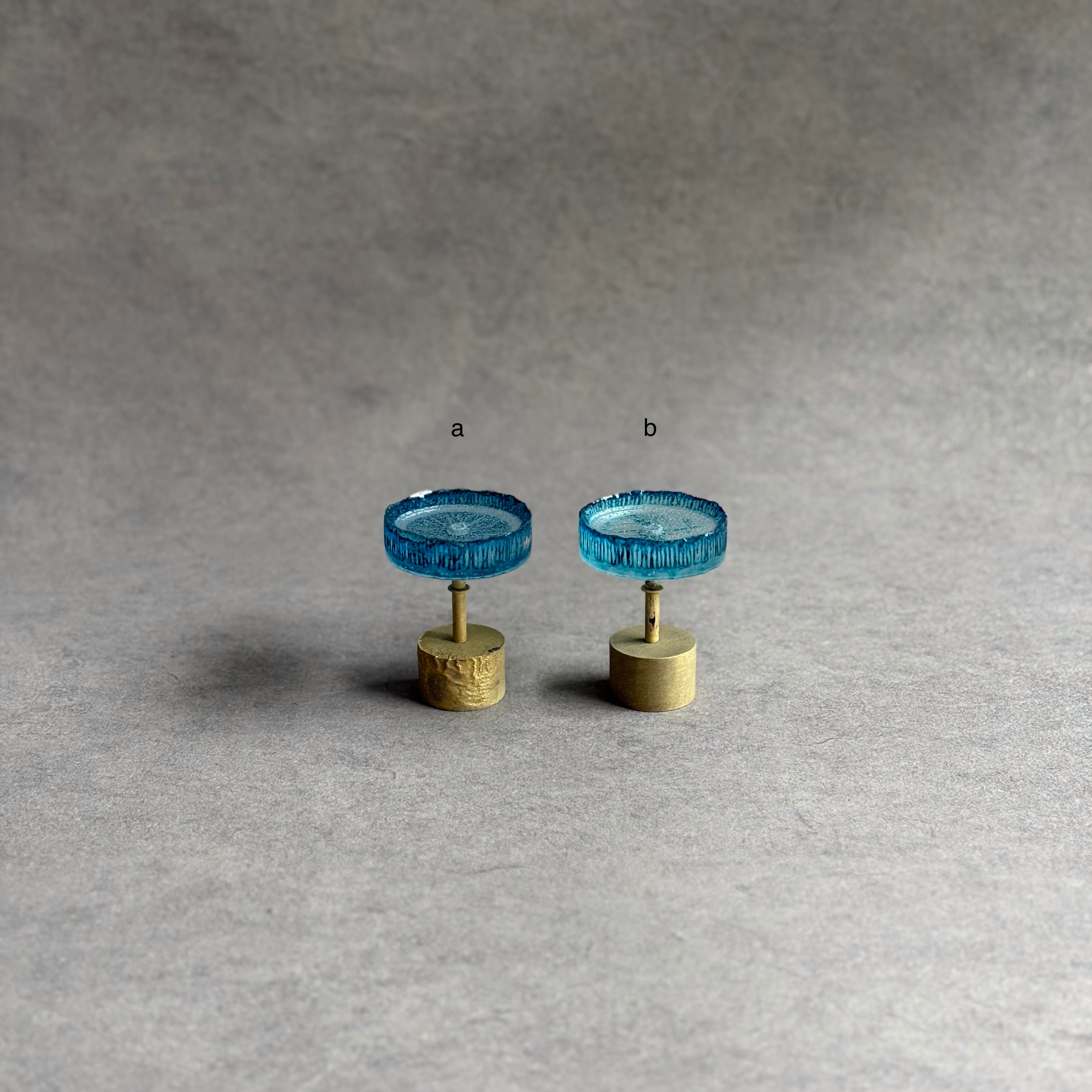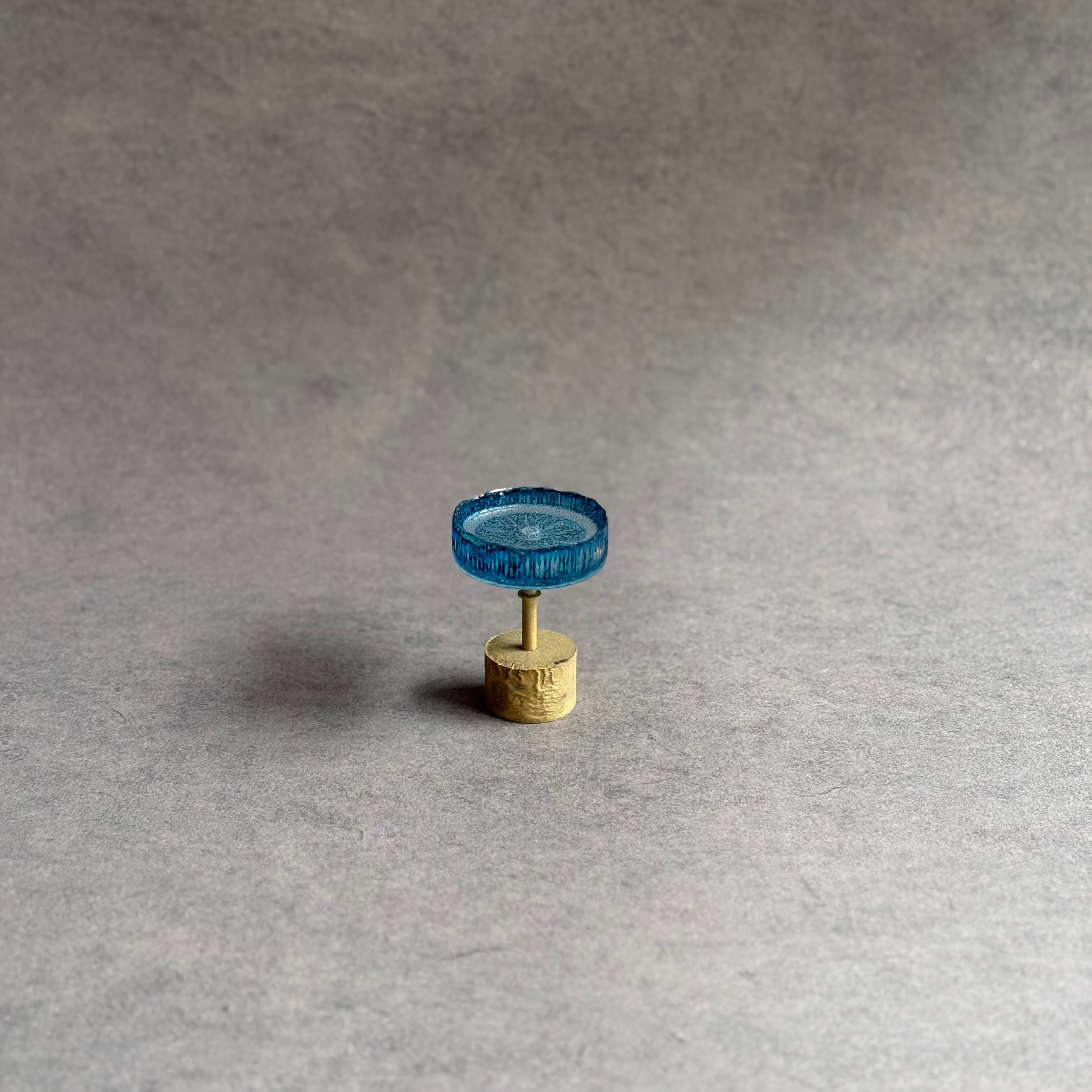 硝子と真鍮が電気炉の中で化学反応を起こし、美しい青色に変化する青のシリーズ。