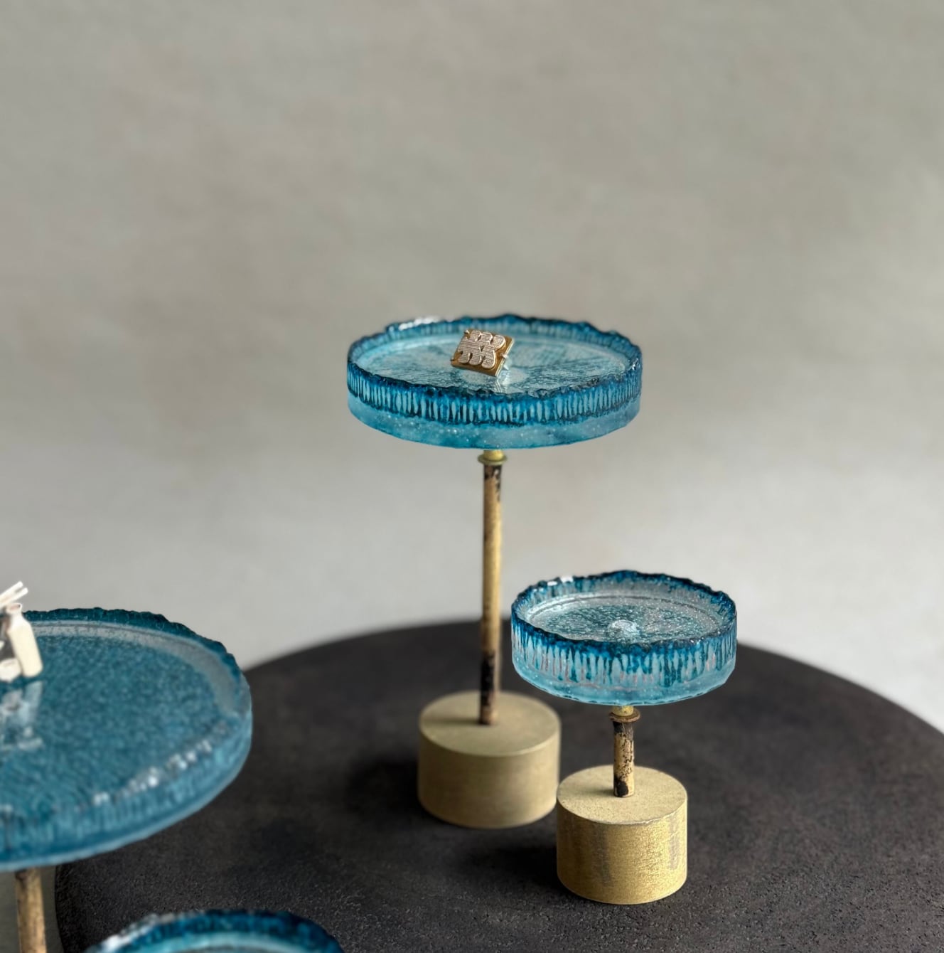 This is a series of blue plates in which glass and brass undergo a chemical reaction in an electric furnace, turning them into a beautiful blue color.