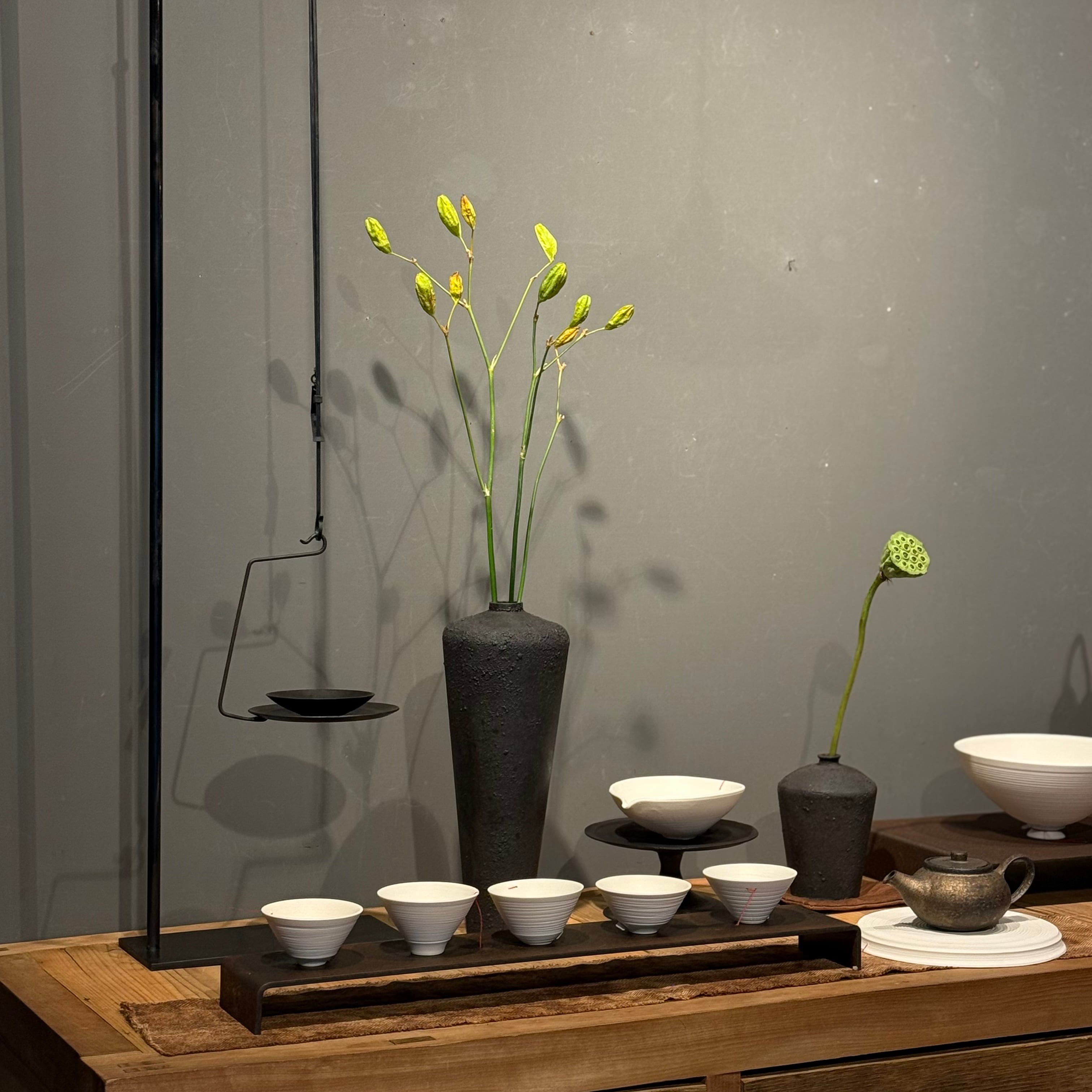 錆や蜜蝋を纏い静謐なる侘びの美を湛える大山求さんの鉄。無骨でありながらも時と共に変容するその表情は、沈黙のうちに語りかけるような金属の深い呼吸を感じさせます。