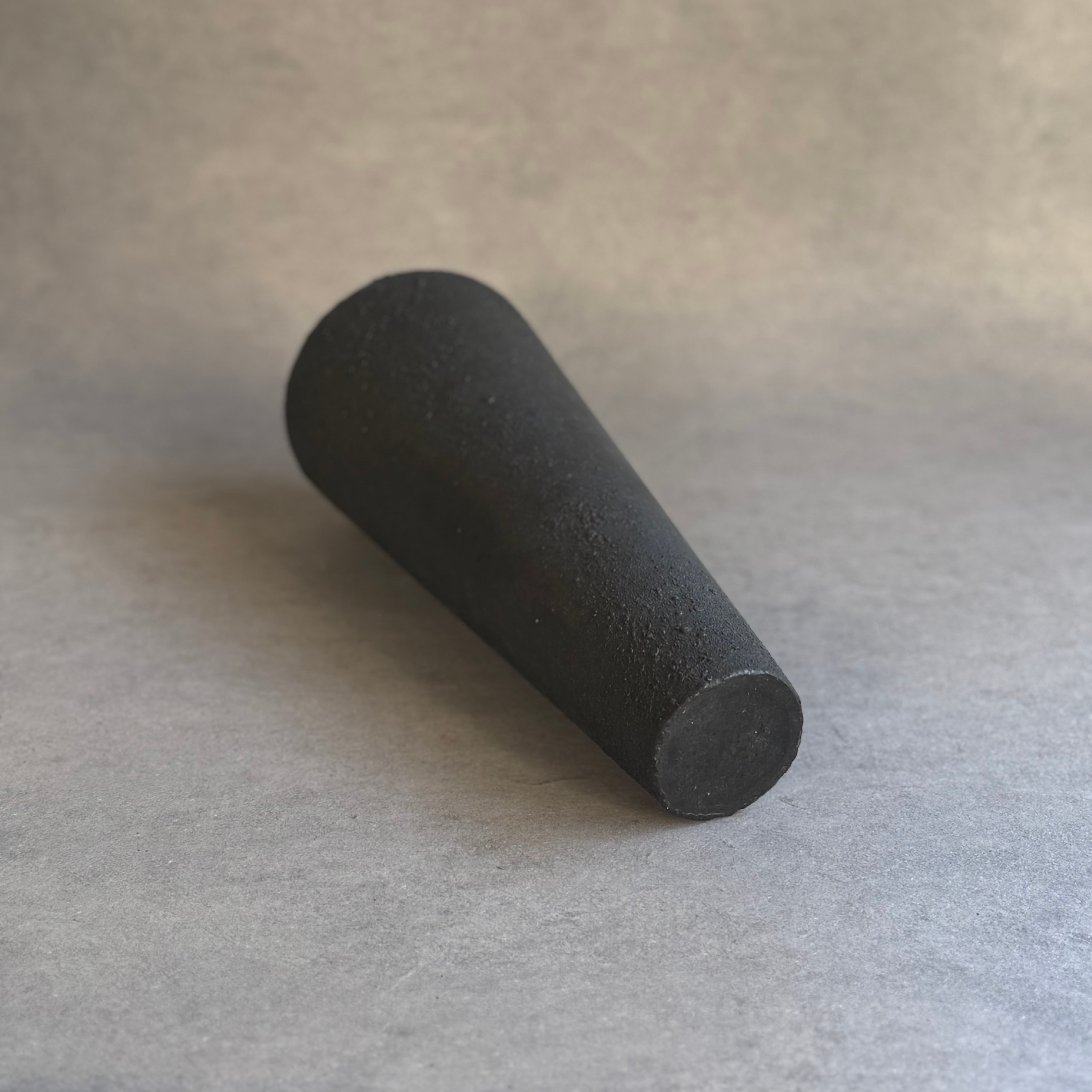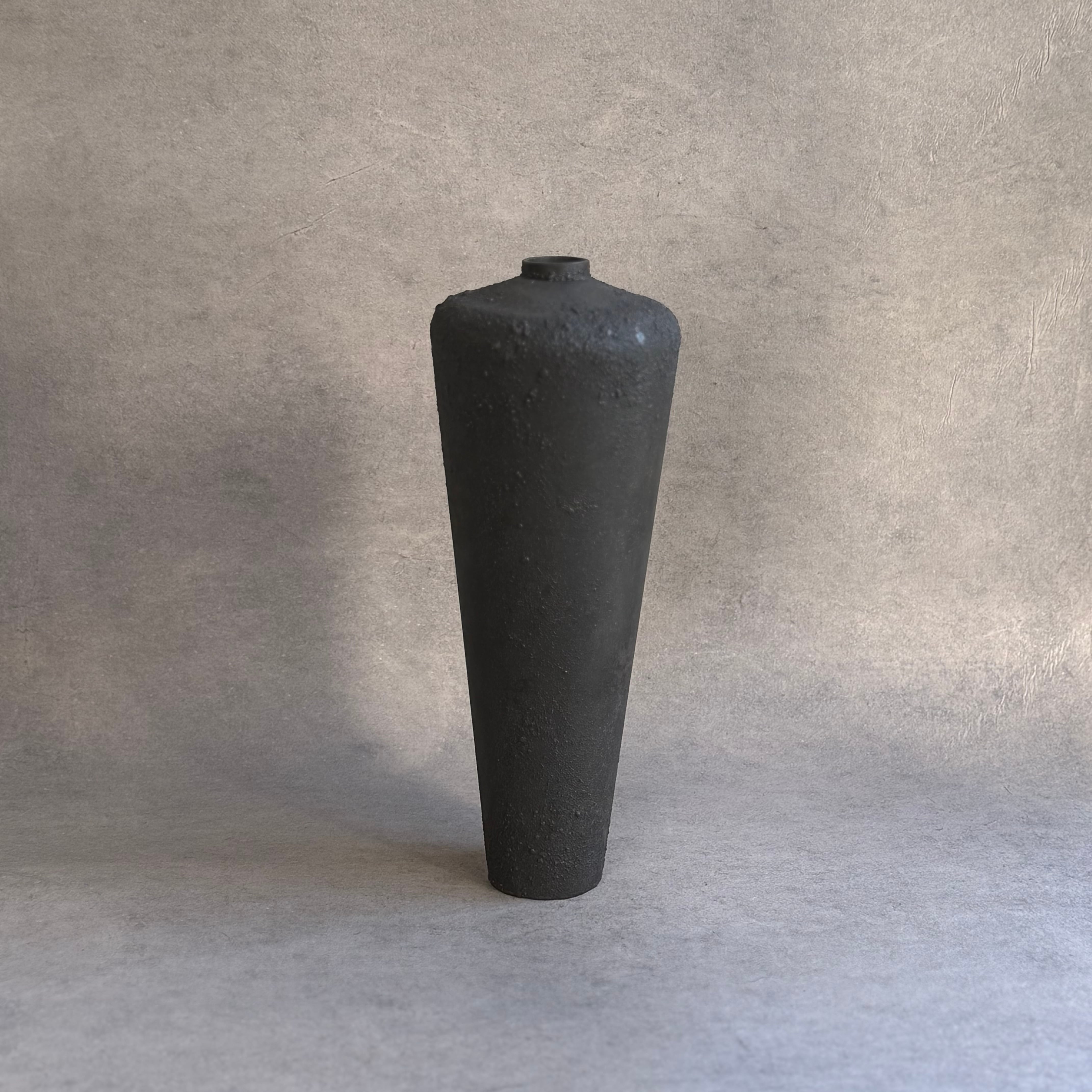 This flower vessel, with its richly textured black rust finish, has a striking presence even when simply displayed as an object.