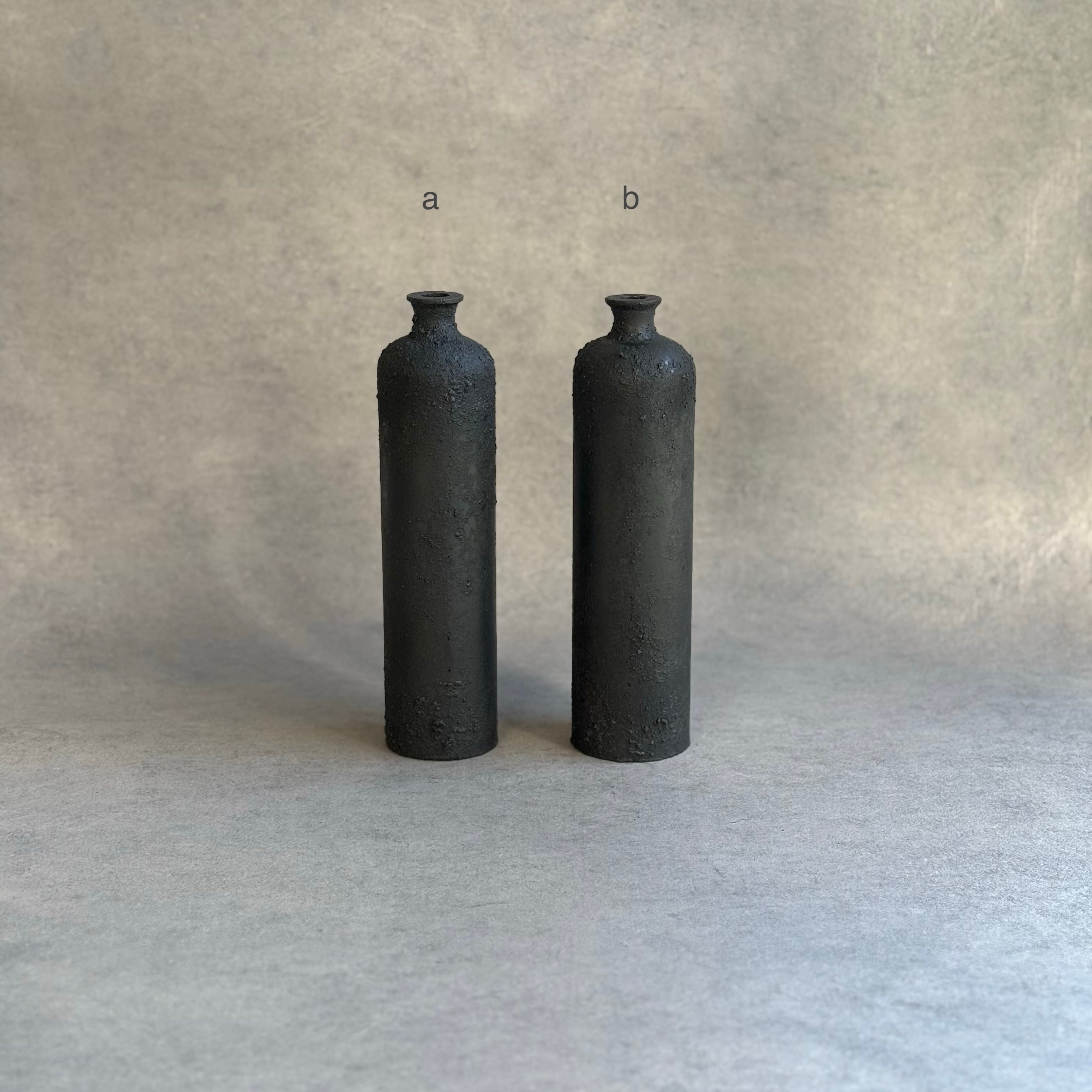 This flower vessel, with its richly textured black rust finish, has a striking presence even when simply displayed as an object.