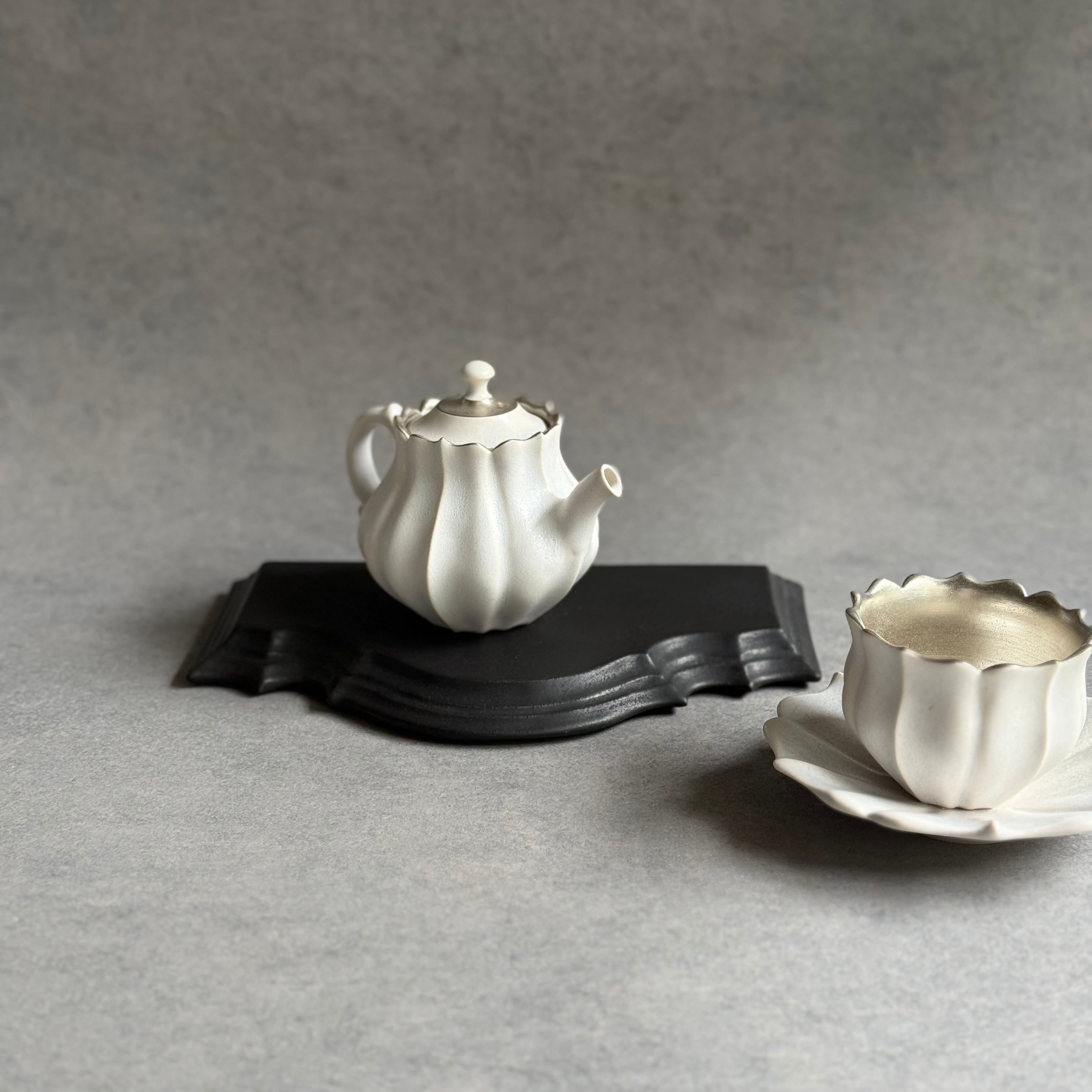 白と黒を基調としたマットな釉薬や華やかな銀彩が心躍るモダンな器は、設えに花を添え、おもてなしにも重宝します。彫刻のように深い陰陽が際立つ優雅なフォルム、可憐な植物を思わせる輪郭は美しさが際立ち、日常をよりエレガントに演出してくれる存在です。