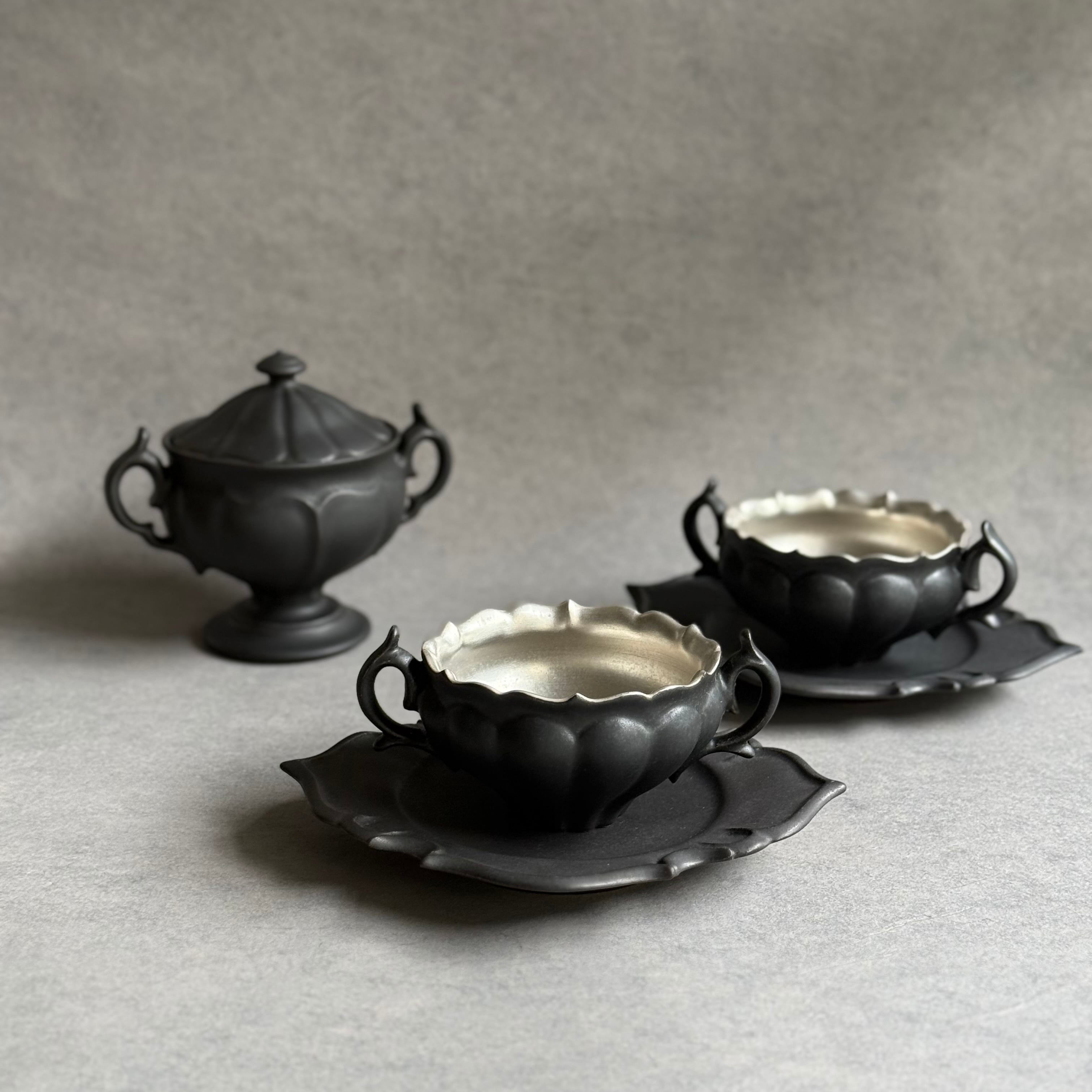 白と黒を基調としたマットな釉薬や華やかな銀彩が心躍るモダンな器は、設えに花を添え、おもてなしにも重宝します。彫刻のように深い陰陽が際立つ優雅なフォルム、可憐な植物を思わせる輪郭は美しさが際立ち、日常をよりエレガントに演出してくれる存在です。