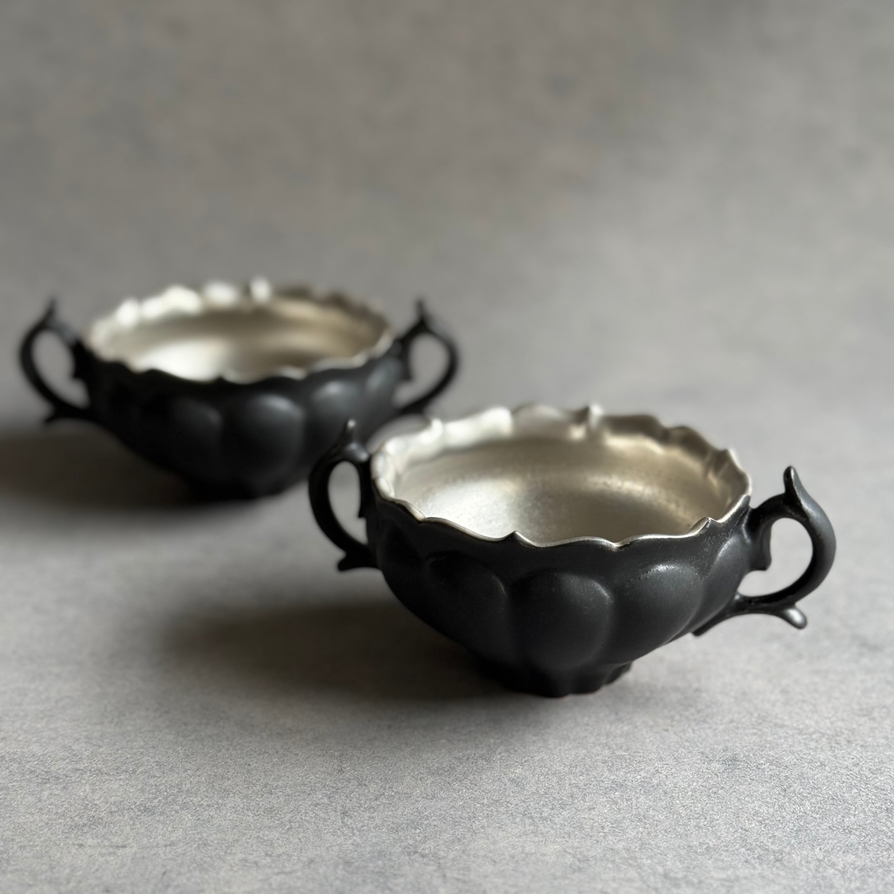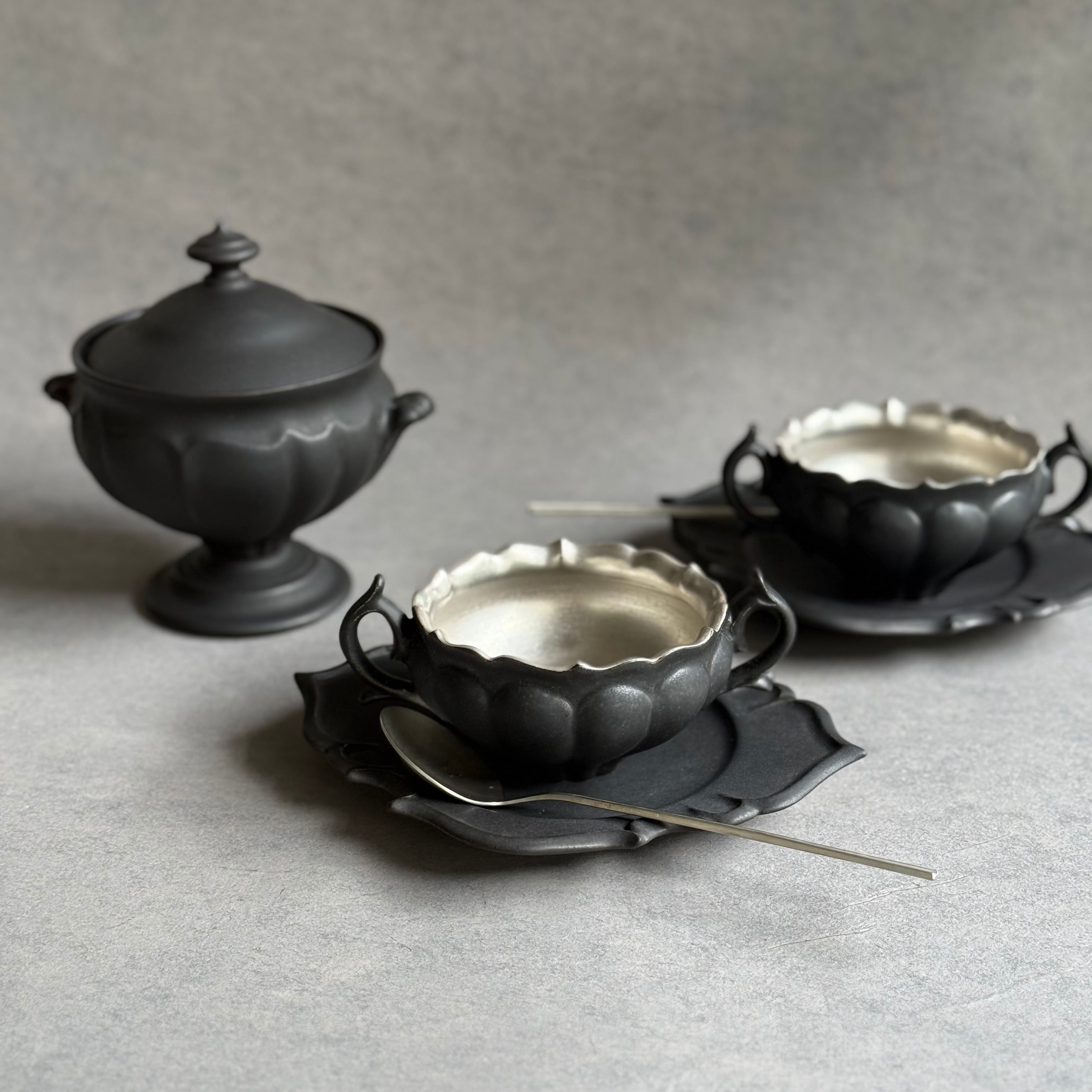 白と黒を基調としたマットな釉薬や華やかな銀彩が心躍るモダンな器は、設えに花を添え、おもてなしにも重宝します。彫刻のように深い陰陽が際立つ優雅なフォルム、可憐な植物を思わせる輪郭は美しさが際立ち、日常をよりエレガントに演出してくれる存在です。