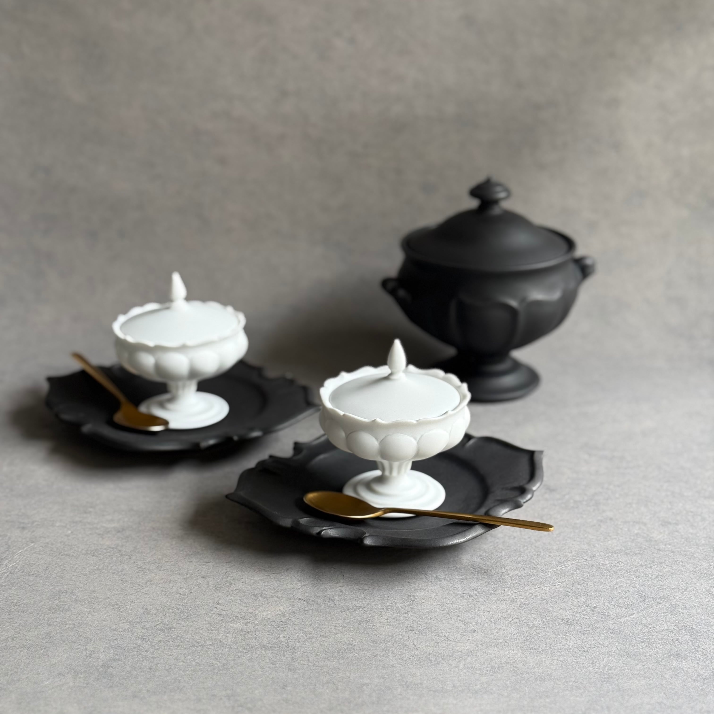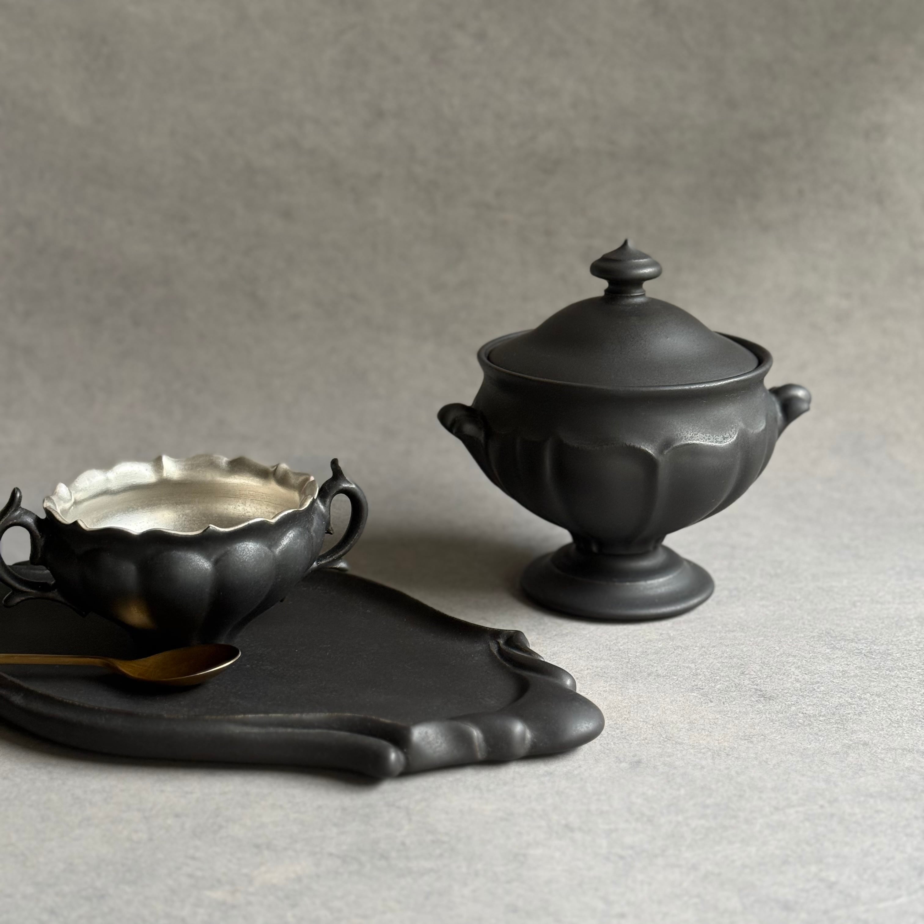 白と黒を基調としたマットな釉薬や華やかな銀彩が心躍るモダンな器は、設えに花を添え、おもてなしにも重宝します。彫刻のように深い陰陽が際立つ優雅なフォルム、可憐な植物を思わせる輪郭は美しさが際立ち、日常をよりエレガントに演出してくれる存在です。