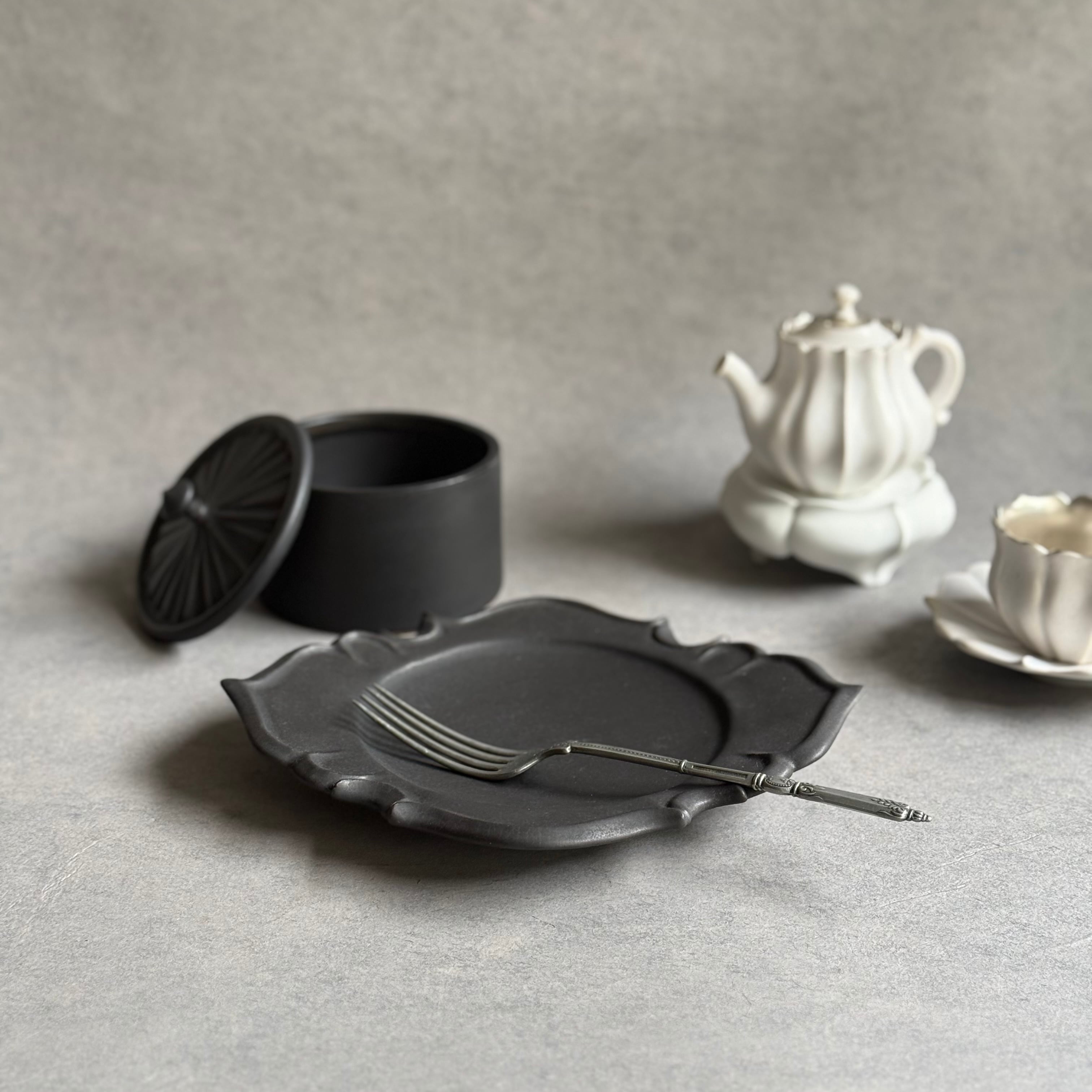 白と黒を基調としたマットな釉薬や華やかな銀彩が心躍るモダンな器は、設えに花を添え、おもてなしにも重宝します。彫刻のように深い陰陽が際立つ優雅なフォルム、可憐な植物を思わせる輪郭は美しさが際立ち、日常をよりエレガントに演出してくれる存在です。