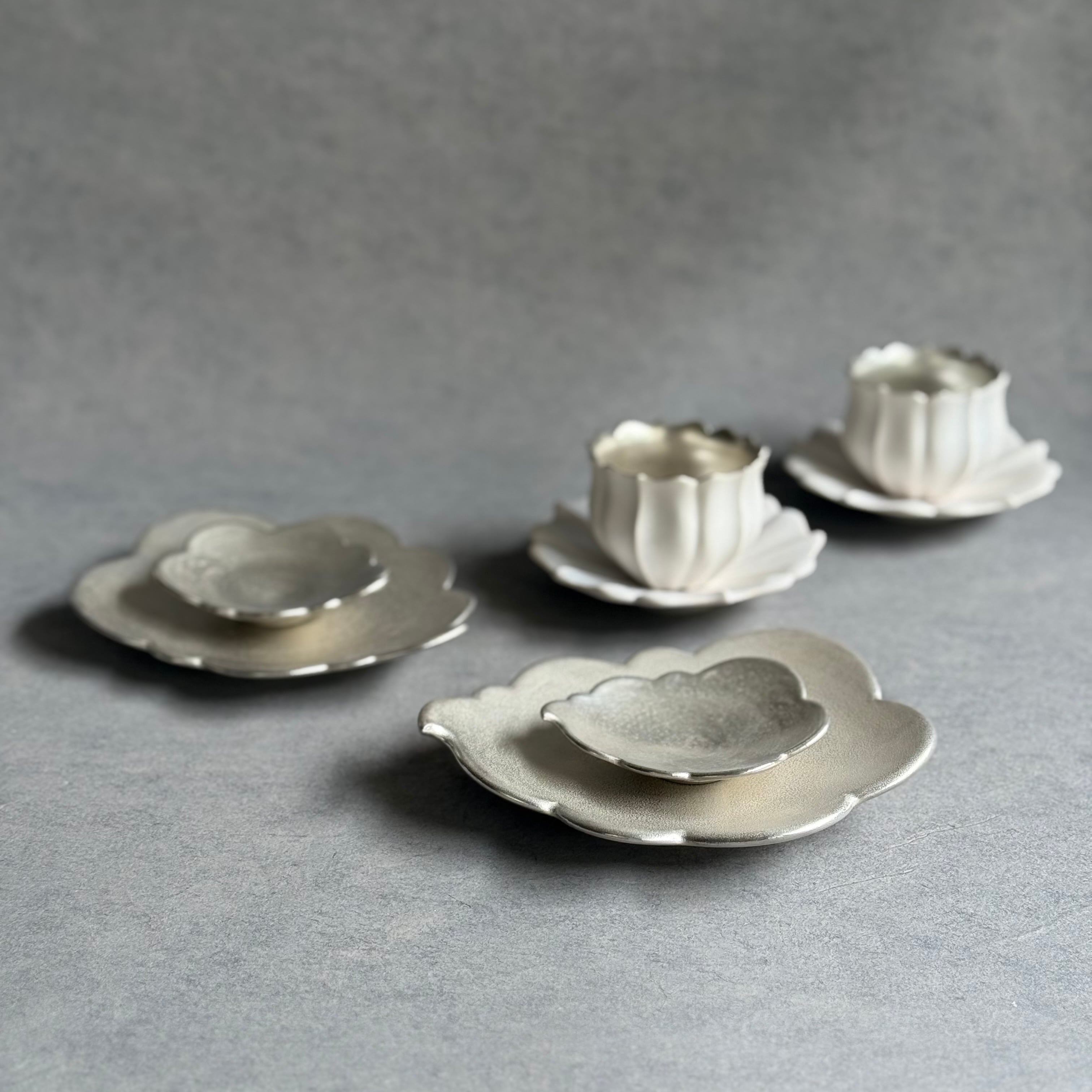 白と黒を基調としたマットな釉薬や華やかな銀彩が心躍るモダンな器は、設えに花を添え、おもてなしにも重宝します。彫刻のように深い陰陽が際立つ優雅なフォルム、可憐な植物を思わせる輪郭は美しさが際立ち、日常をよりエレガントに演出してくれる存在です。