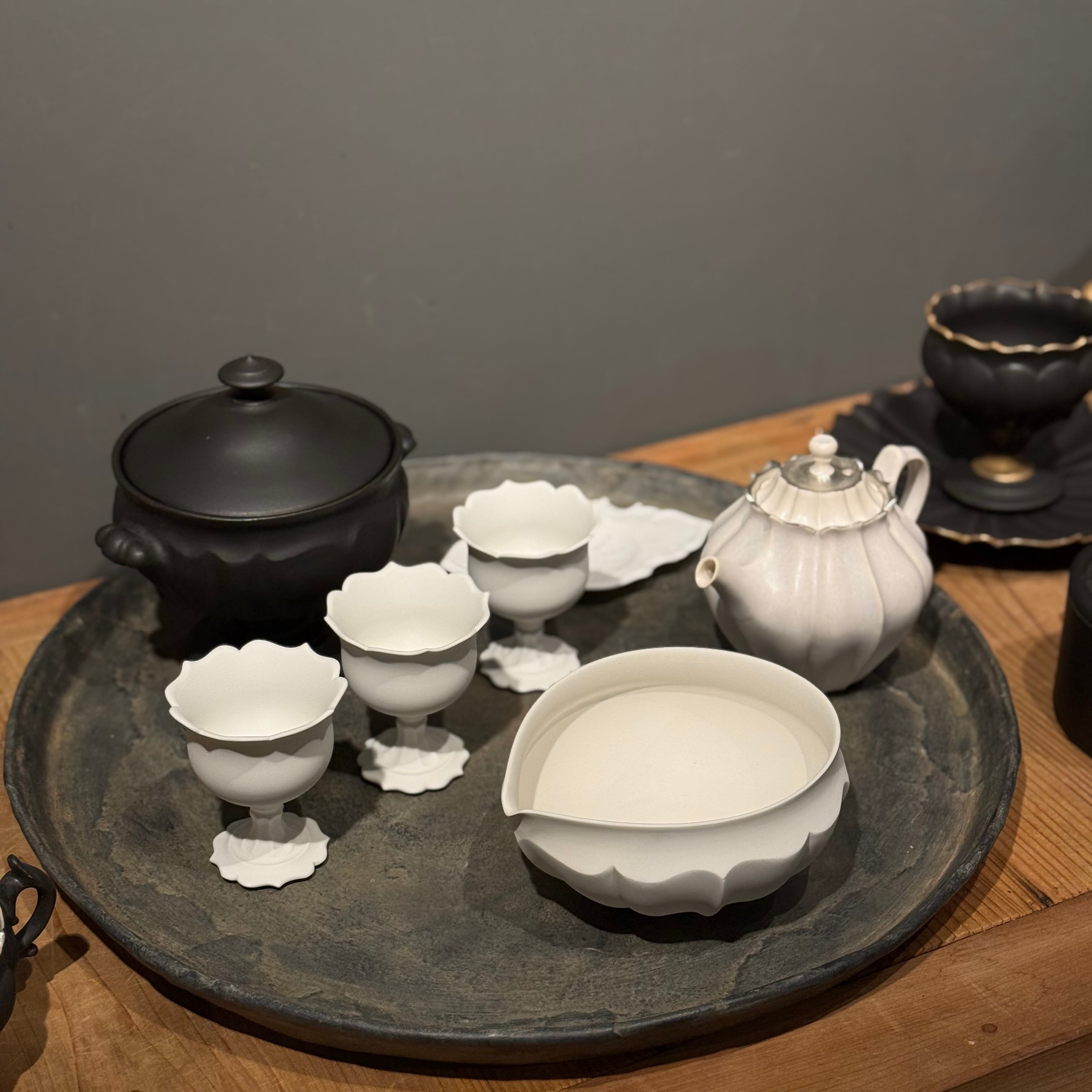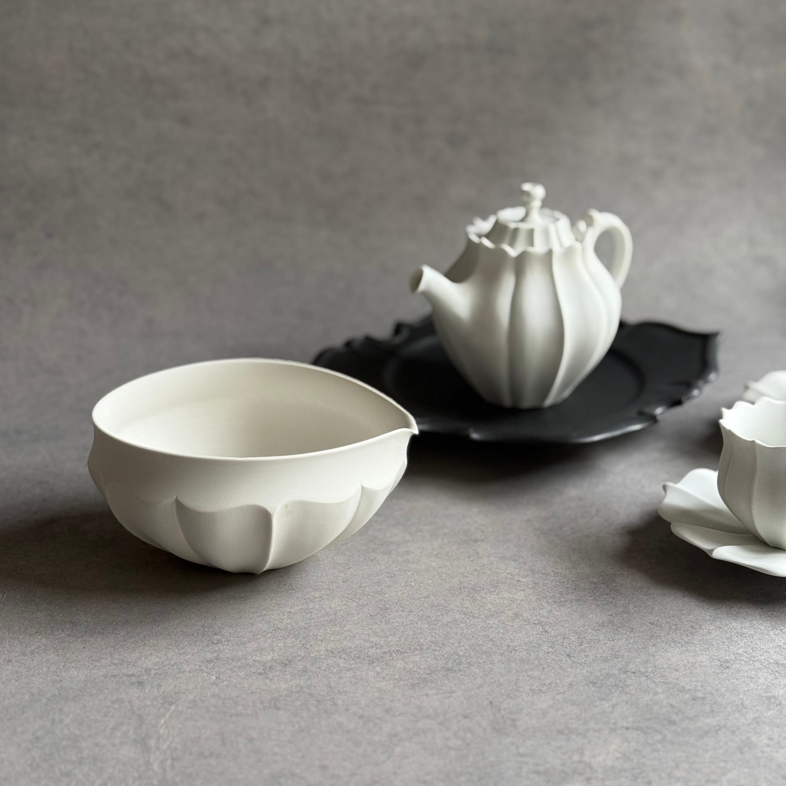 白と黒を基調としたマットな釉薬や華やかな銀彩が心躍るモダンな器は、設えに花を添え、おもてなしにも重宝します。彫刻のように深い陰陽が際立つ優雅なフォルム、可憐な植物を思わせる輪郭は美しさが際立ち、日常をよりエレガントに演出してくれる存在です。