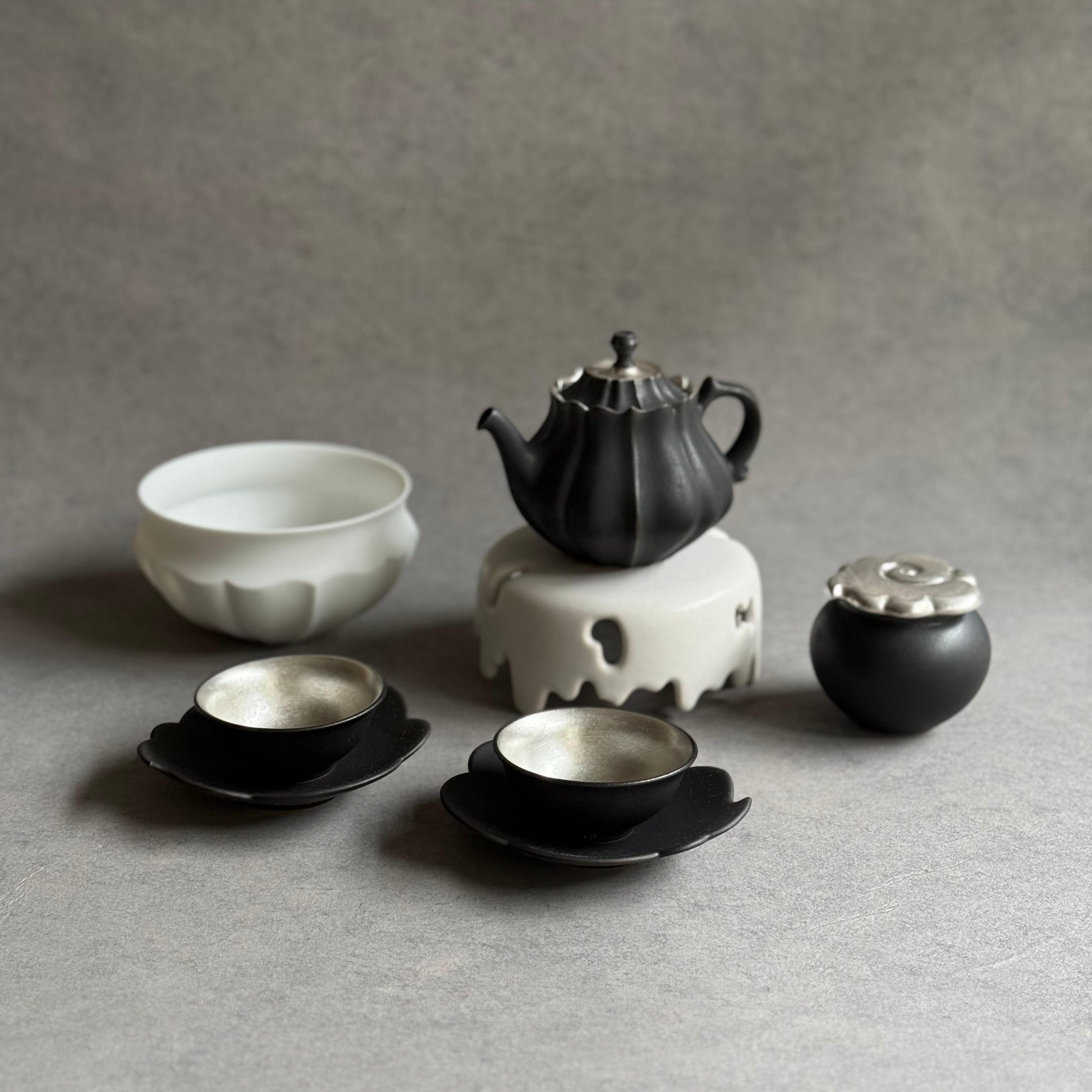 白と黒を基調としたマットな釉薬や華やかな銀彩が心躍るモダンな器は、設えに花を添え、おもてなしにも重宝します。彫刻のように深い陰陽が際立つ優雅なフォルム、可憐な植物を思わせる輪郭は美しさが際立ち、日常をよりエレガントに演出してくれる存在です。