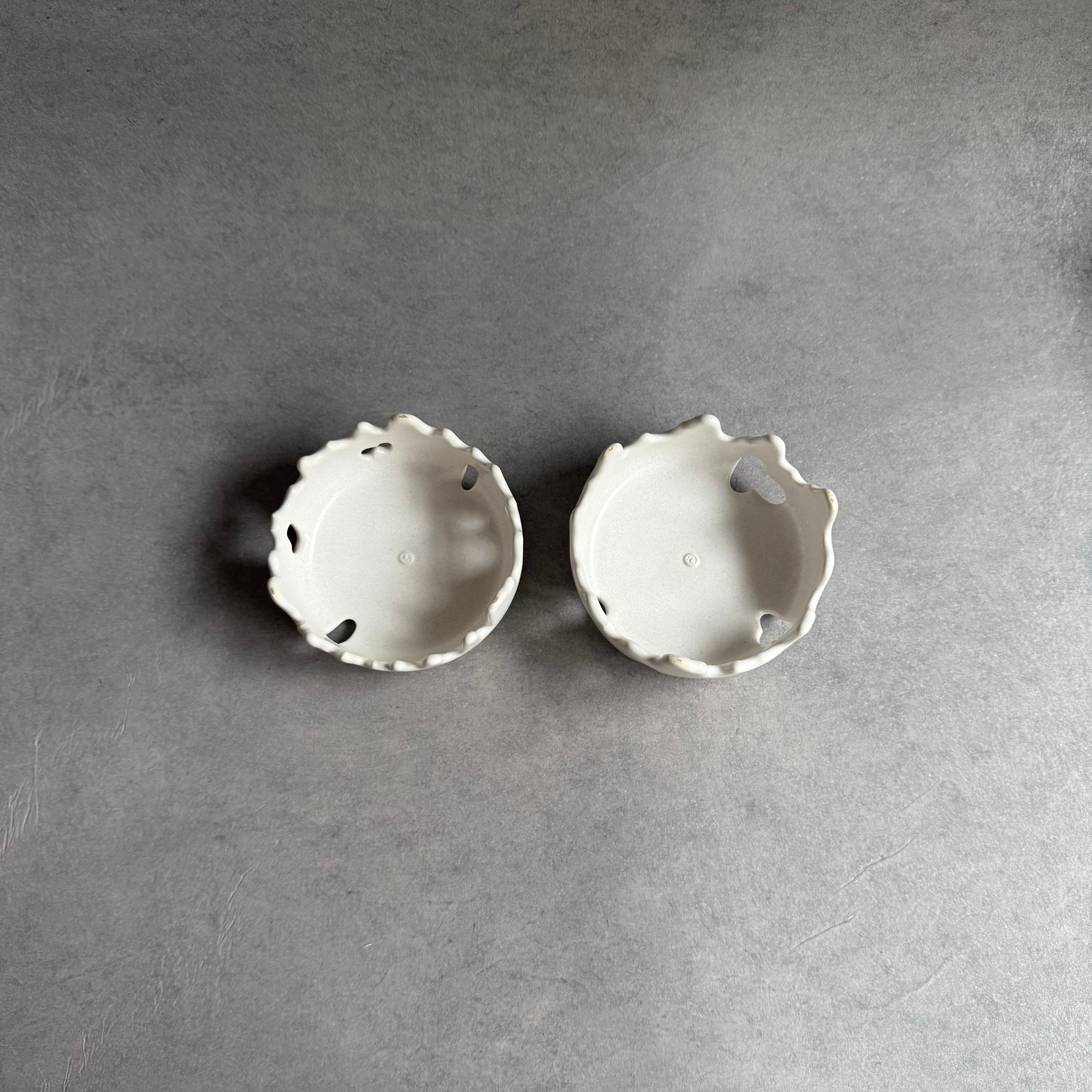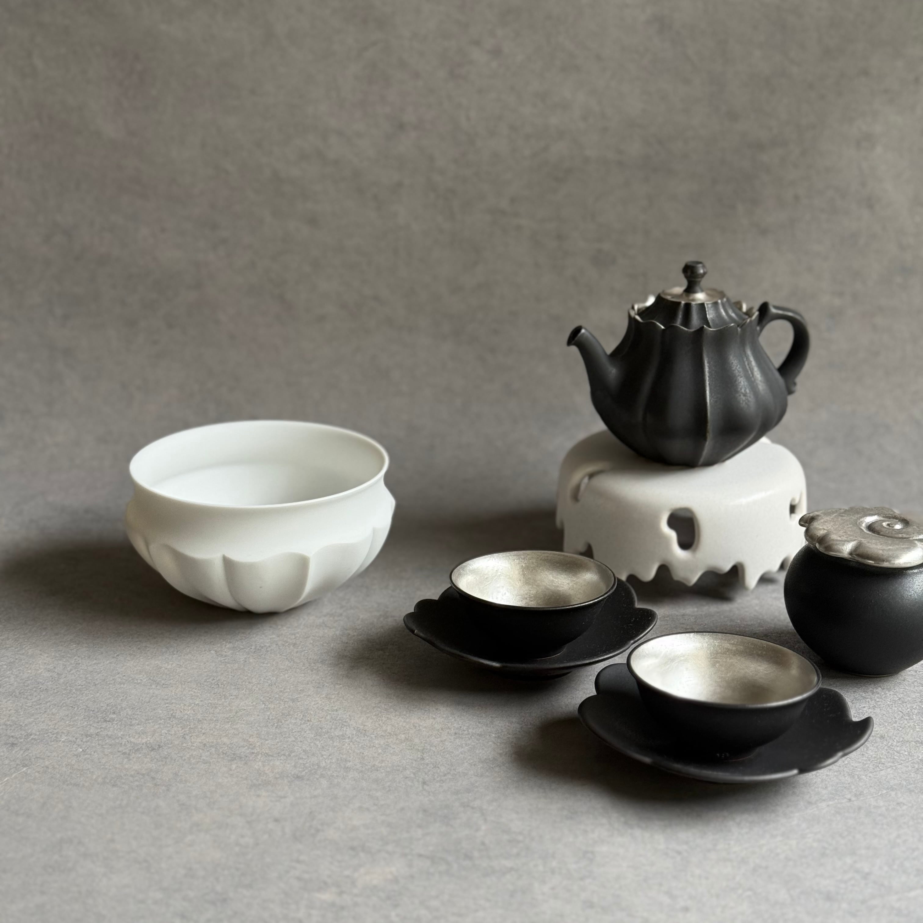 白と黒を基調としたマットな釉薬や華やかな銀彩が心躍るモダンな器は、設えに花を添え、おもてなしにも重宝します。彫刻のように深い陰陽が際立つ優雅なフォルム、可憐な植物を思わせる輪郭は美しさが際立ち、日常をよりエレガントに演出してくれる存在です。