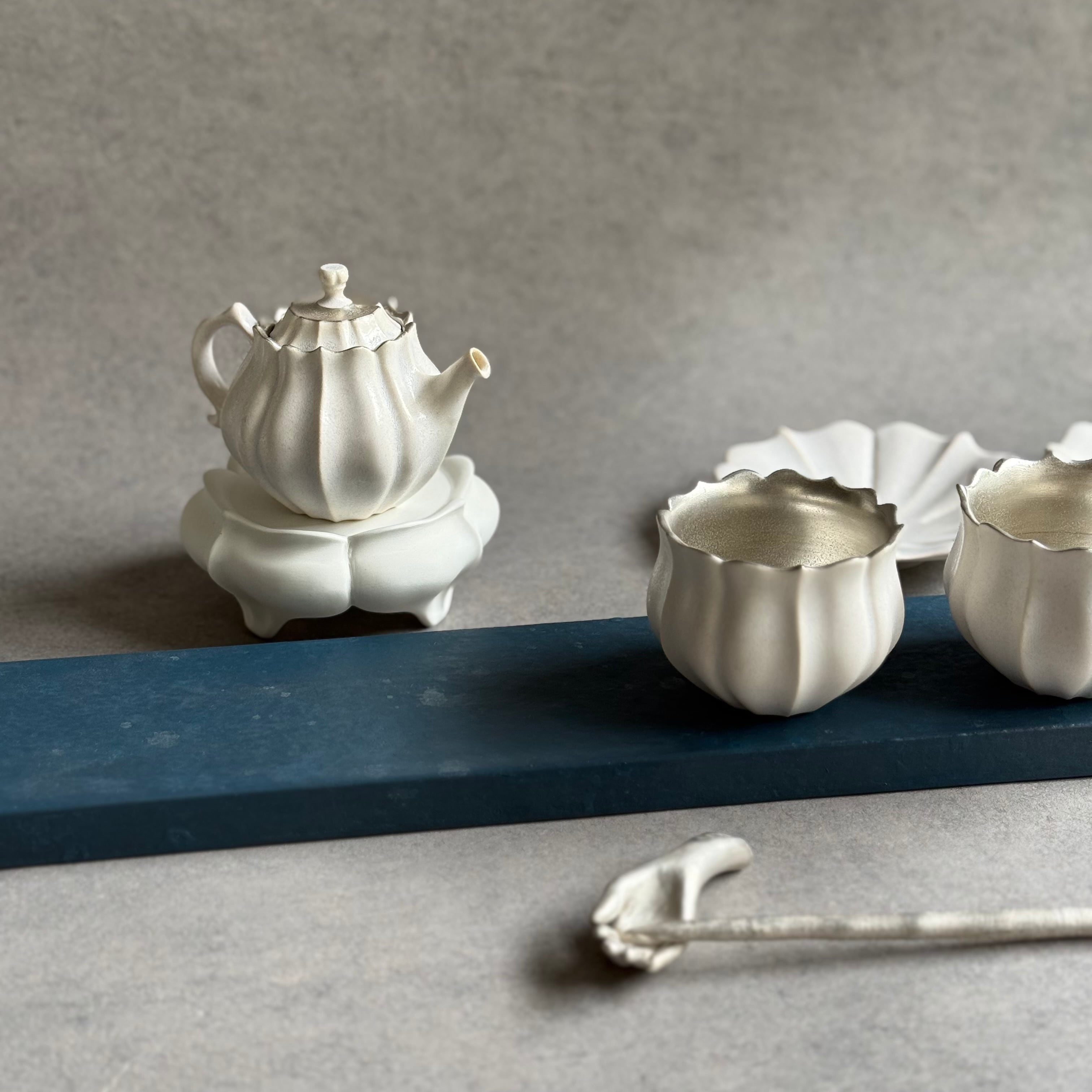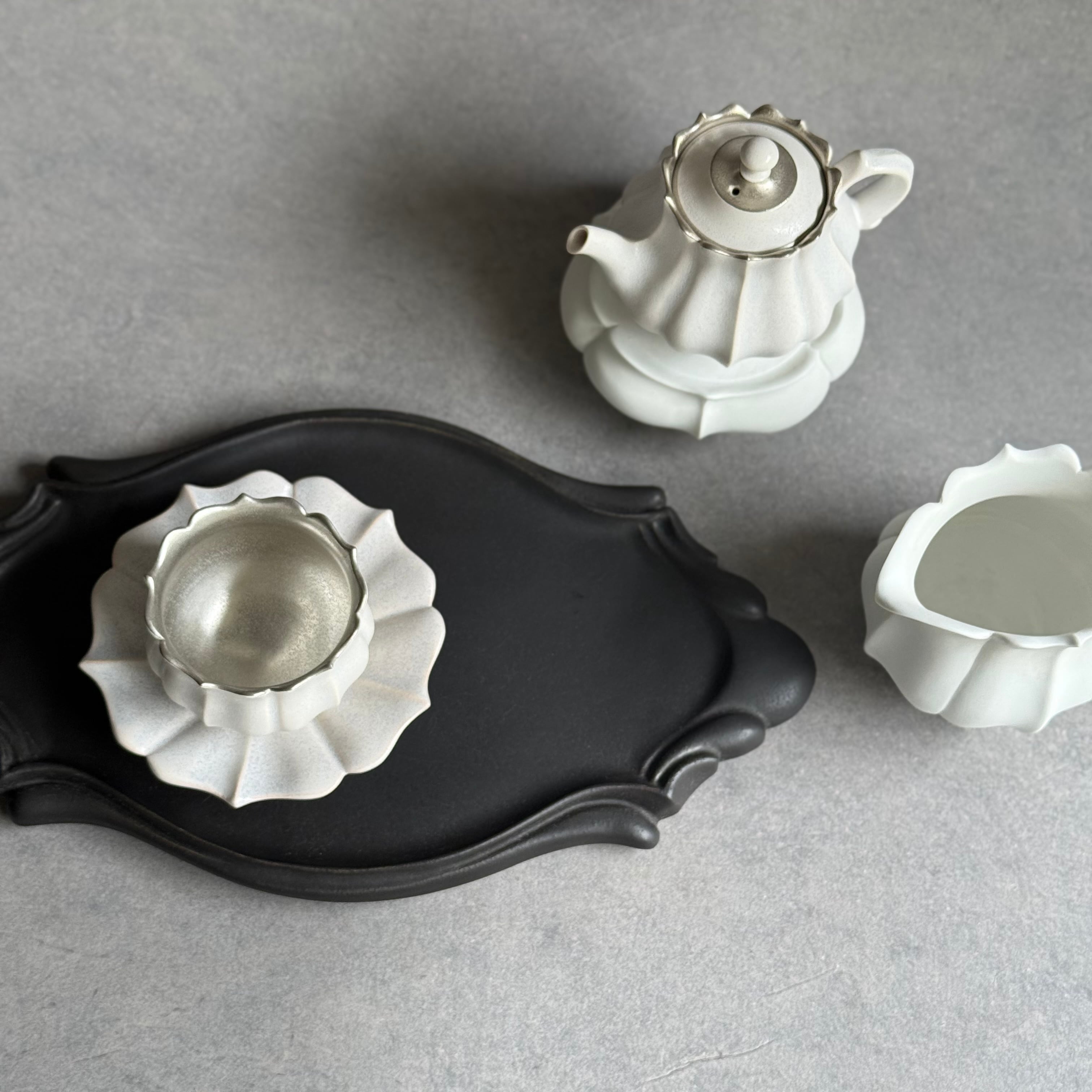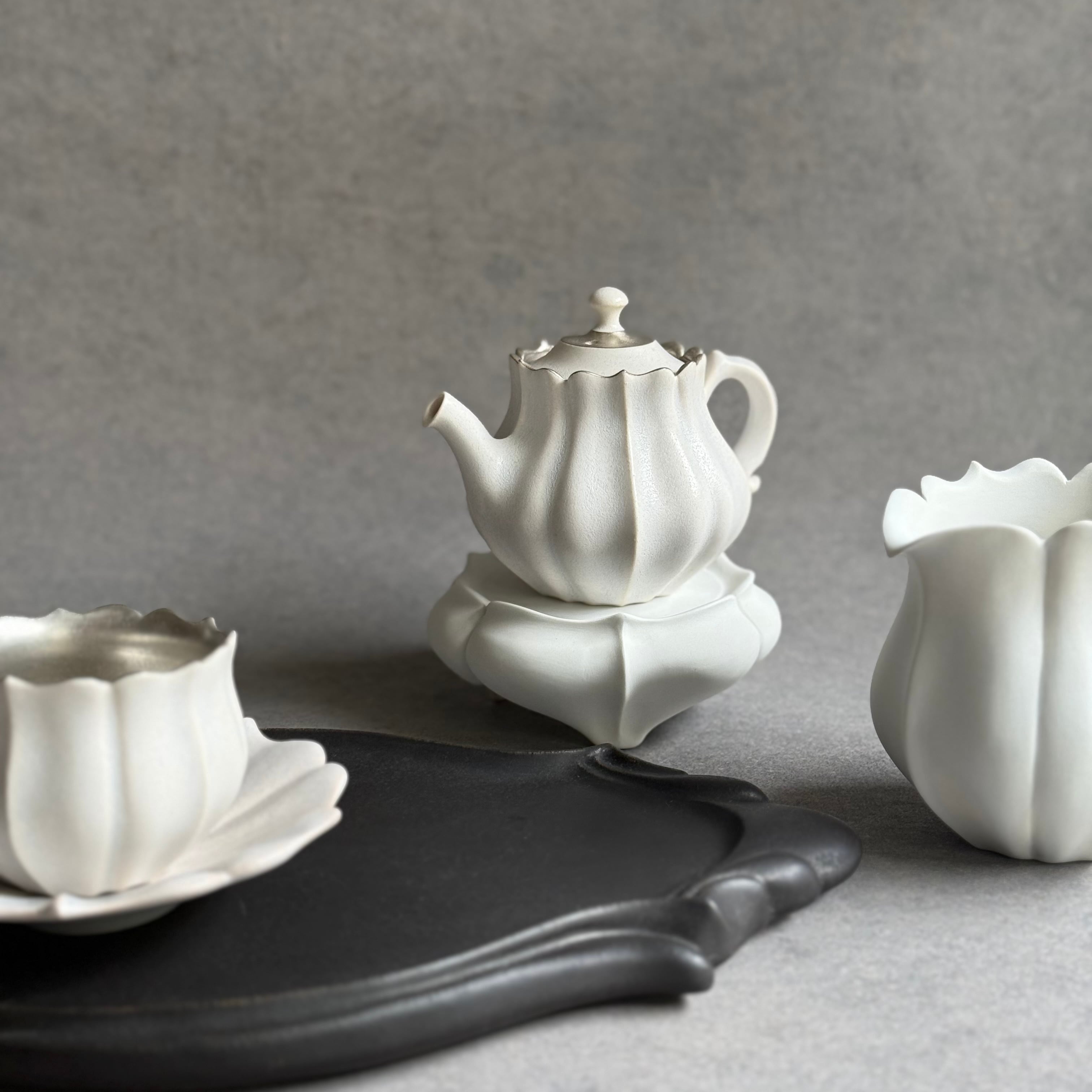 白と黒を基調としたマットな釉薬や華やかな銀彩が心躍るモダンな器は、設えに花を添え、おもてなしにも重宝します。彫刻のように深い陰陽が際立つ優雅なフォルム、可憐な植物を思わせる輪郭は美しさが際立ち、日常をよりエレガントに演出してくれる存在です。