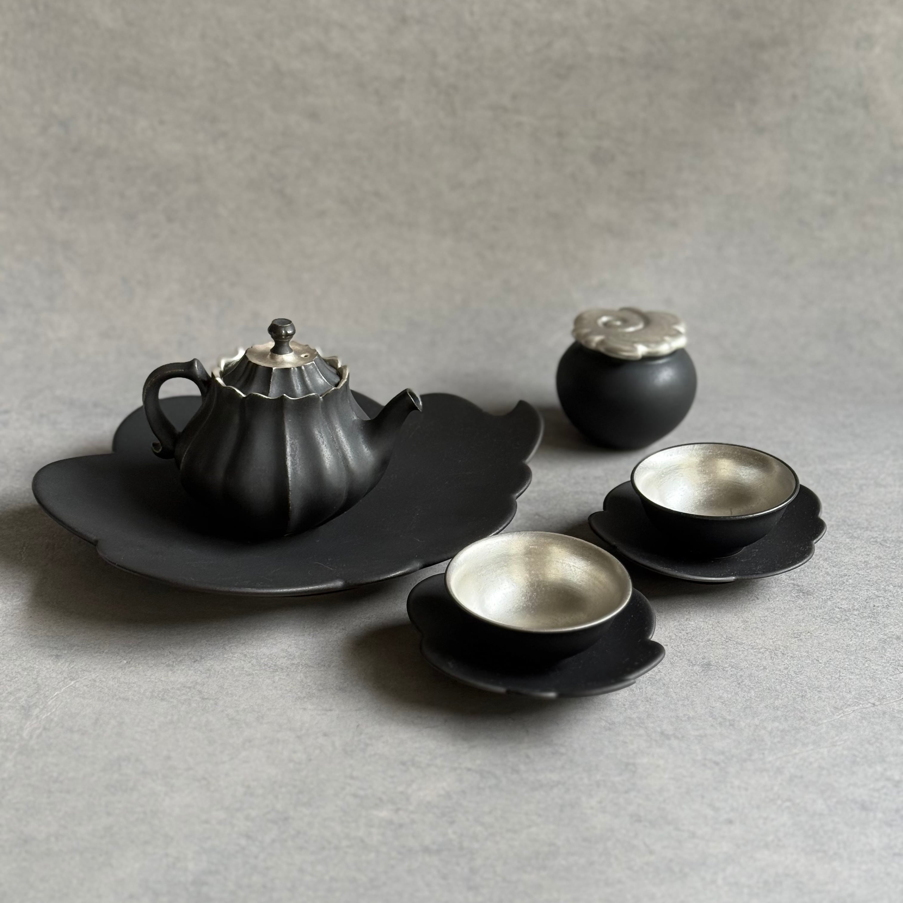 白と黒を基調としたマットな釉薬や華やかな銀彩が心躍るモダンな器は、設えに花を添え、おもてなしにも重宝します。彫刻のように深い陰陽が際立つ優雅なフォルム、可憐な植物を思わせる輪郭は美しさが際立ち、日常をよりエレガントに演出してくれる存在です。