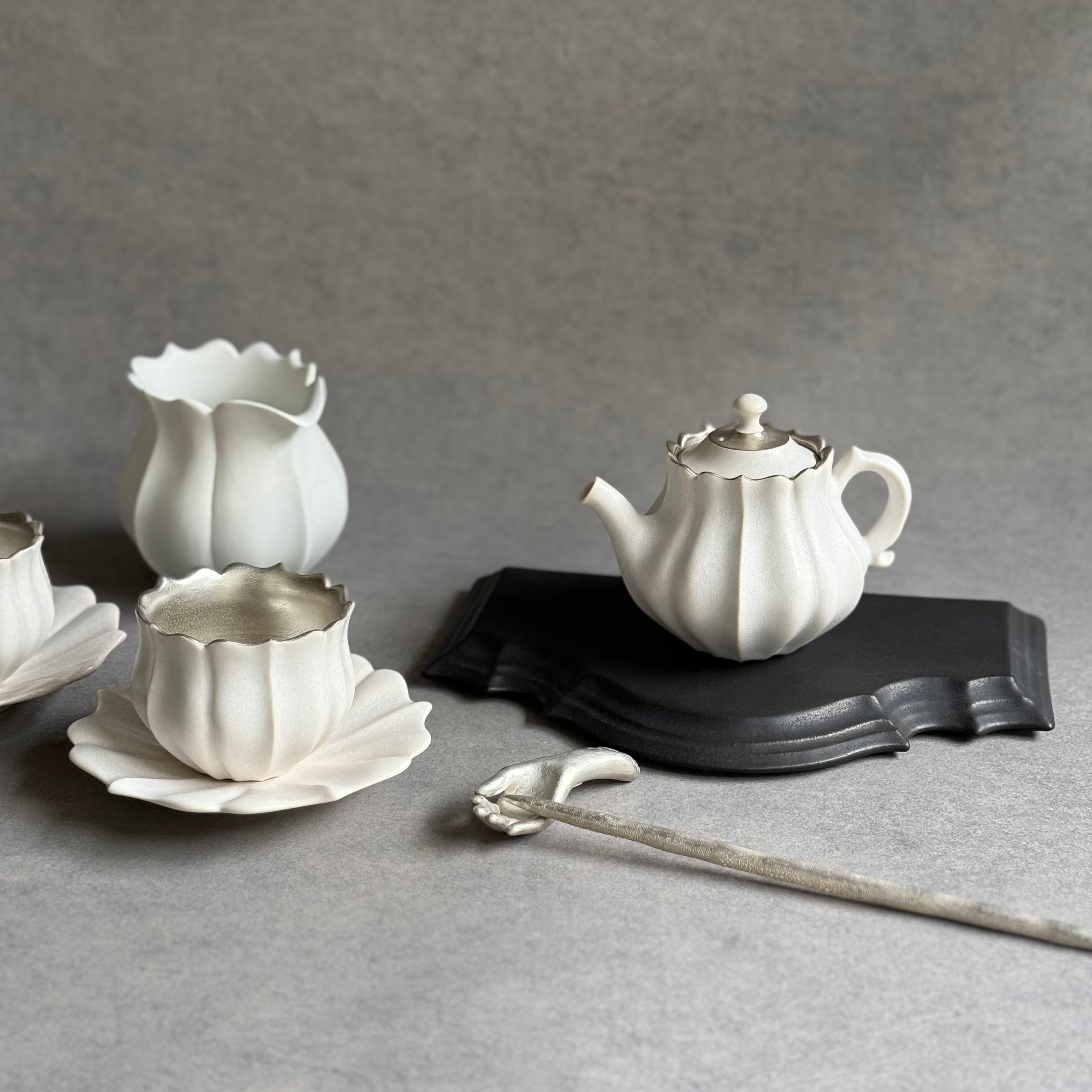 白と黒を基調としたマットな釉薬や華やかな銀彩が心躍るモダンな器は、設えに花を添え、おもてなしにも重宝します。彫刻のように深い陰陽が際立つ優雅なフォルム、可憐な植物を思わせる輪郭は美しさが際立ち、日常をよりエレガントに演出してくれる存在です。