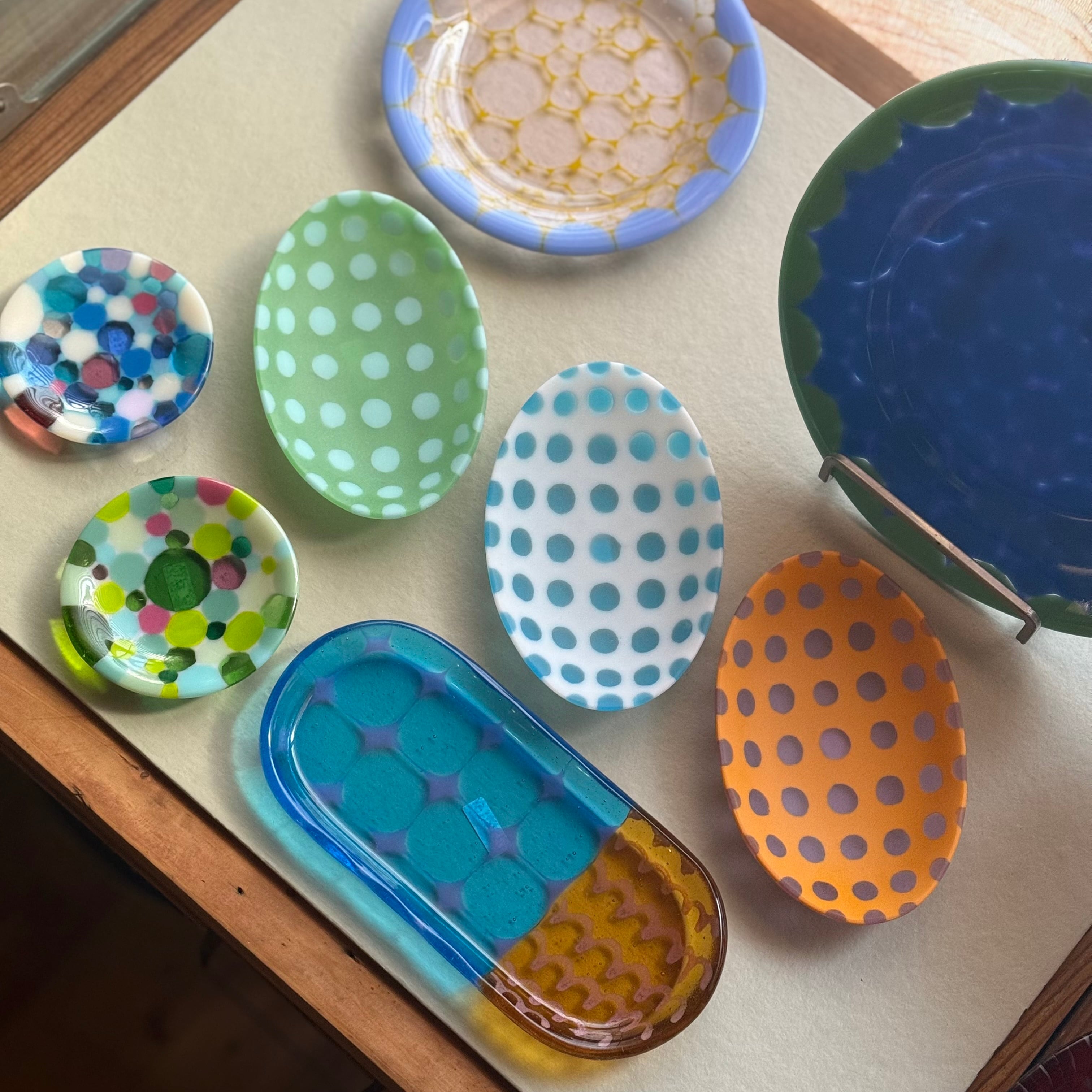 板ガラスを溶着させるフュージングとサンドブラストという技法を使ってガラス作品を制作されている田子美紀さん。ひときわ鮮やかでカラフルな色合わせが目を惹く器は乙女心がくすぐられます。日常に彩りを添えてくれる心に響く作品をお楽しみください。