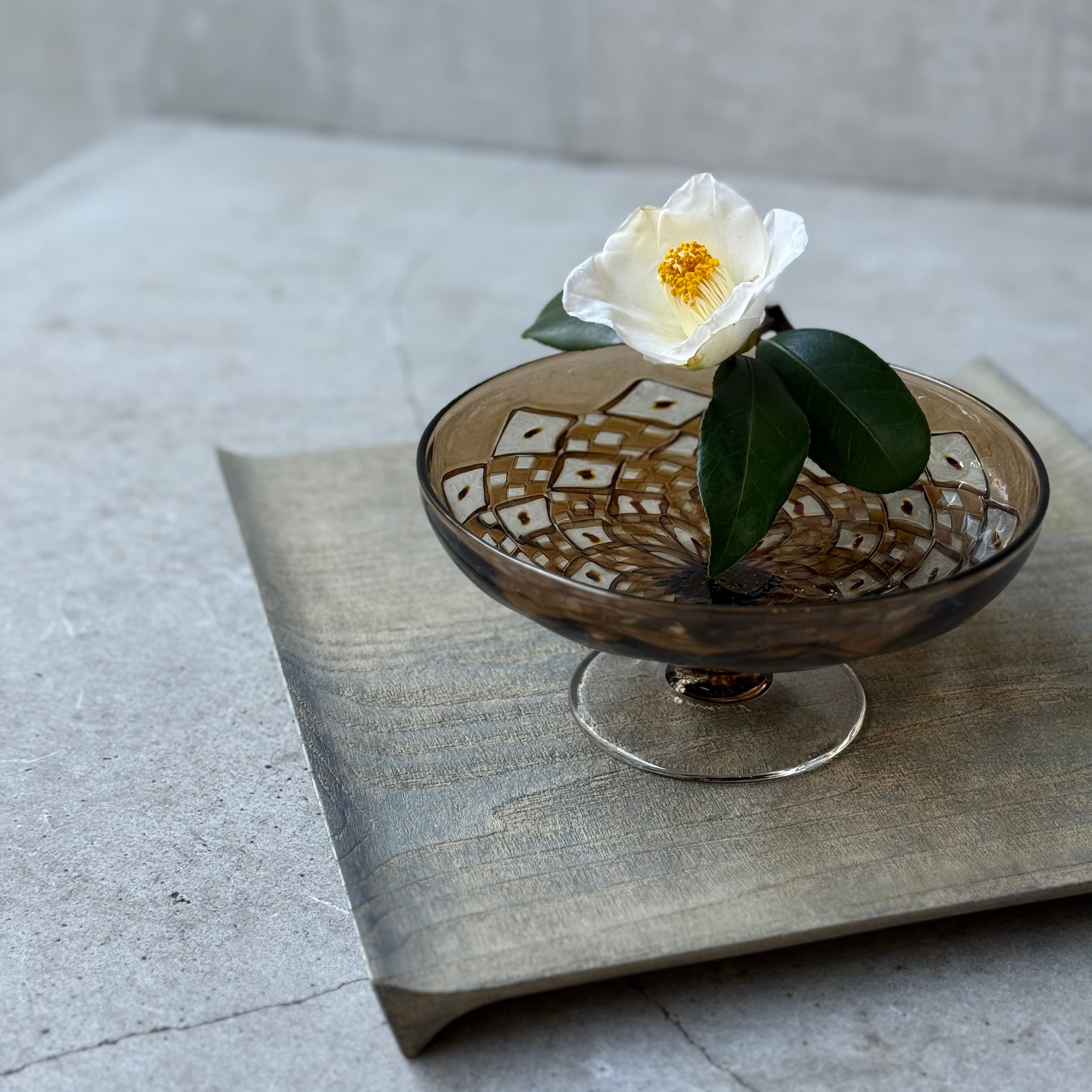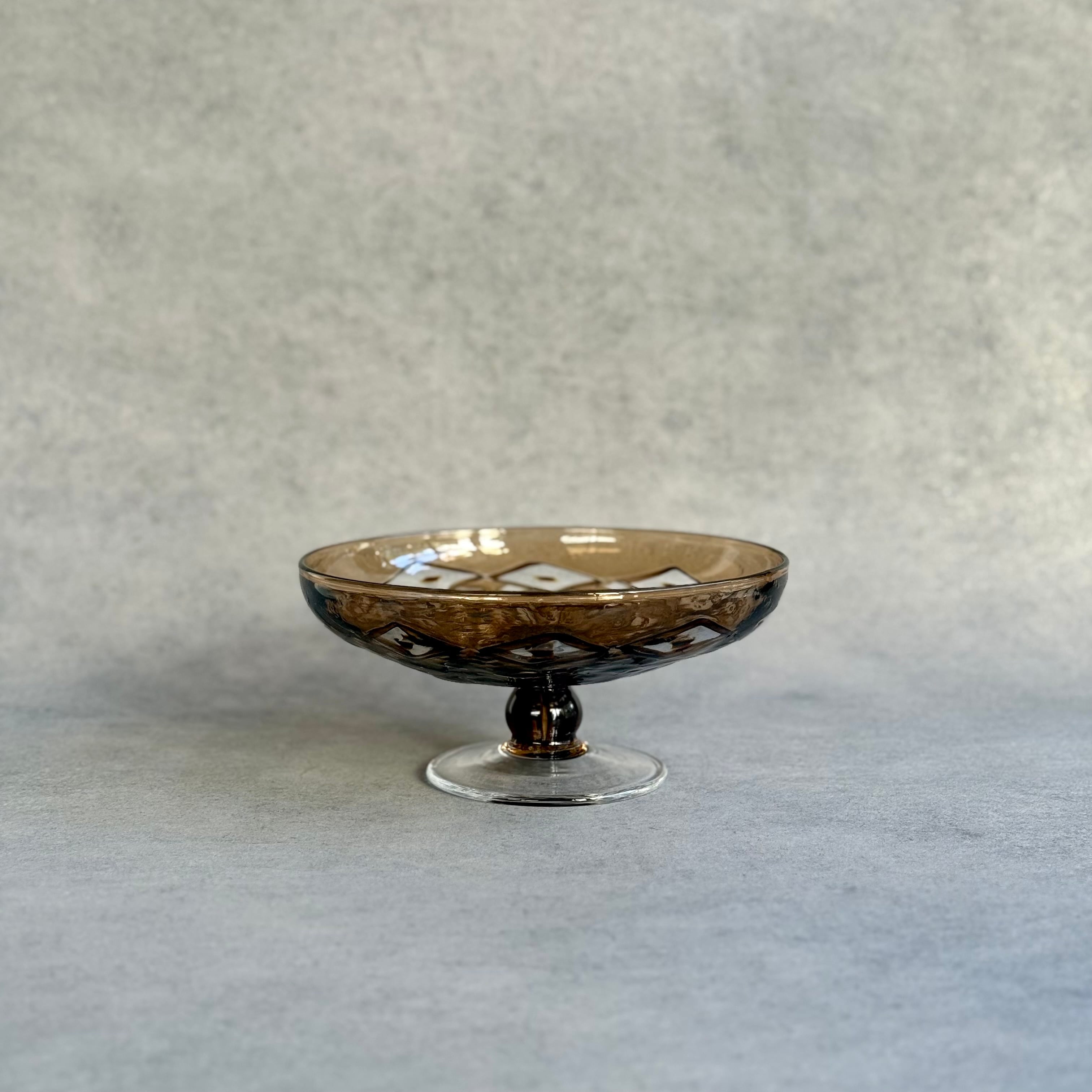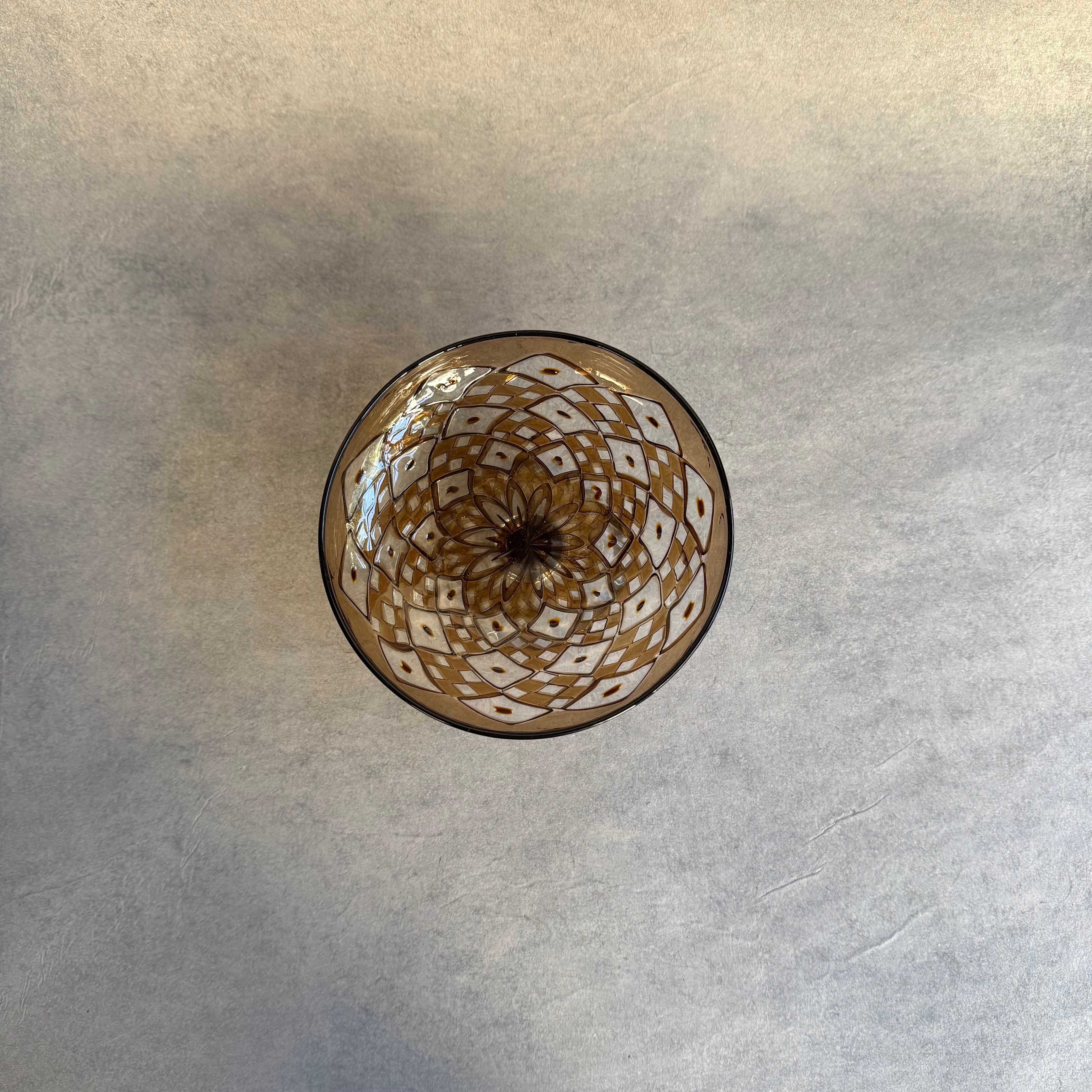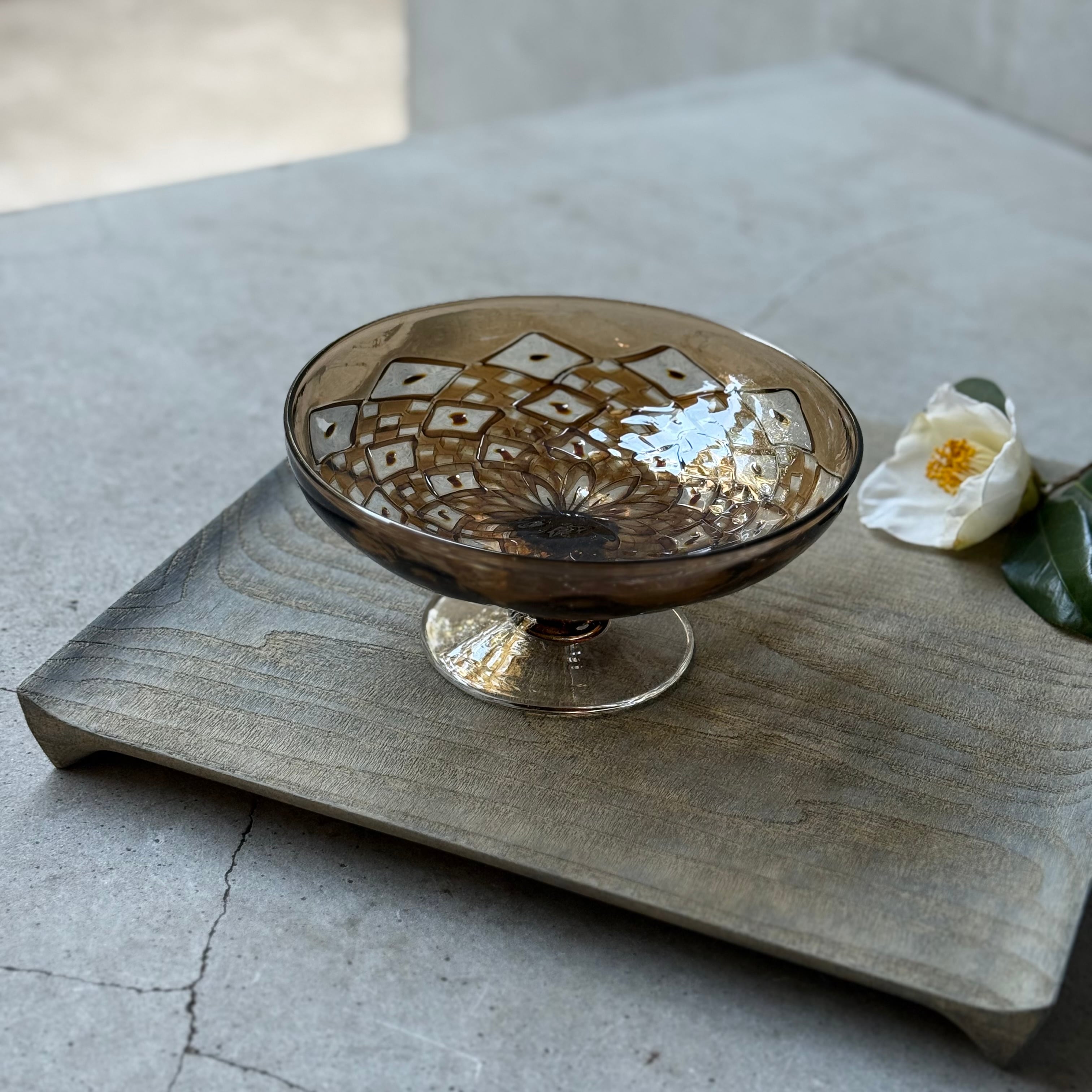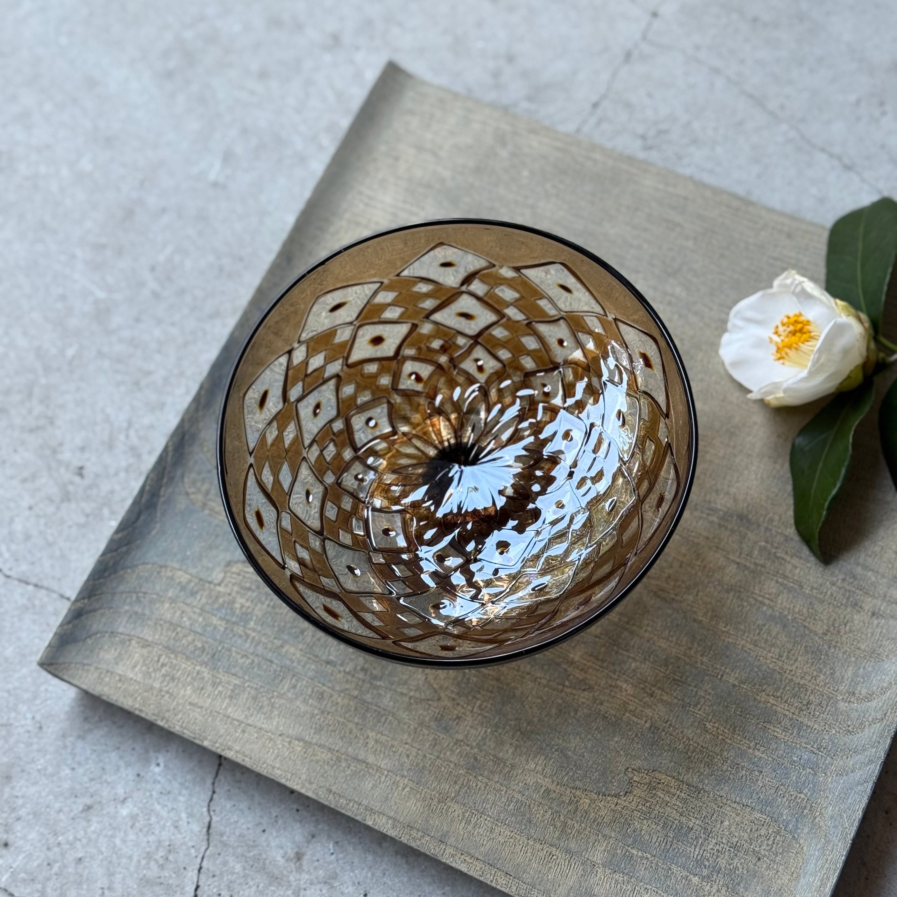 一つ一つの小さなパーツを組み合わせて作られる芸術的で絵画のようなモザイクガラスの煌めき、宙吹きならではの揺らぎや柔らかなフォルム、みずのみささんの作品からは細やかな感性が溢れています。光と影や色の重なりが連続模様を際立たせ奥行きを感じる懐の深い器です。