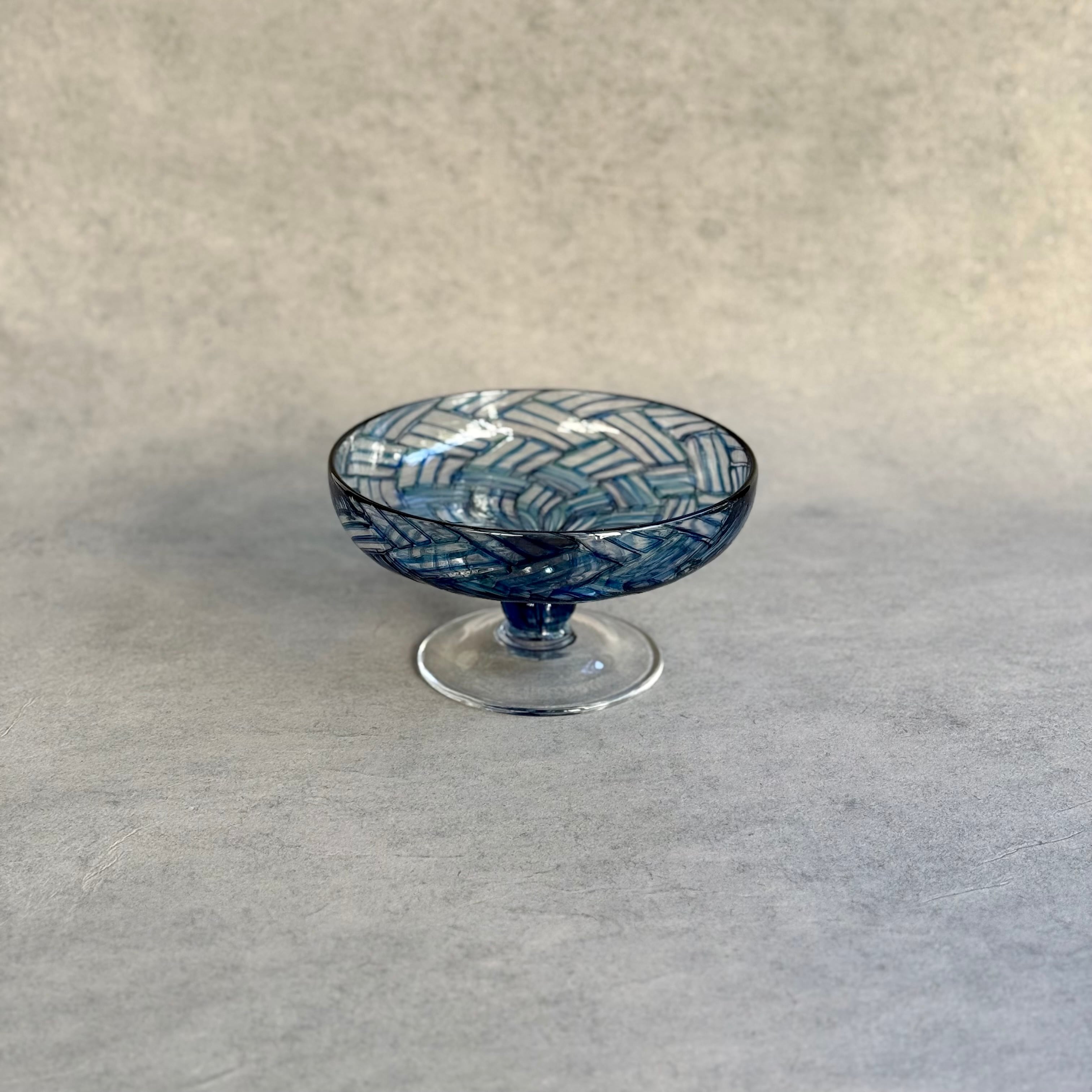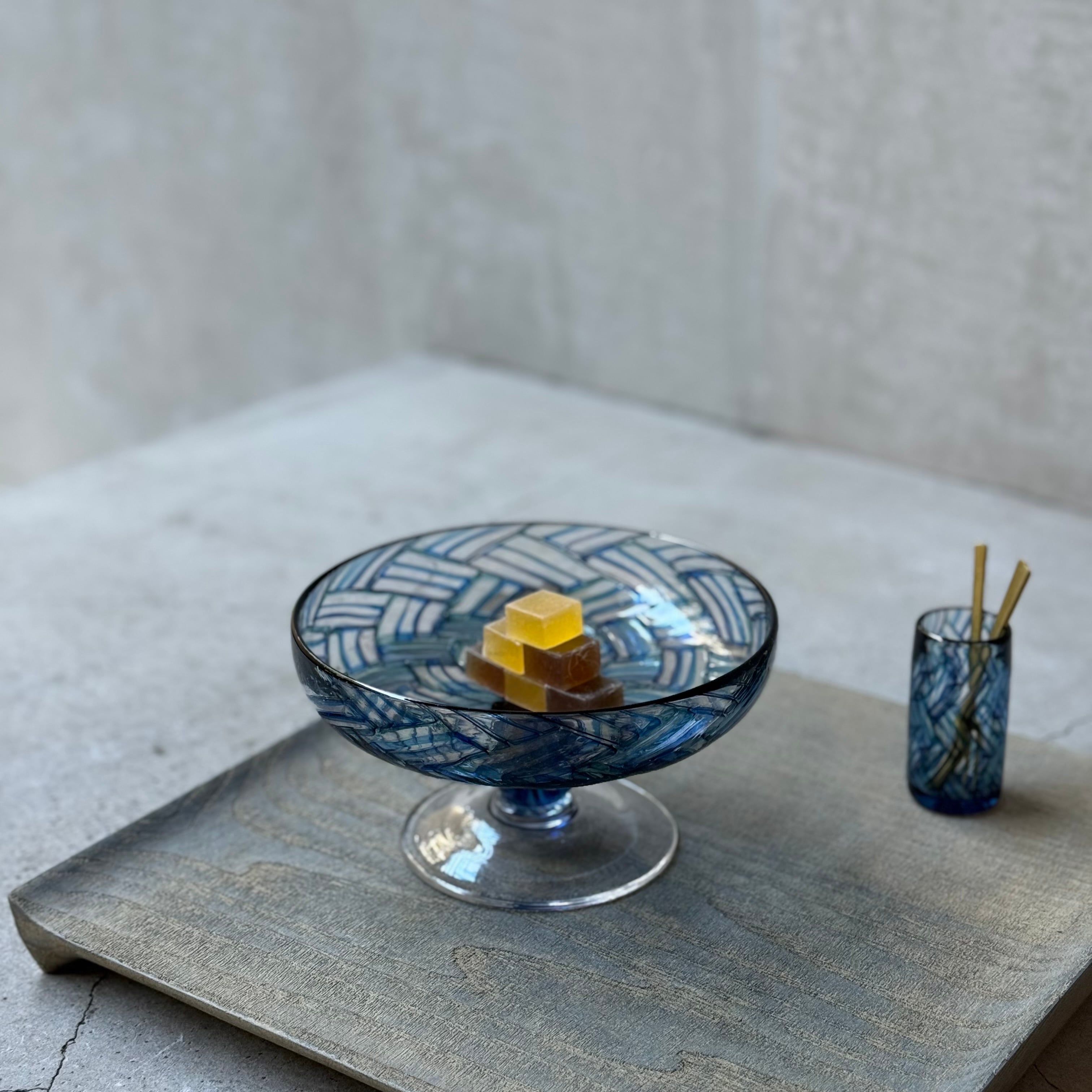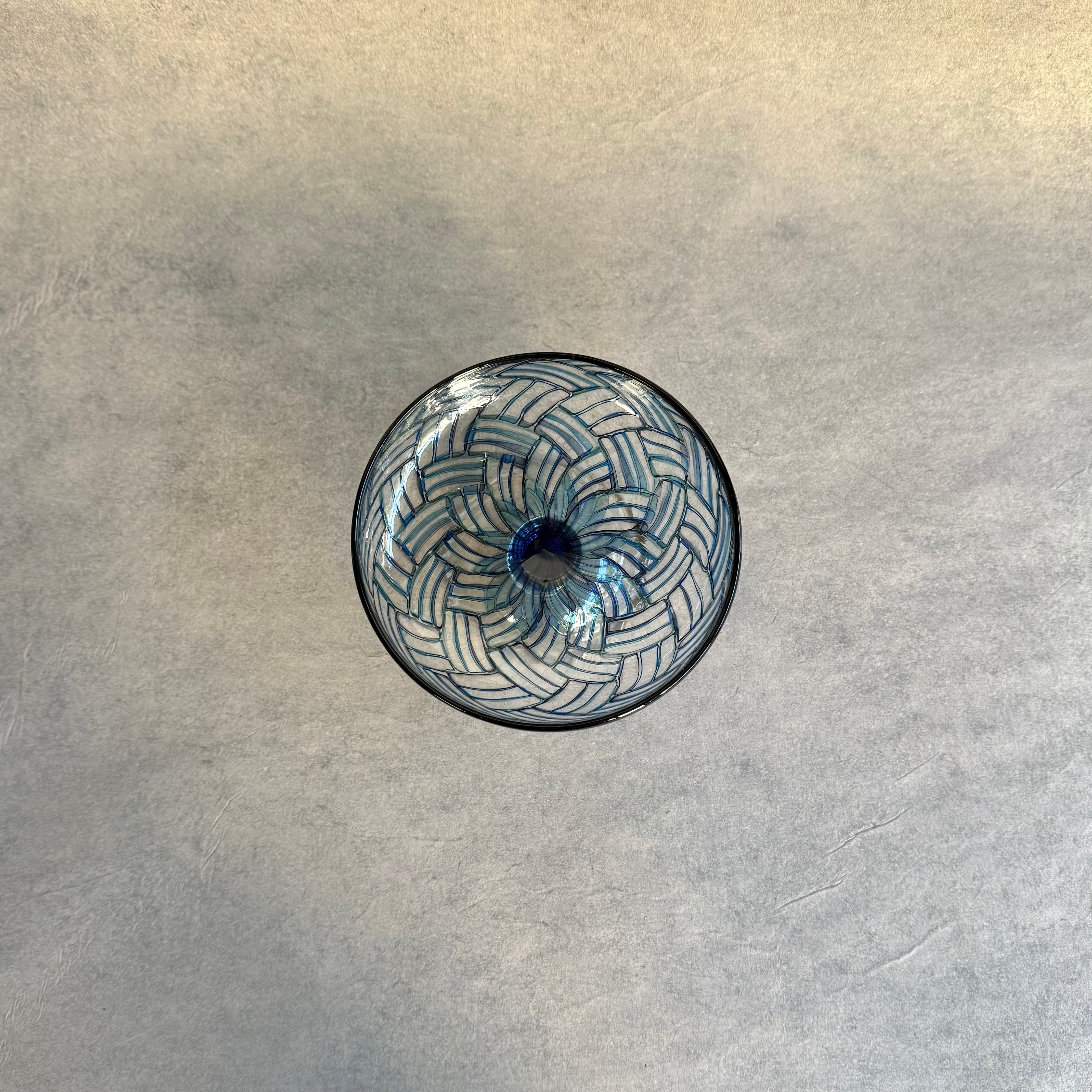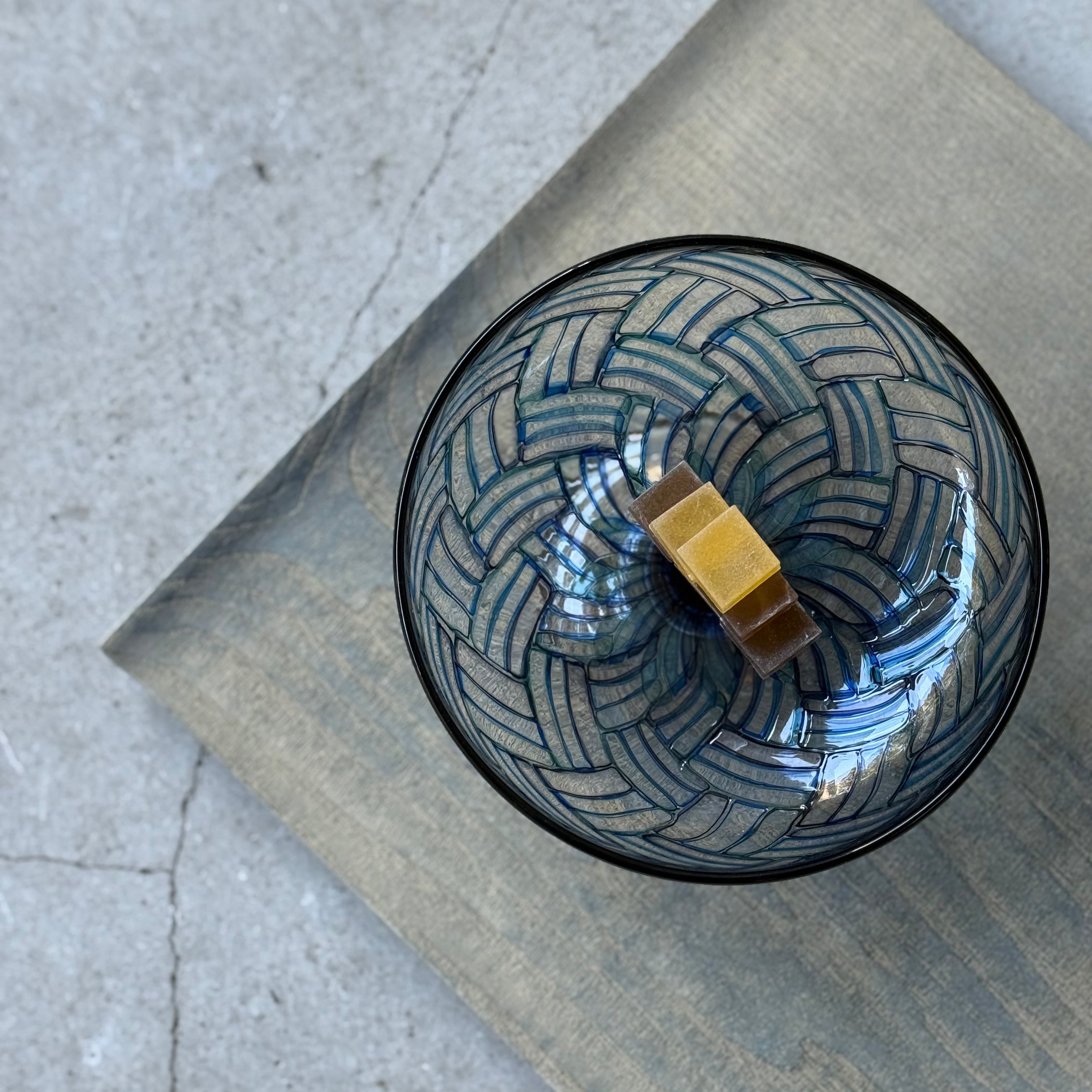 一つ一つの小さなパーツを組み合わせて作られる芸術的で絵画のようなモザイクガラスの煌めき、宙吹きならではの揺らぎや柔らかなフォルム、みずのみささんの作品からは細やかな感性が溢れています。光と影や色の重なりが連続模様を際立たせ奥行きを感じる懐の深い器です。