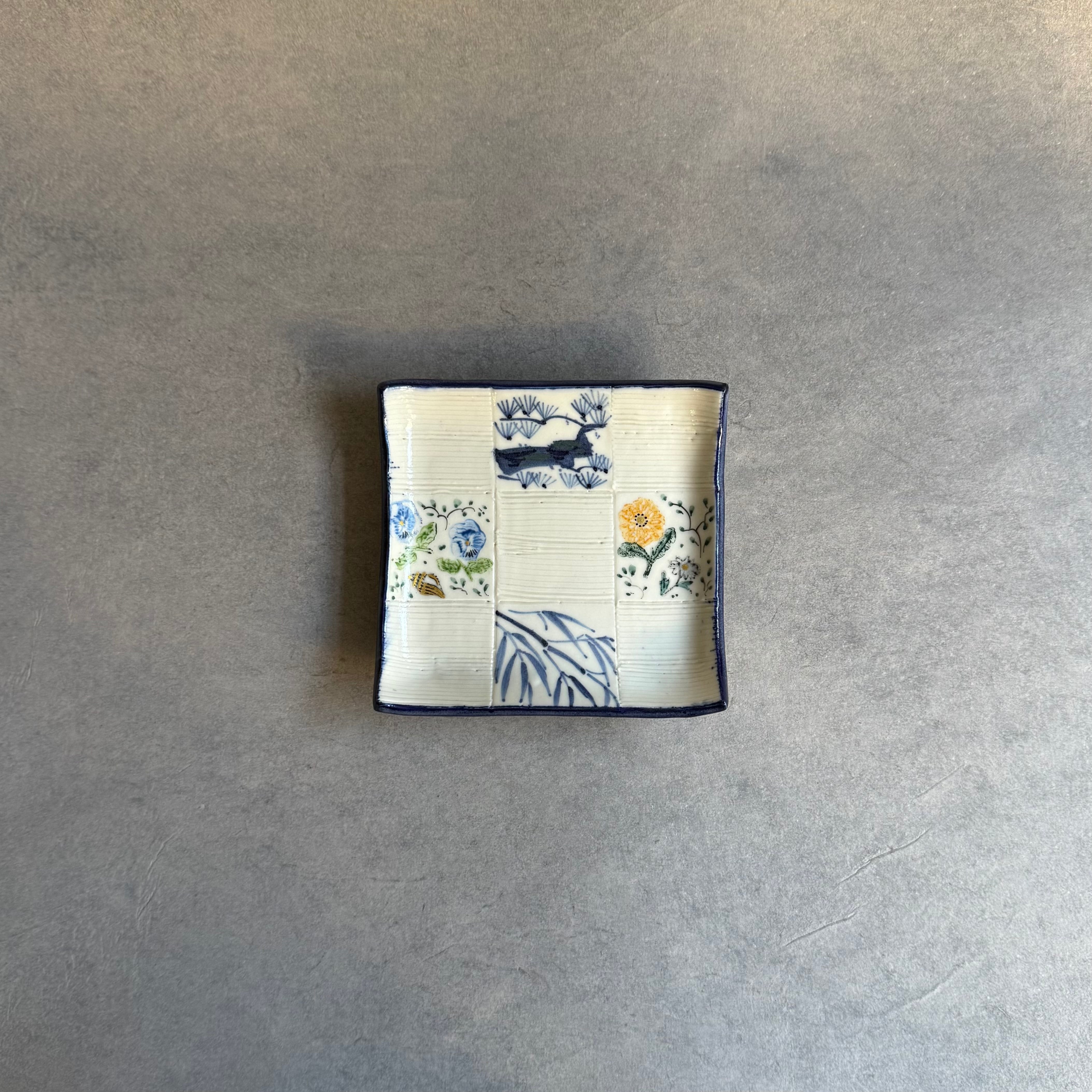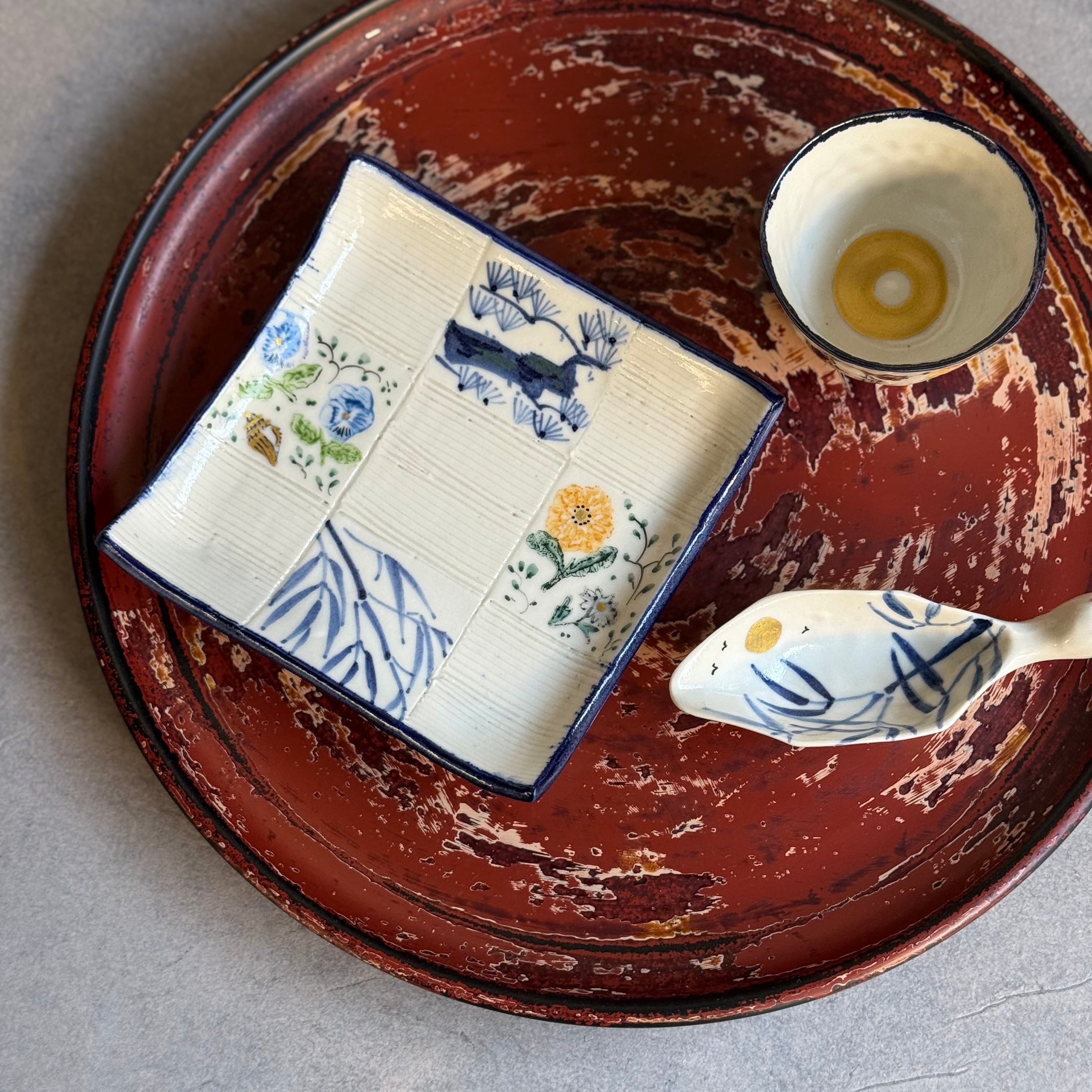 色彩豊かな印判や手描きの絵付けを施した、温もりあふれる器を制作されるつちやまりさん。
