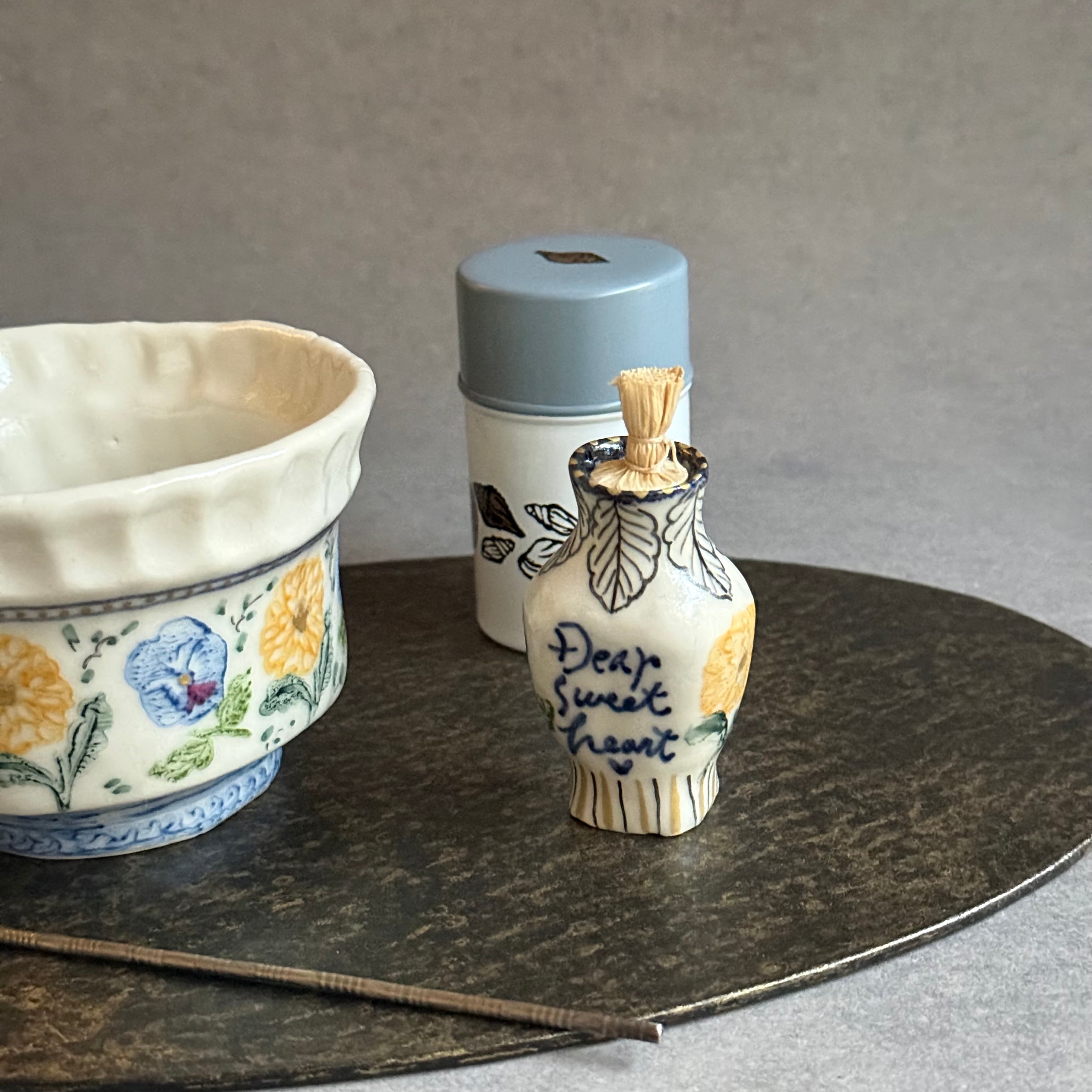 色彩豊かな印判や手描きの絵付けを施した、温もりあふれる器を制作されるつちやまりさん。