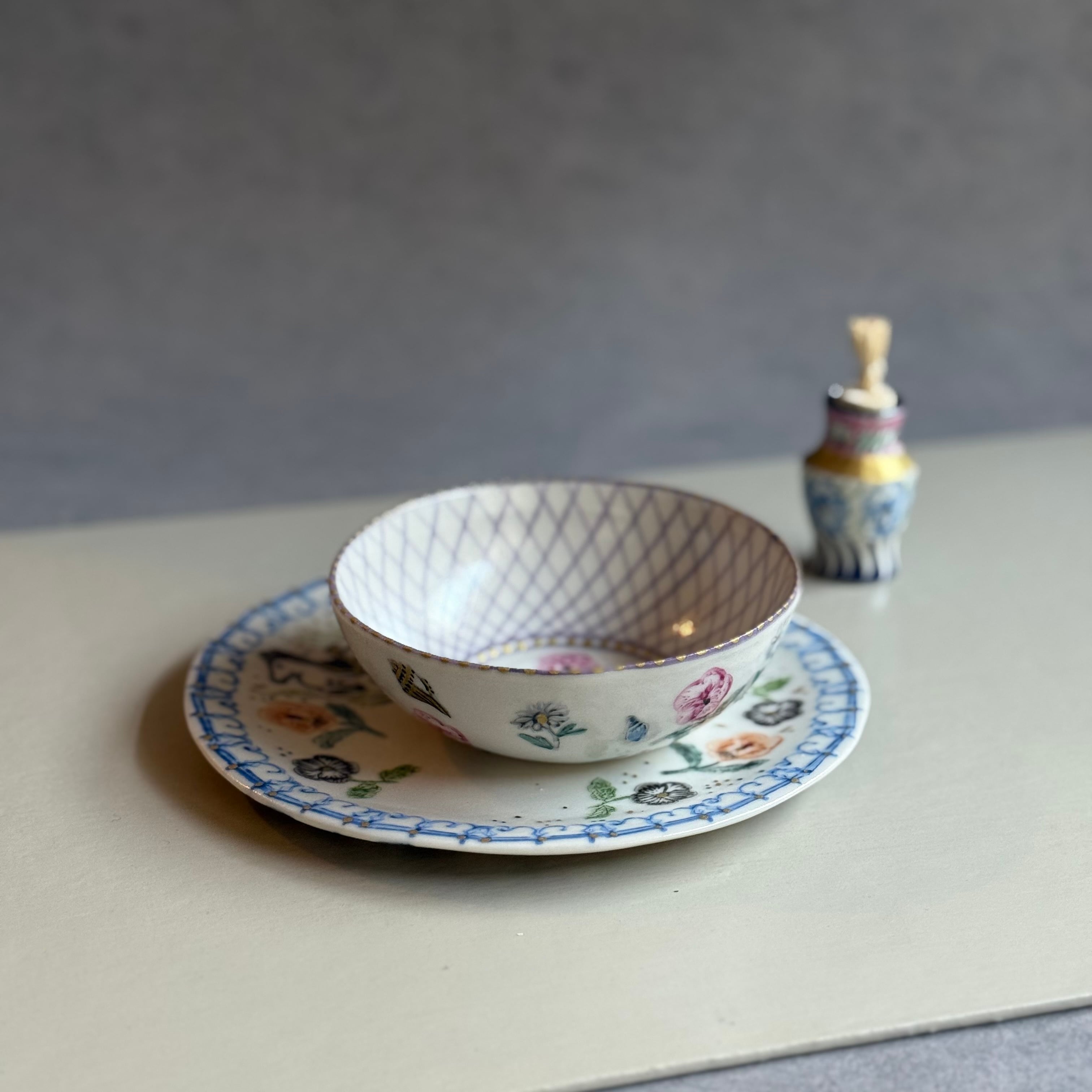 色彩豊かな印判や手描きの絵付けを施した、温もりあふれる器を制作されるつちやまりさん。