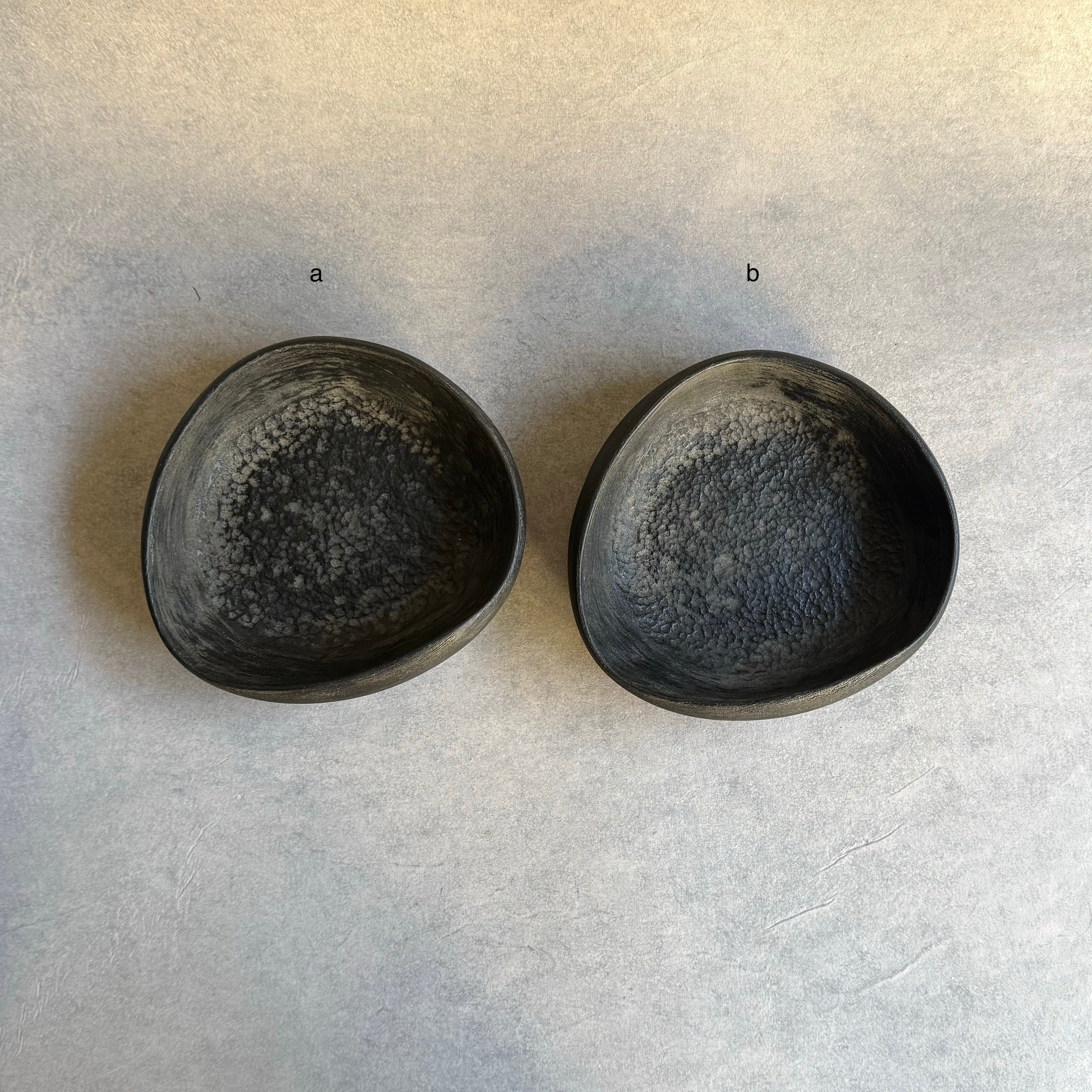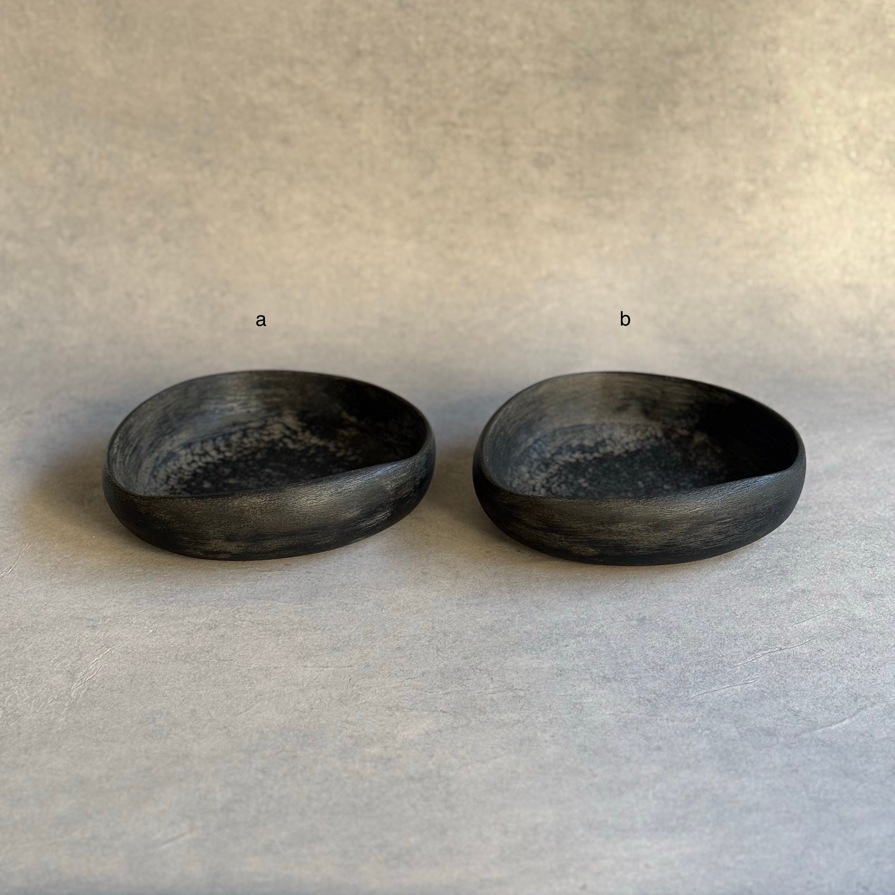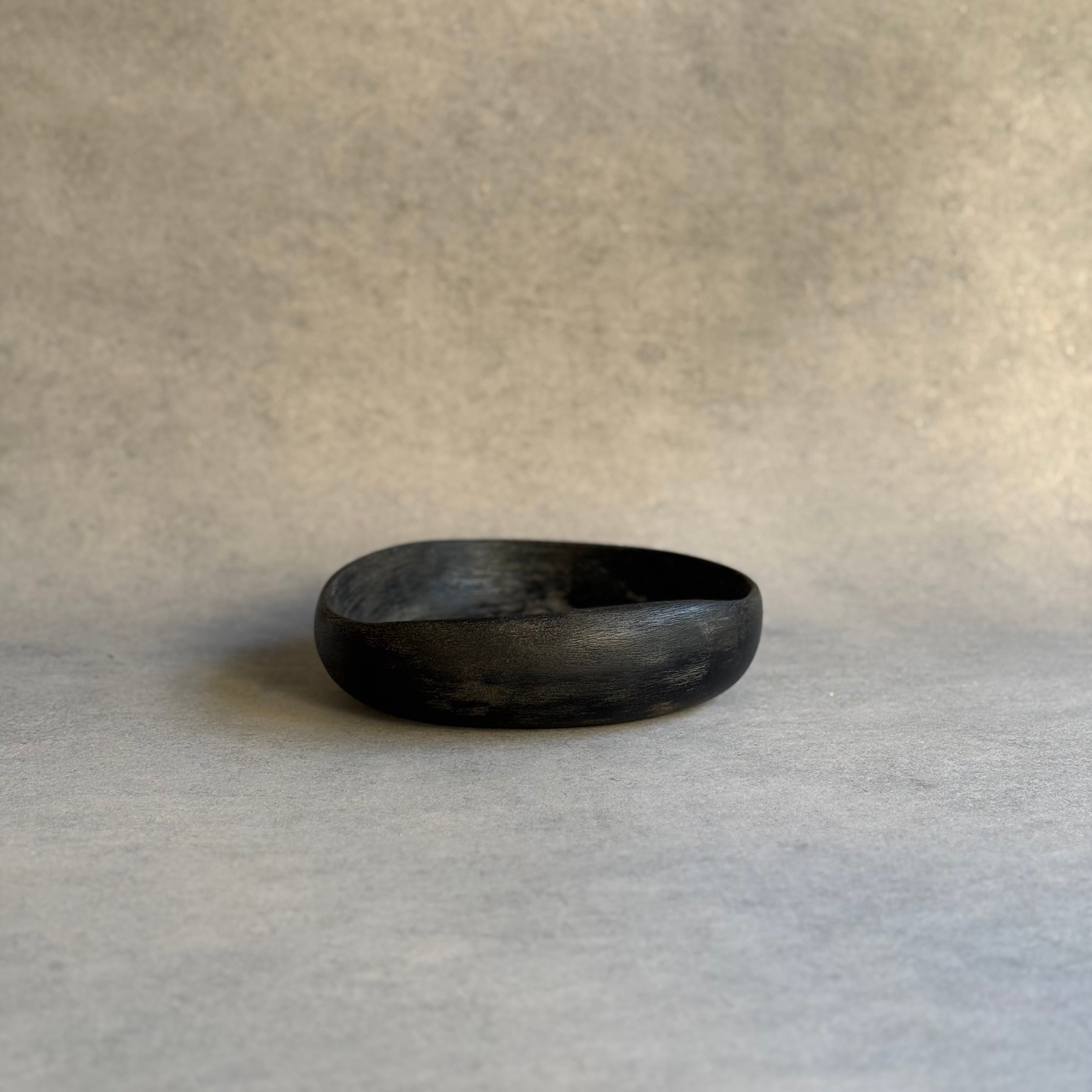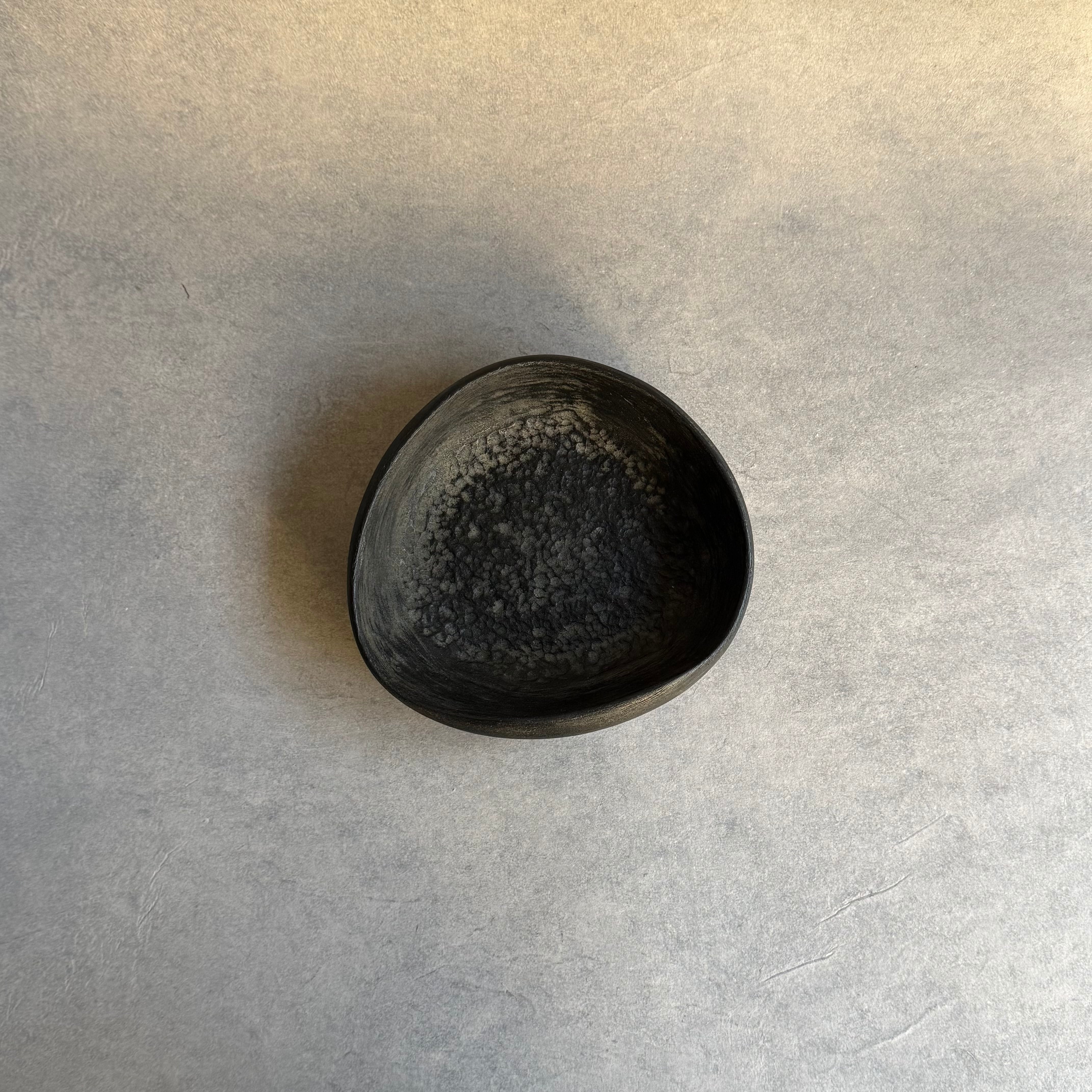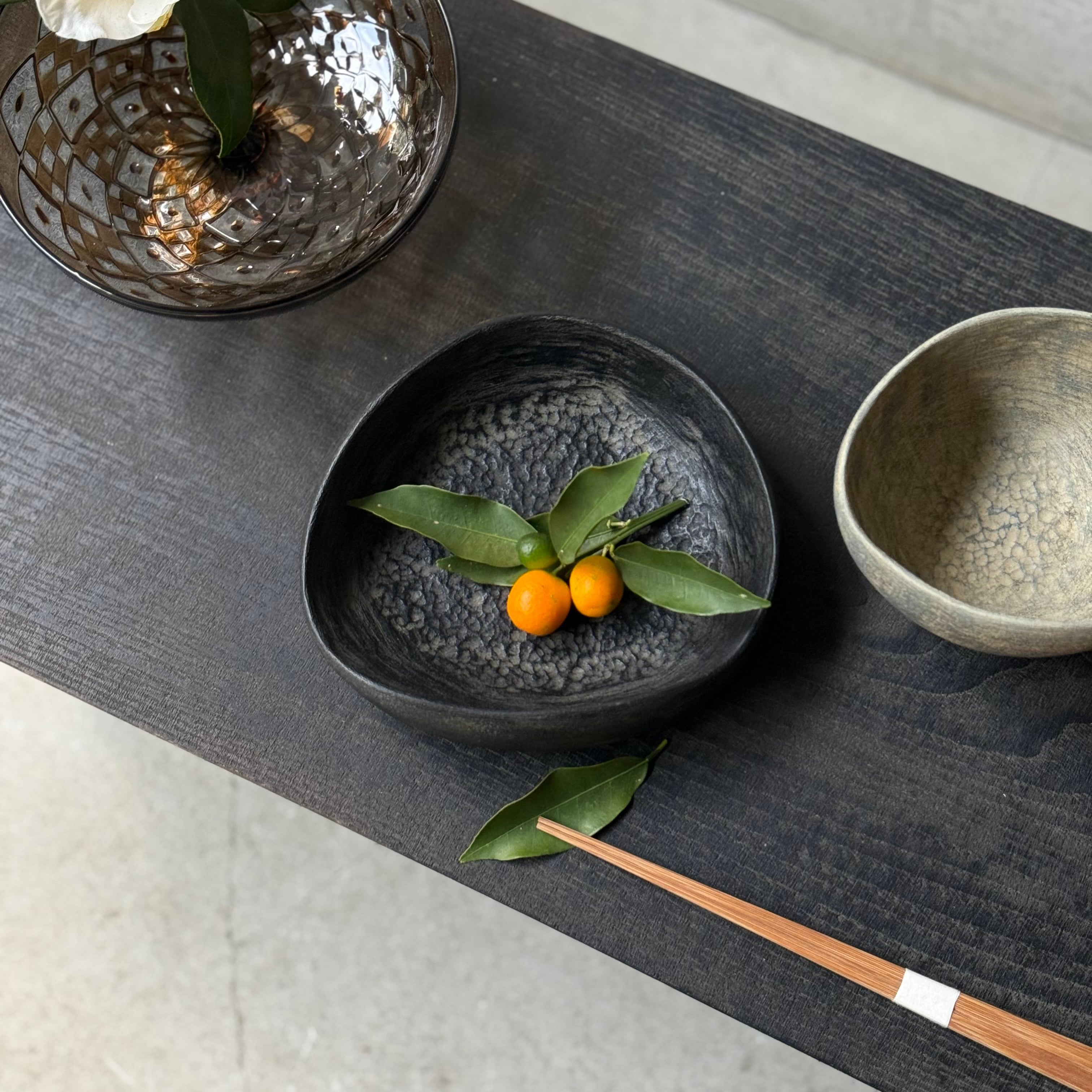 歪んだフォルムが手馴染みの良い鉢。表裏共に細やかな彫りが施されています。