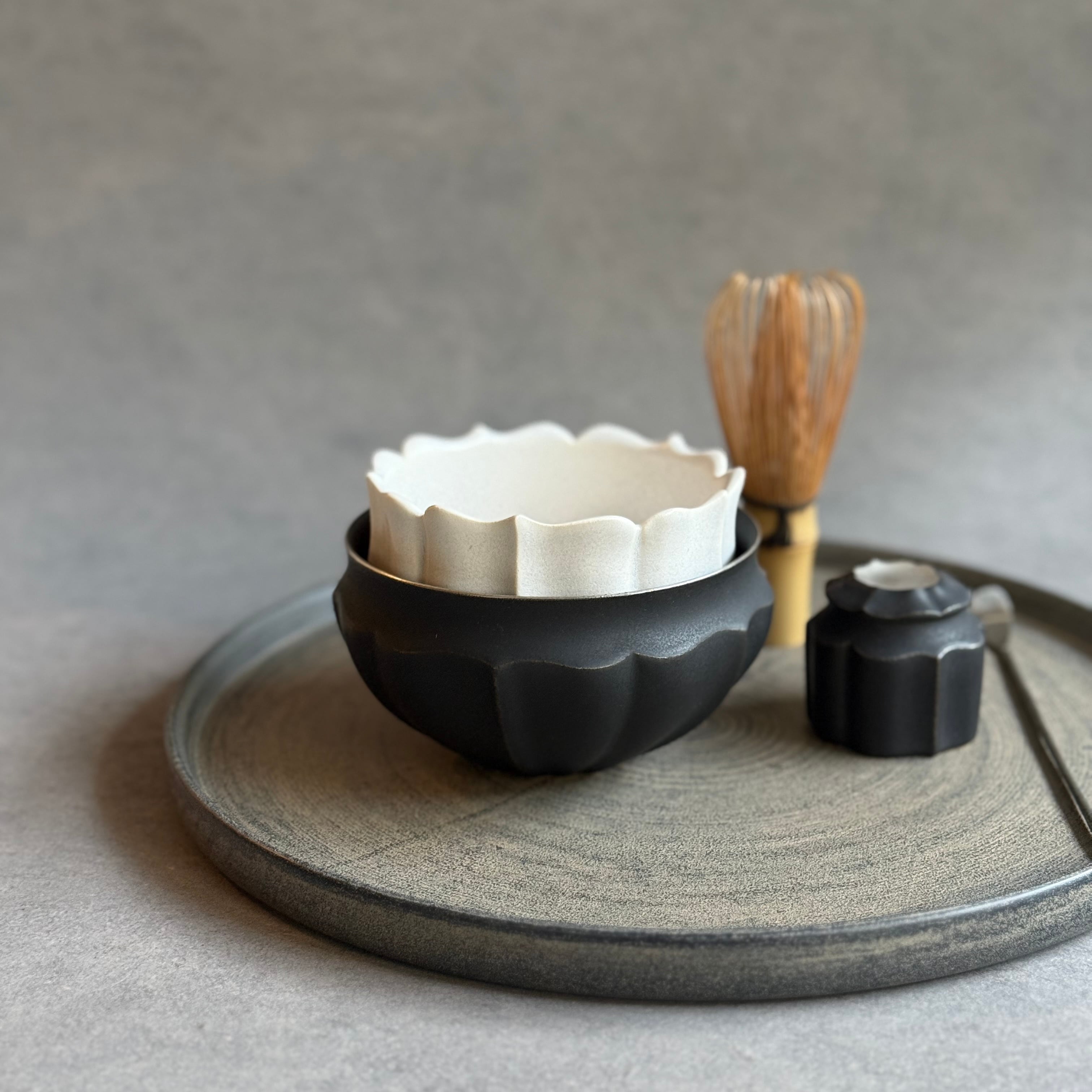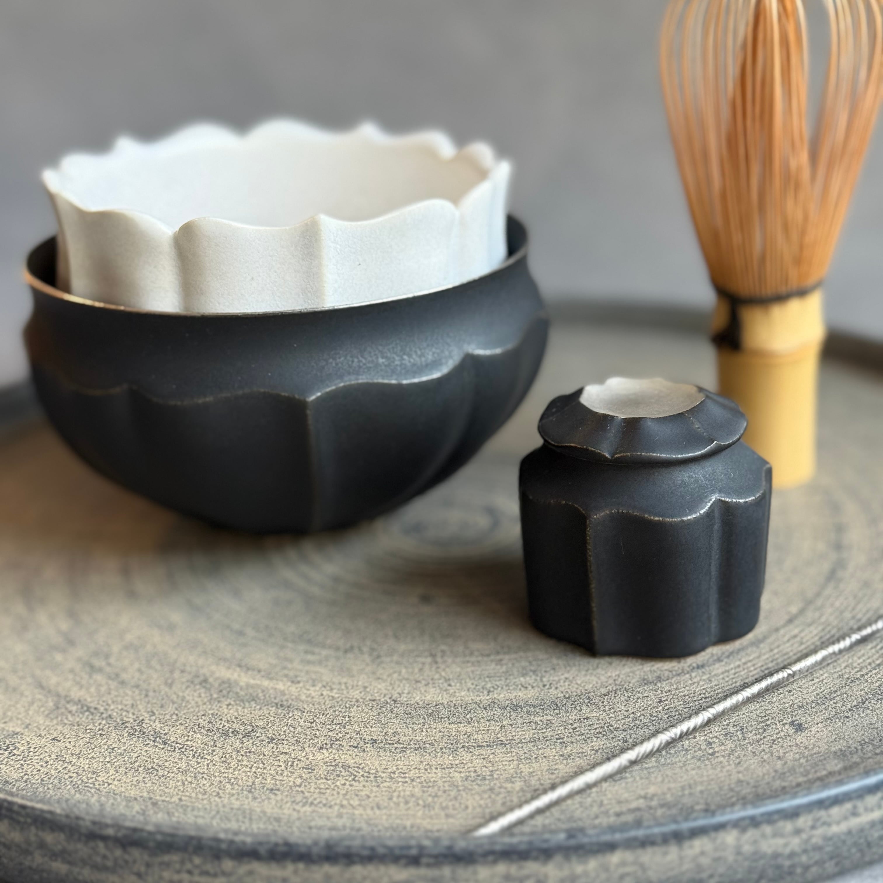 白と黒を基調としたマットな釉薬や華やかな銀彩が心躍るモダンな器は、設えに花を添え、おもてなしにも重宝します。彫刻のように深い陰陽が際立つ優雅なフォルム、可憐な植物を思わせる輪郭は美しさが際立ち、日常をよりエレガントに演出してくれる存在です。