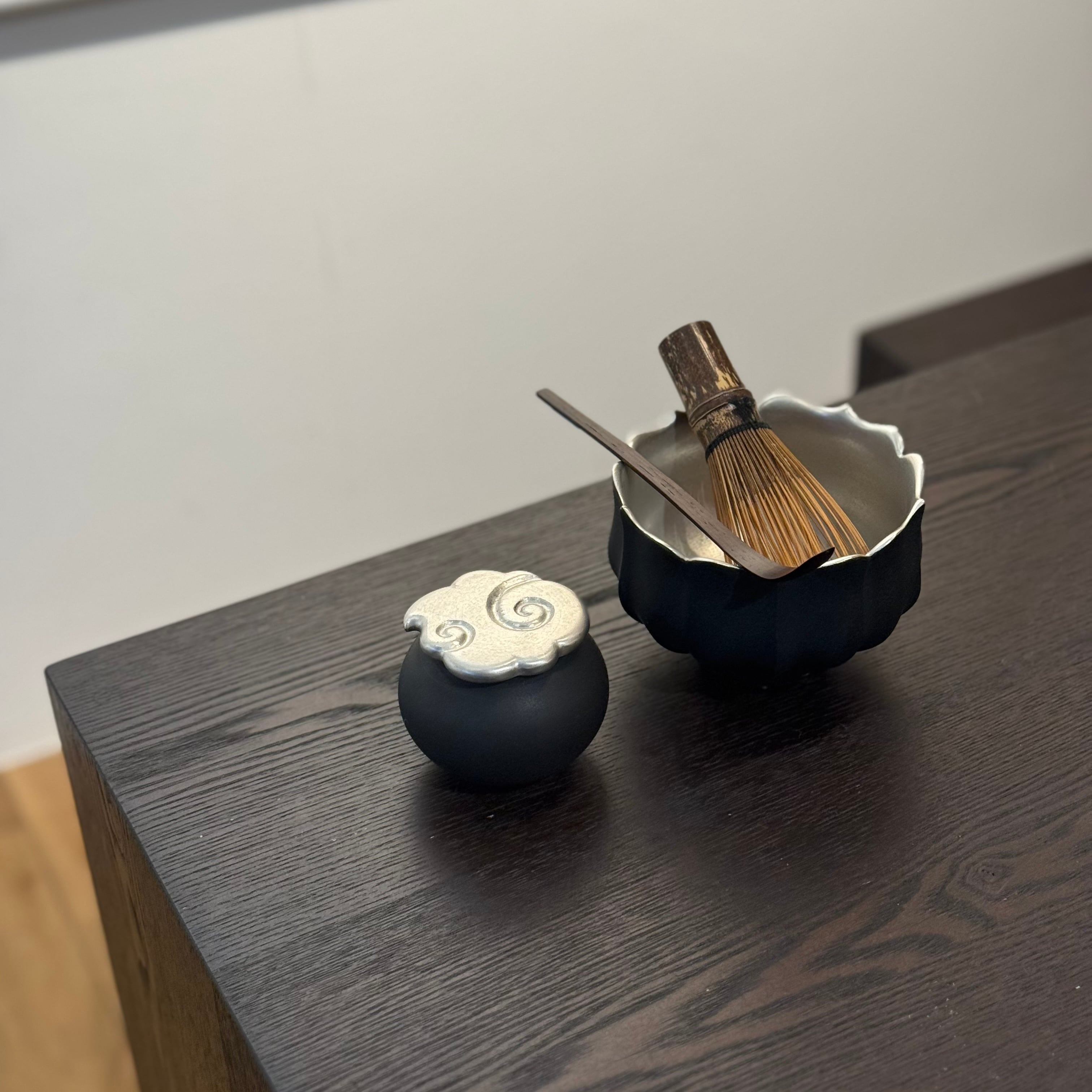 白と黒を基調としたマットな釉薬や華やかな銀彩が心躍るモダンな器は、設えに花を添え、おもてなしにも重宝します。彫刻のように深い陰陽が際立つ優雅なフォルム、可憐な植物を思わせる輪郭は美しさが際立ち、日常をよりエレガントに演出してくれる存在です。