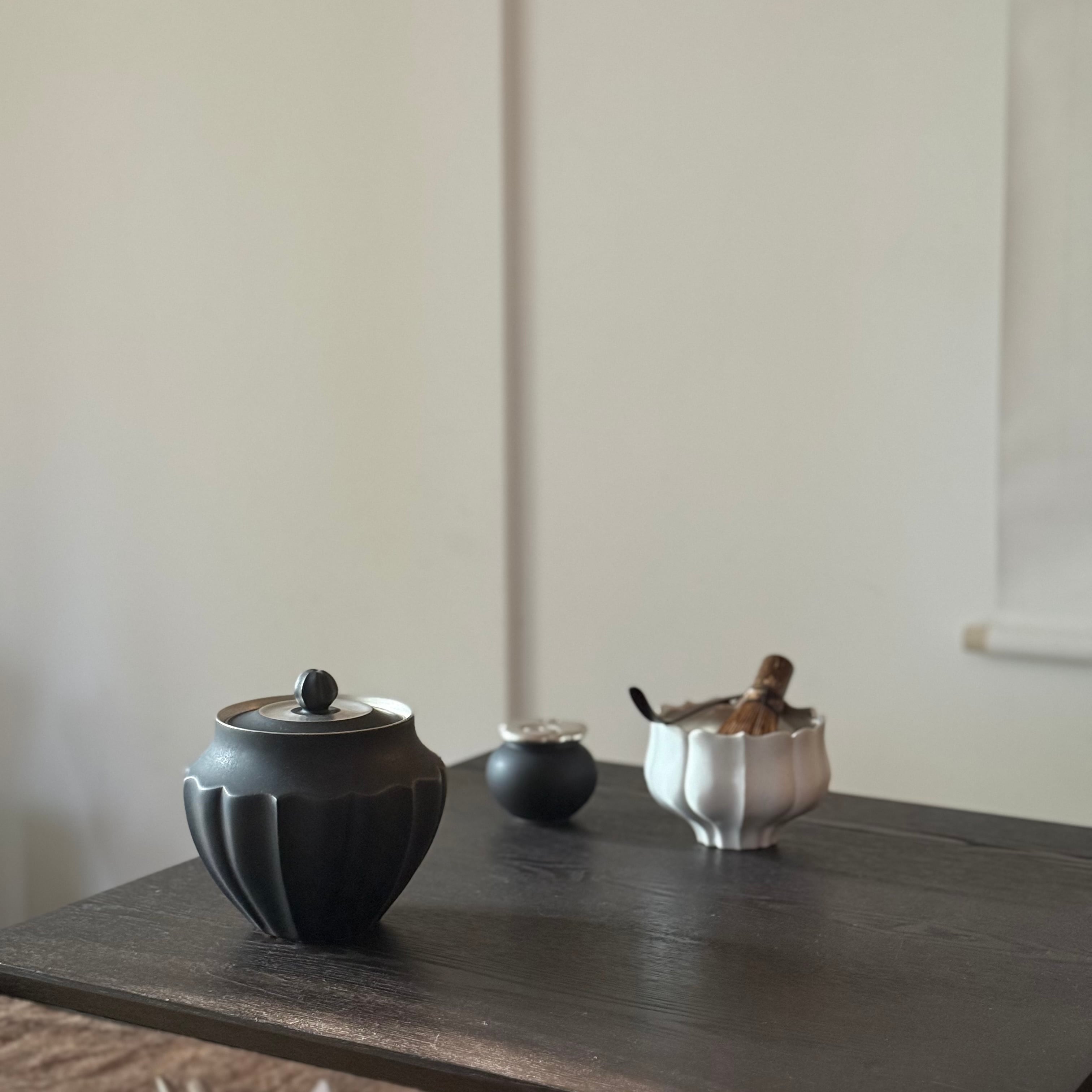 白と黒を基調としたマットな釉薬や華やかな銀彩が心躍るモダンな器は、設えに花を添え、おもてなしにも重宝します。彫刻のように深い陰陽が際立つ優雅なフォルム、可憐な植物を思わせる輪郭は美しさが際立ち、日常をよりエレガントに演出してくれる存在です。