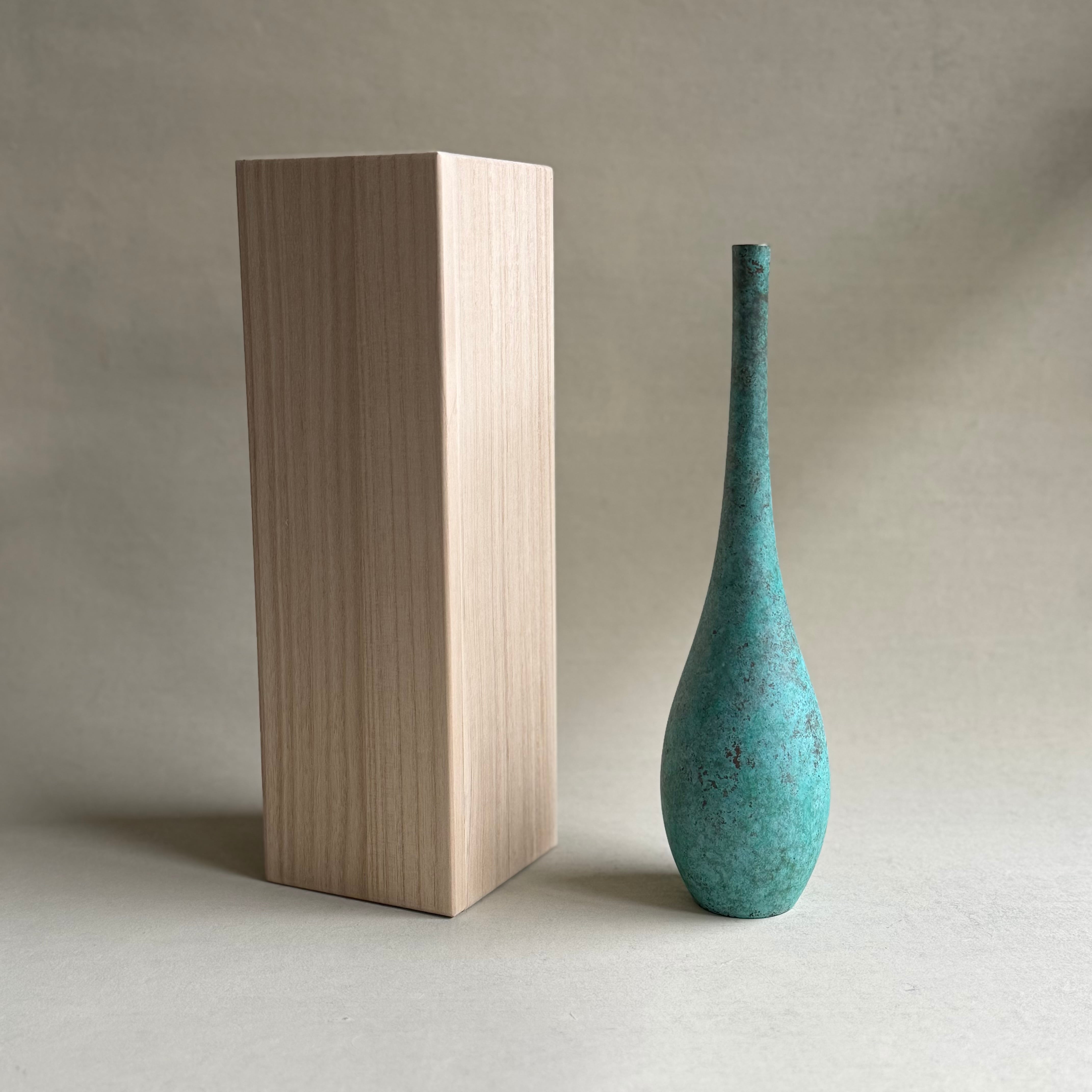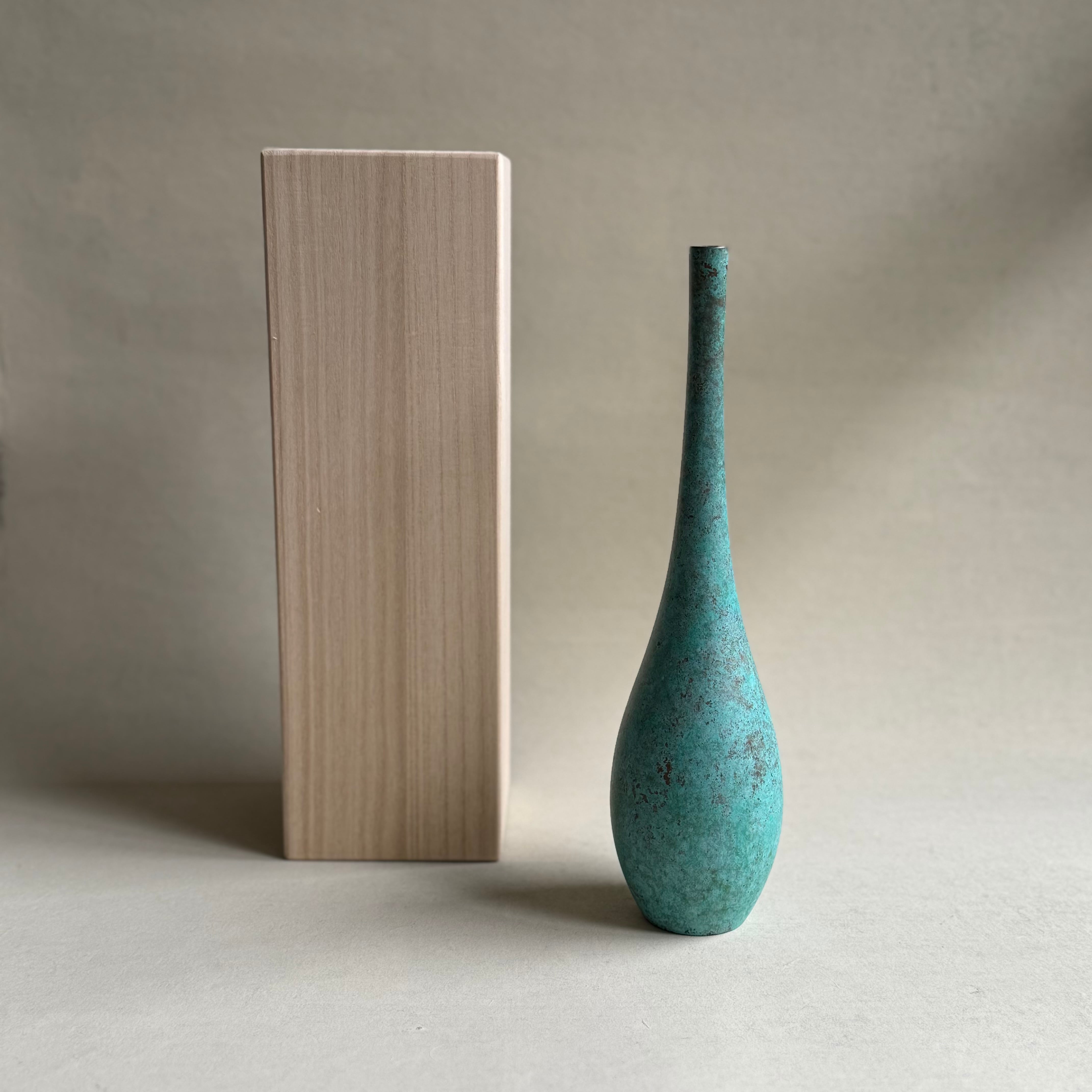 銅に緑青で仕上げられた趣深い作品は、手元に置くことで上質な茶席の雰囲気を感じられることでしょう。古物のような質感と落ち着いた色合いはどんな花をも引き立て静謐な空間を演出してくれます。