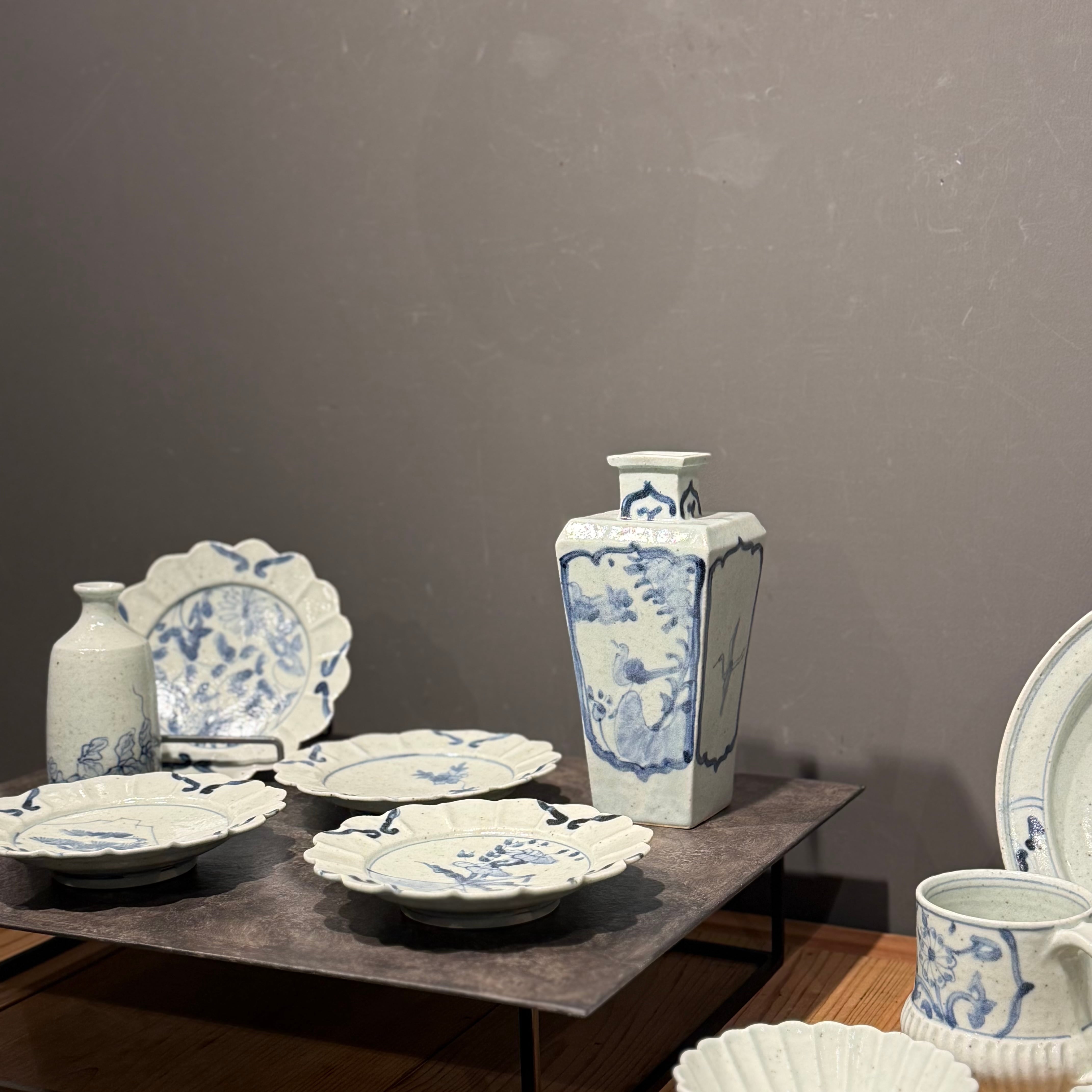 Takaaki Yoshida creates ceramics inspired by early Imari and other antique pottery, weaving in his own unique sensibility that fits seamlessly into contemporary living. His classical patterns, rendered in underglaze blue and raised relief, convey a dignified strength within their soft impression.