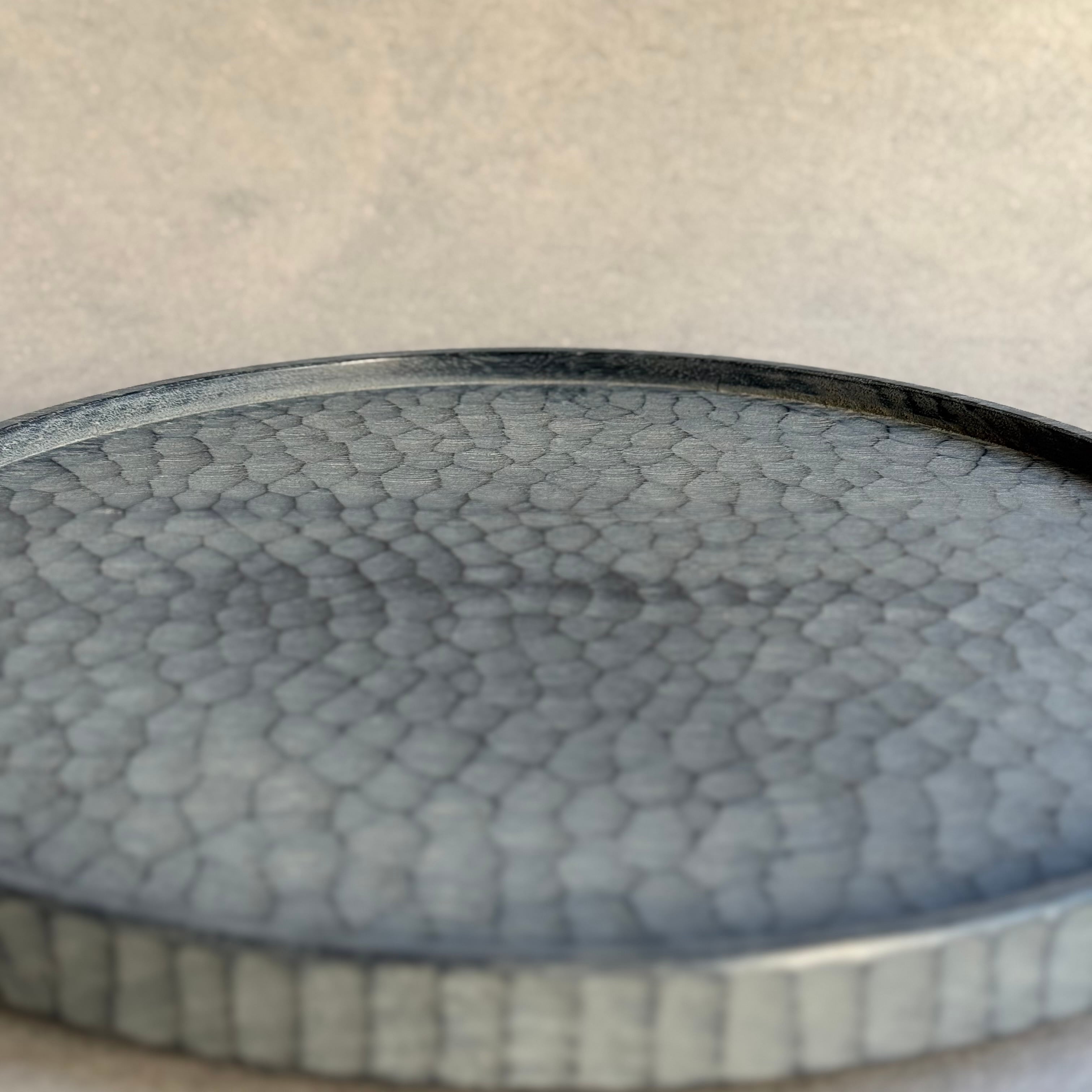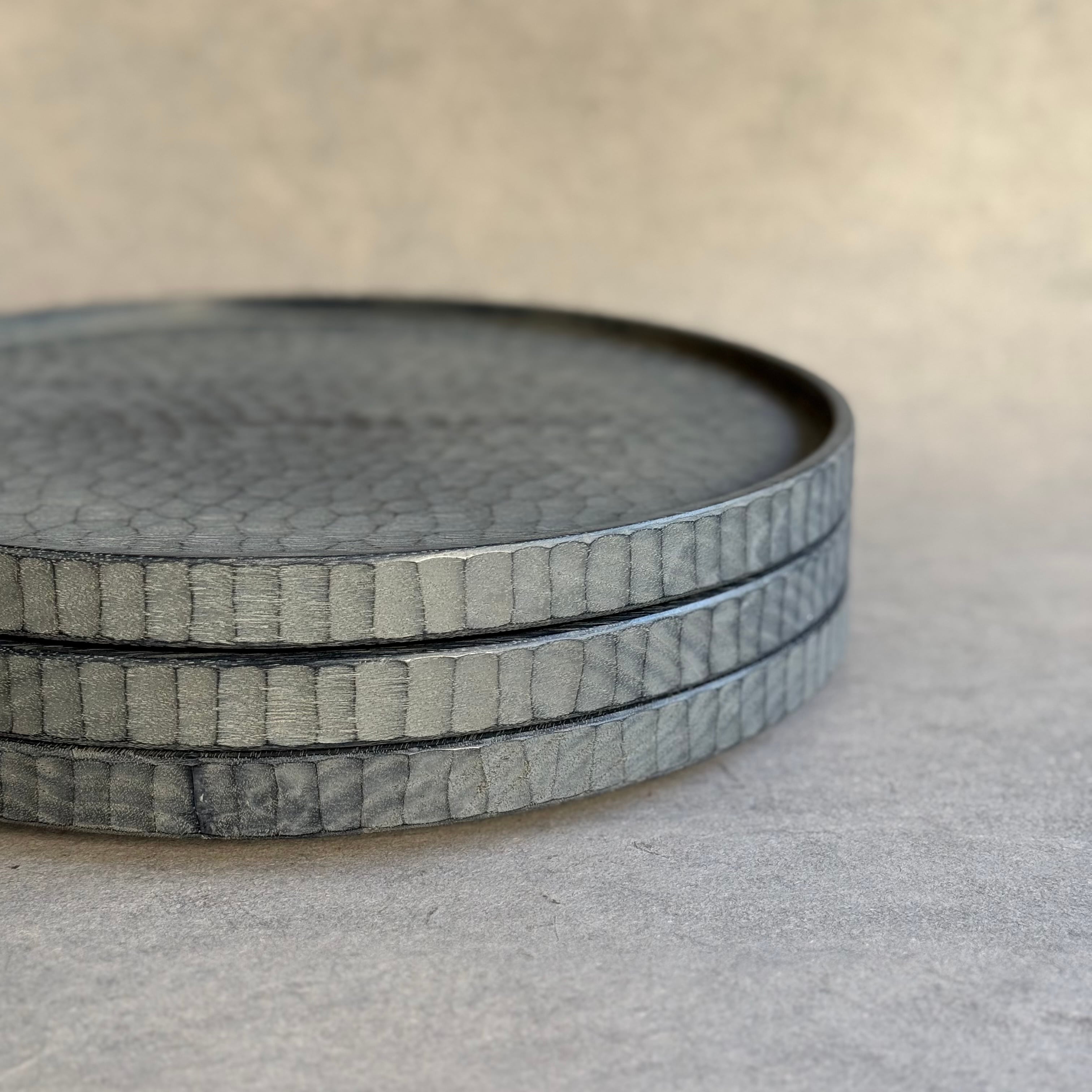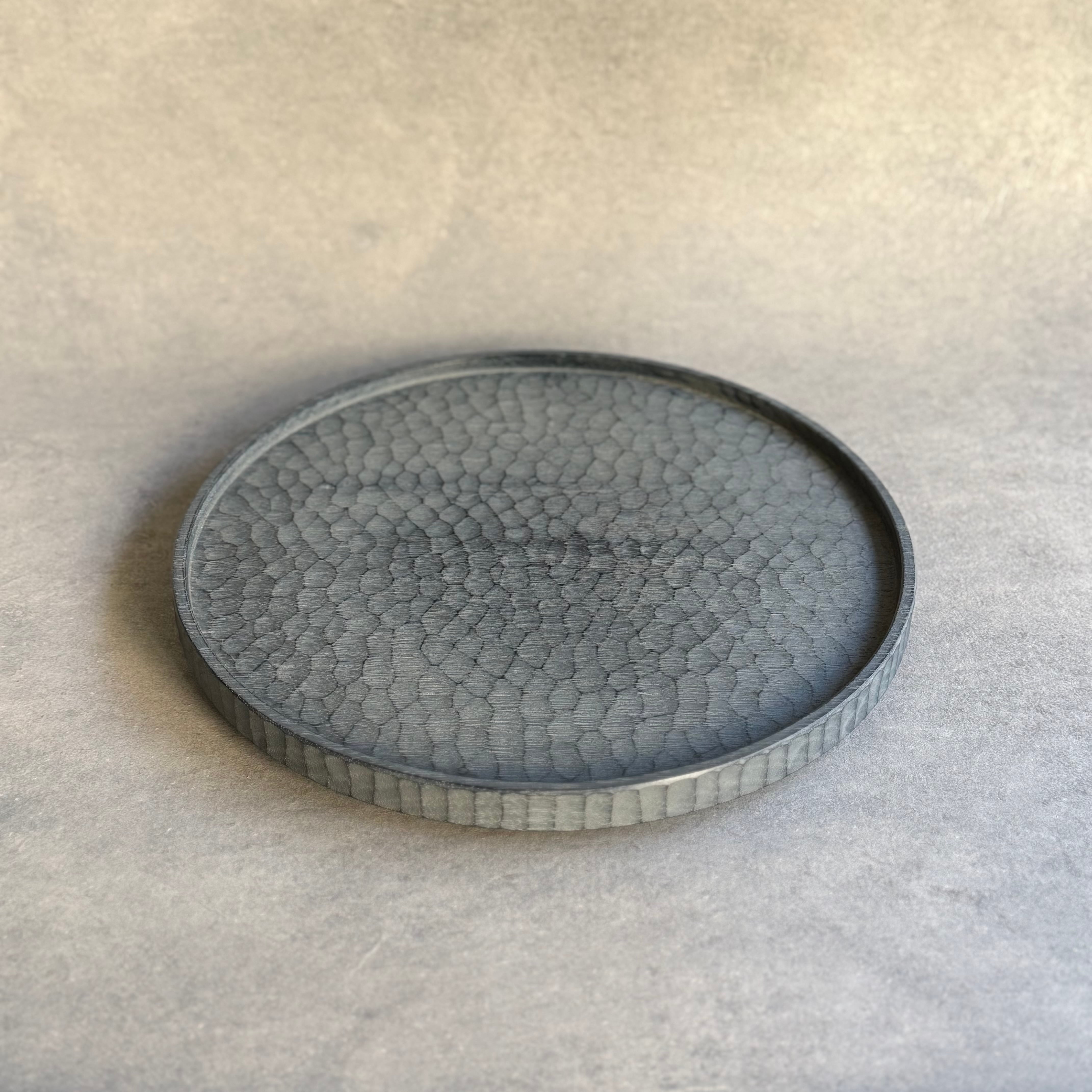 木と漆の質感を大切にしながら日常使いの器やお盆など、木の個性を生かした作品を制作される吉田欣司さん。程よい厚みの手彫りの仕上げは頼もしく、黒漆と白漆を何層にも塗り重ねて磨き上げる事で表れるブルーグレーの色合いはまるで霧を纏ったように柔らかく、使うほどに愛着が湧いてきます。