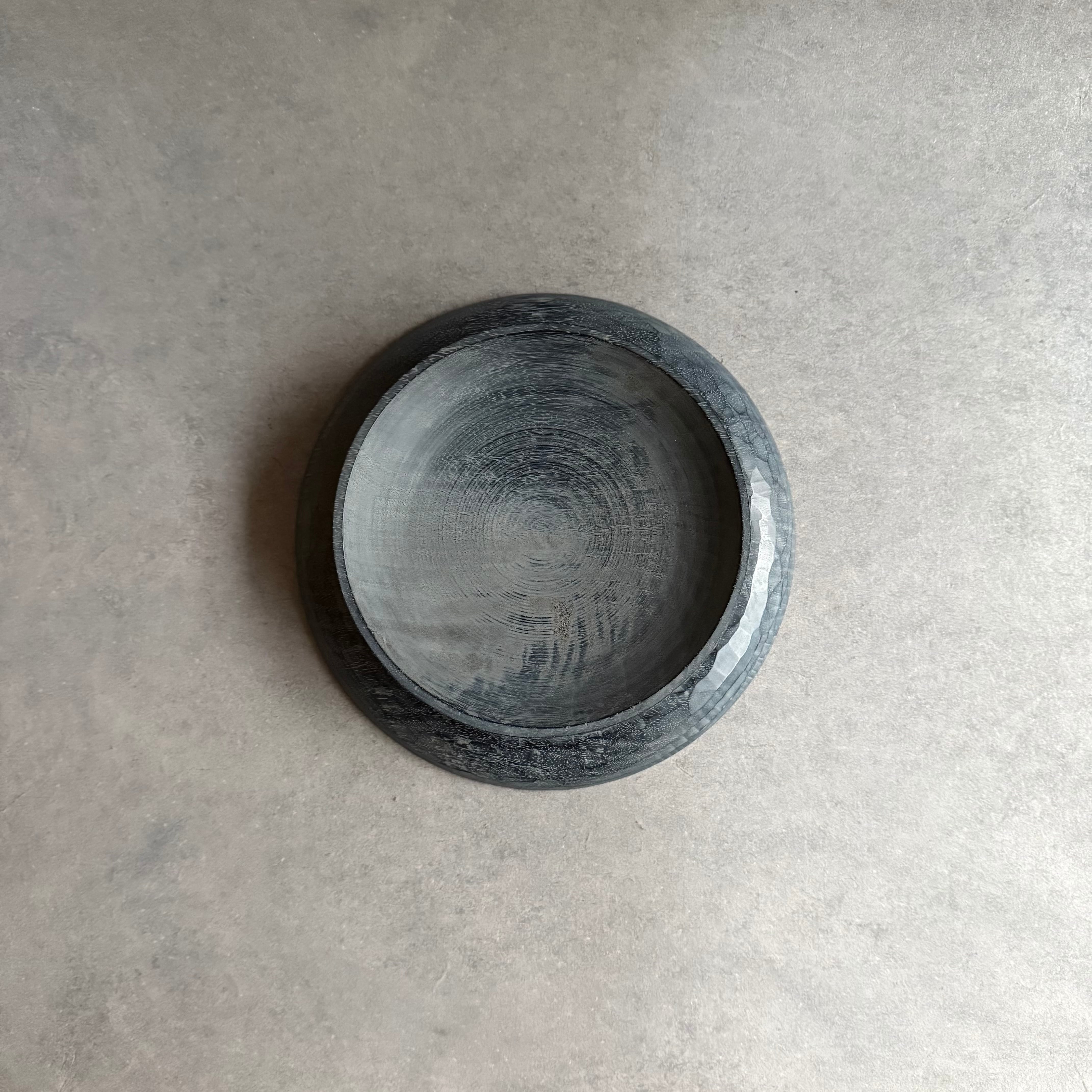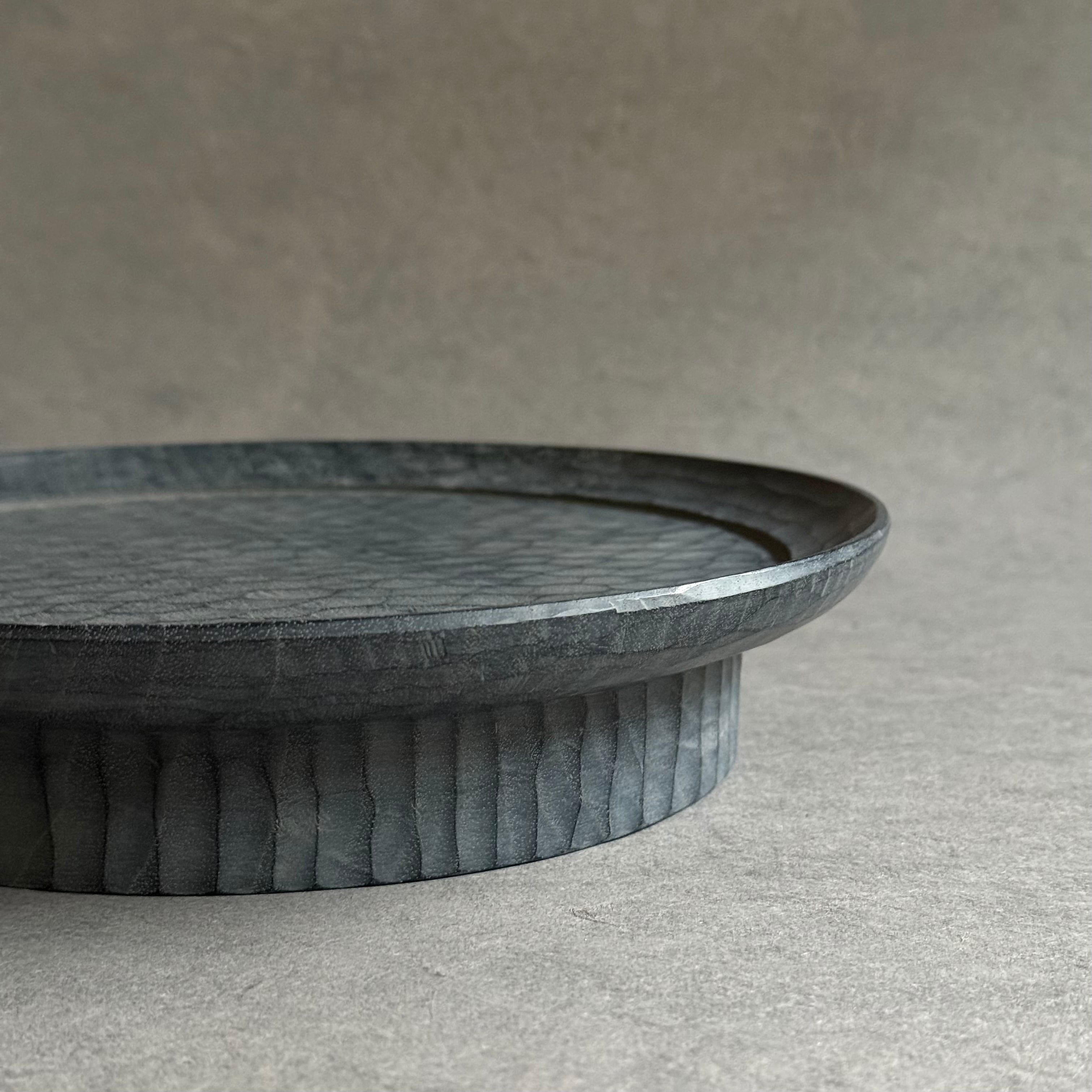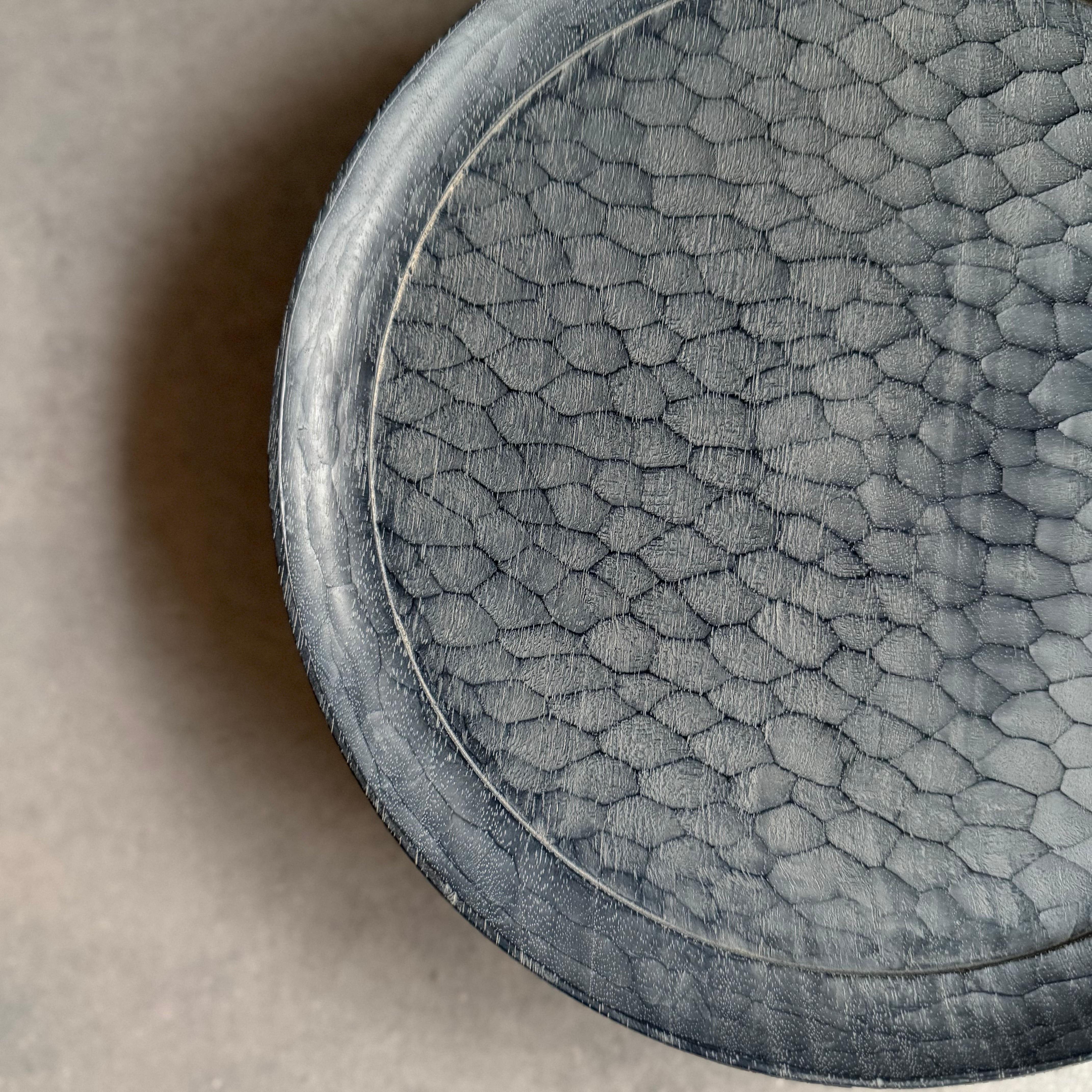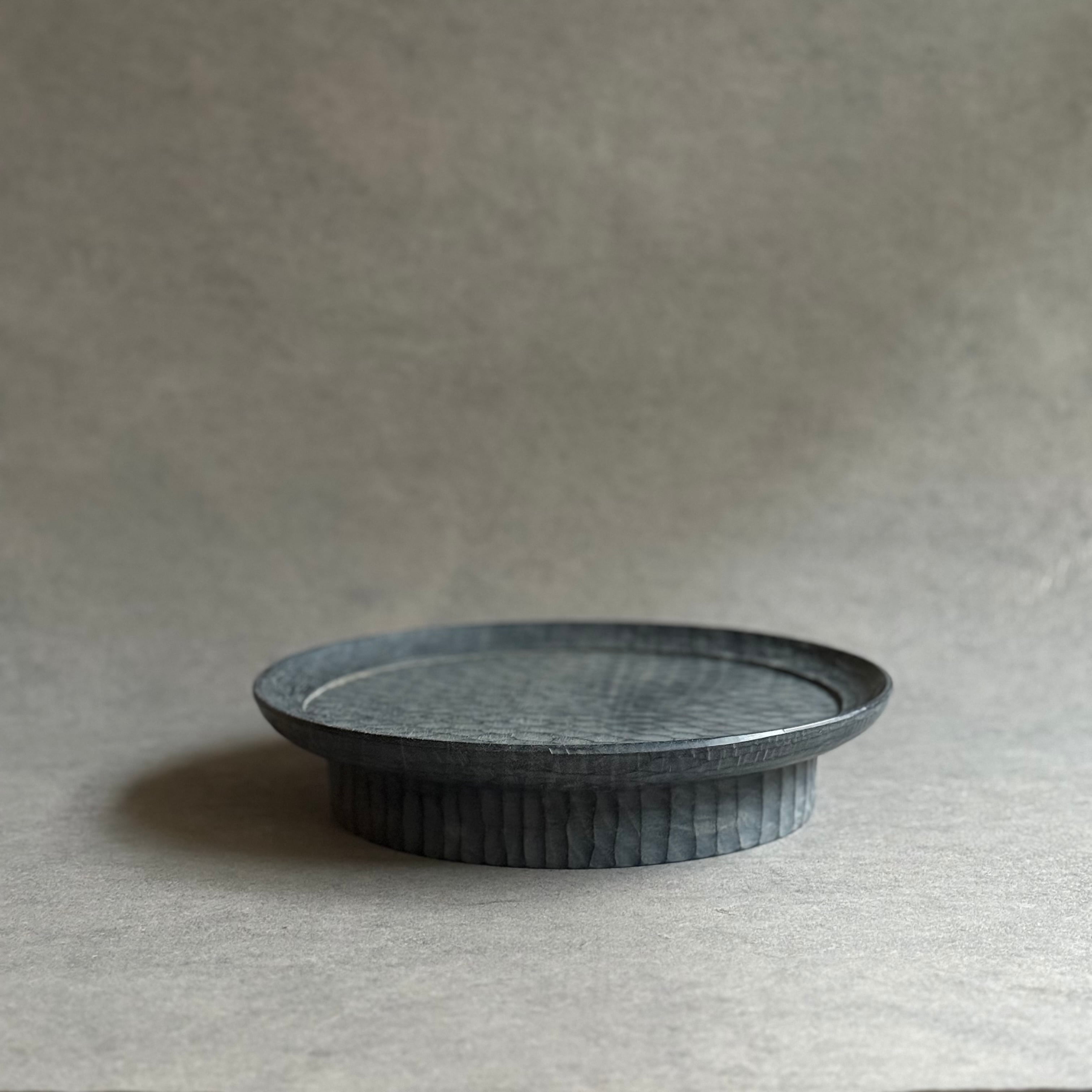 木と漆の質感を大切にしながら日常使いの器やお盆など、木の個性を生かした作品を制作される吉田欣司さん。程よい厚みの手彫りの仕上げは頼もしく、黒漆と白漆を何層にも塗り重ねて磨き上げる事で表れるブルーグレーの色合いはまるで霧を纏ったように柔らかく、使うほどに愛着が湧いてきます。