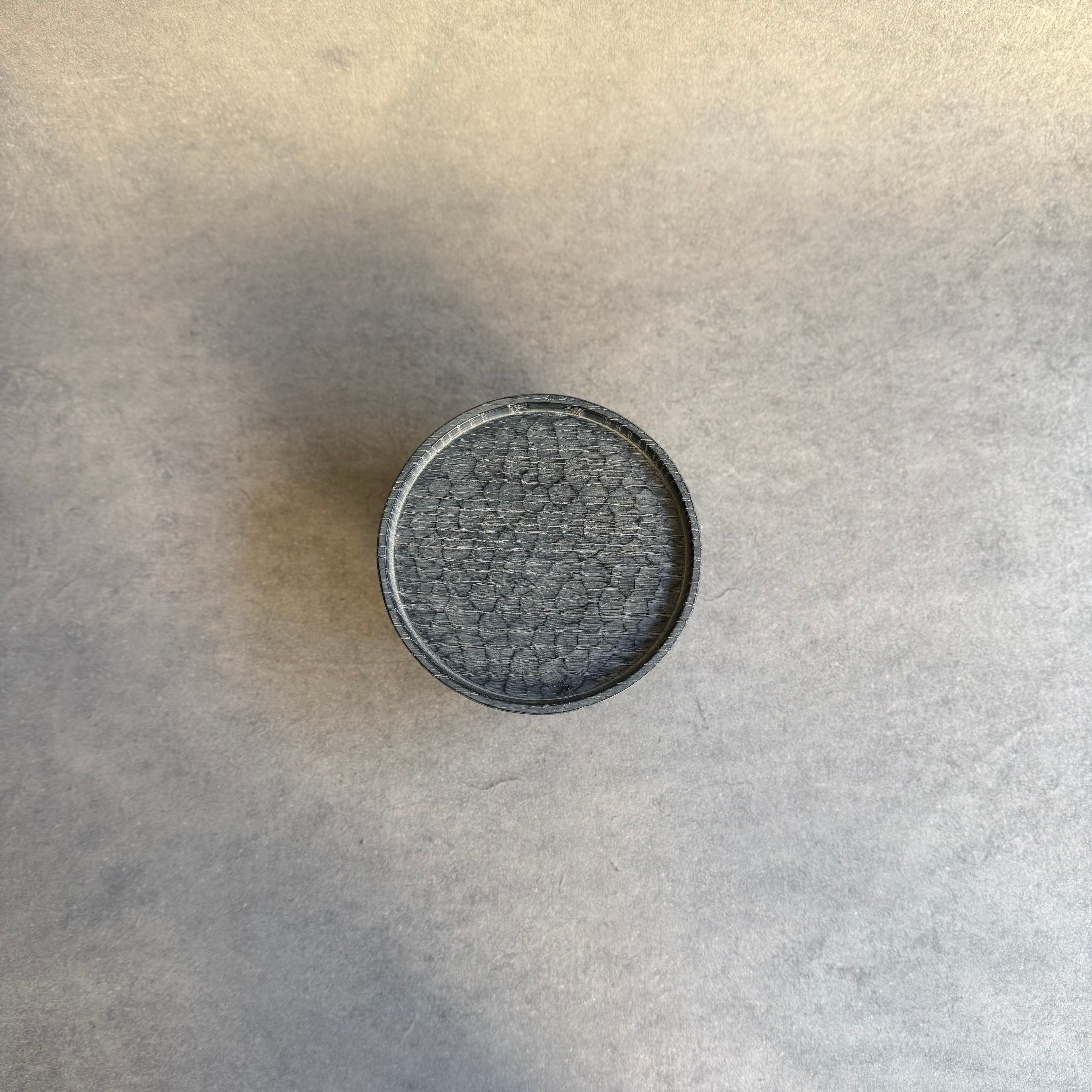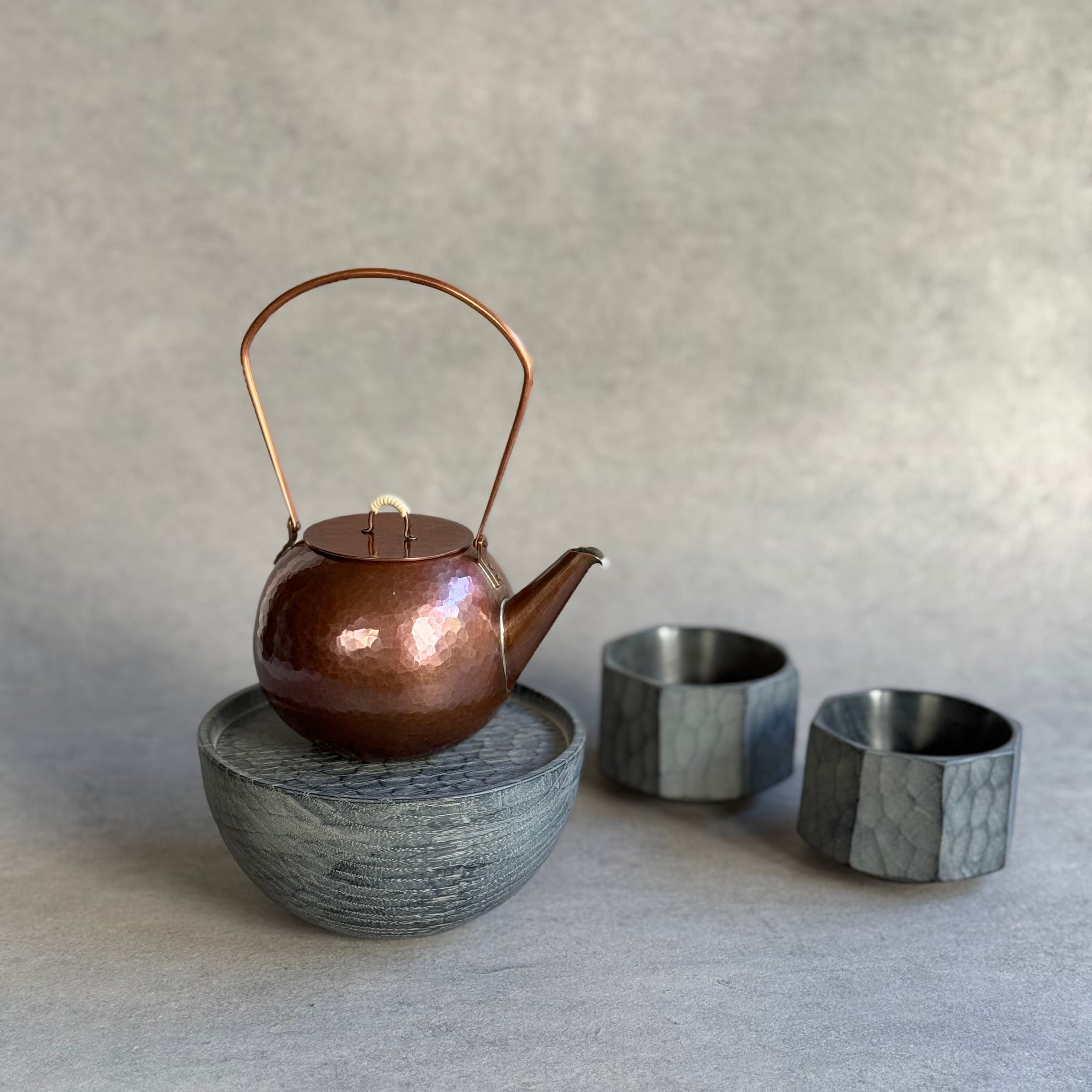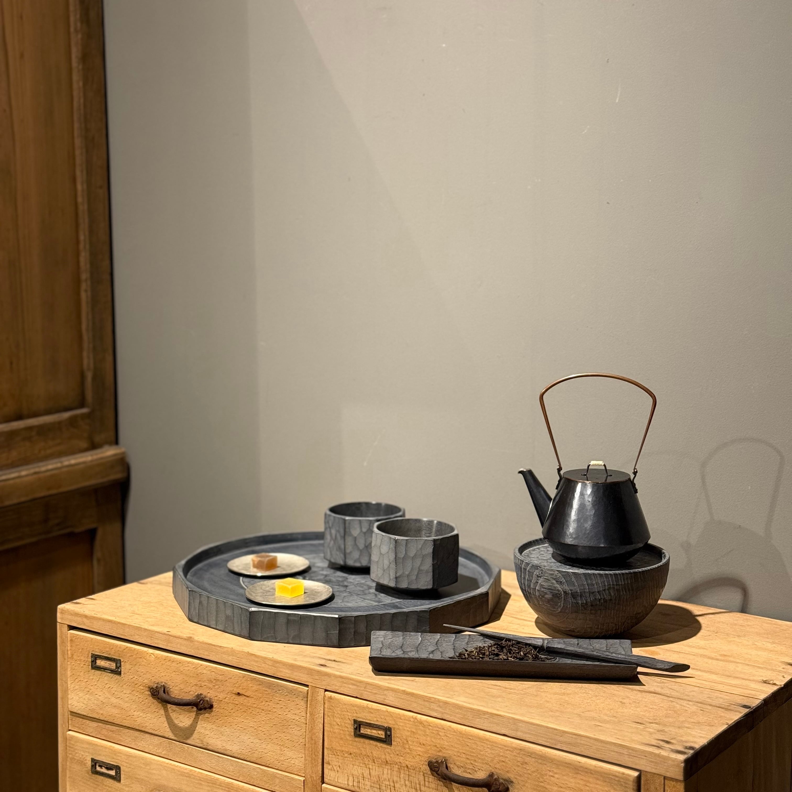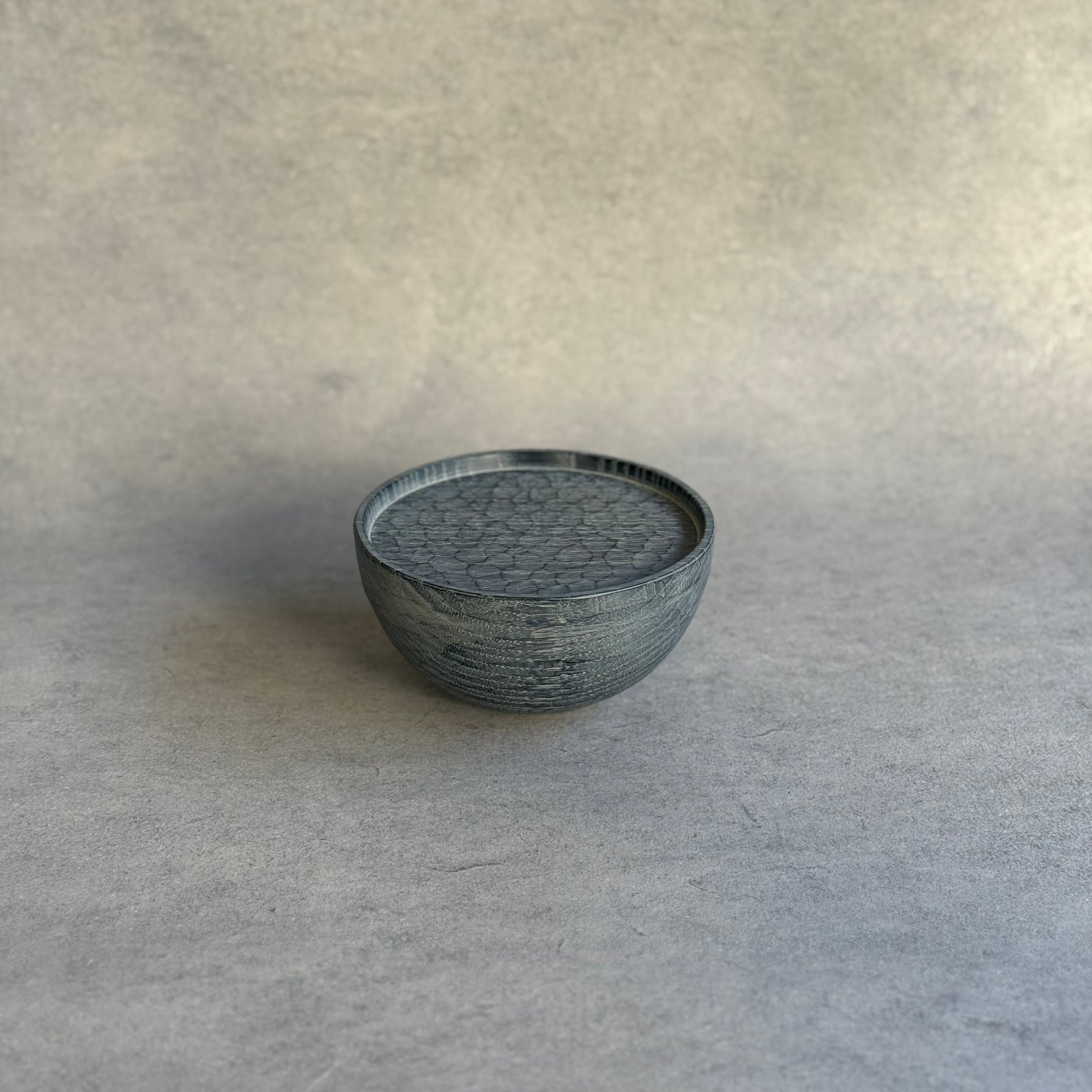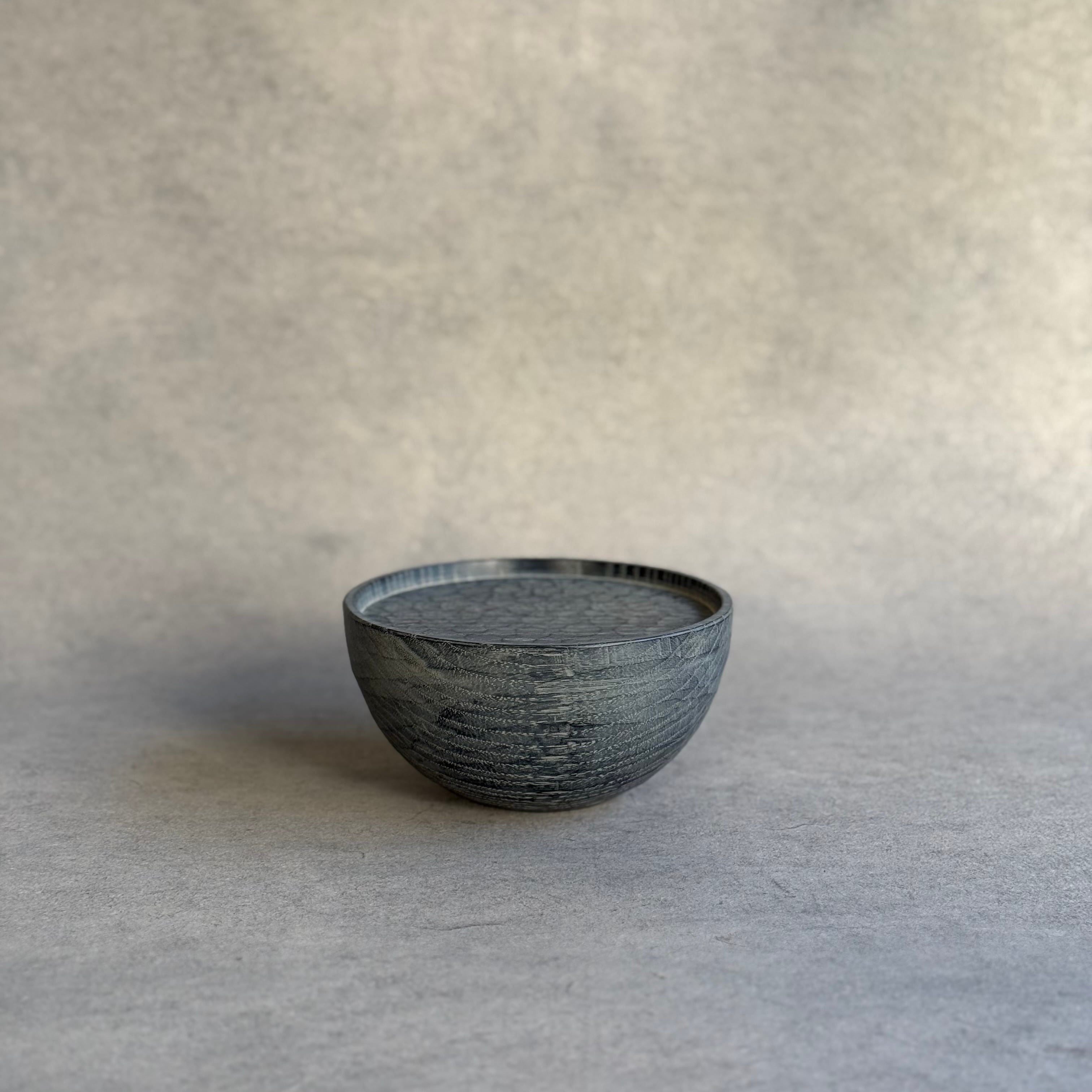 木と漆の質感を大切にしながら日常使いの器やお盆など、木の個性を生かした作品を制作される吉田欣司さん。程よい厚みの手彫りの仕上げは頼もしく、黒漆と白漆を何層にも塗り重ねて磨き上げる事で表れるブルーグレーの色合いはまるで霧を纏ったように柔らかく、使うほどに愛着が湧いてきます。