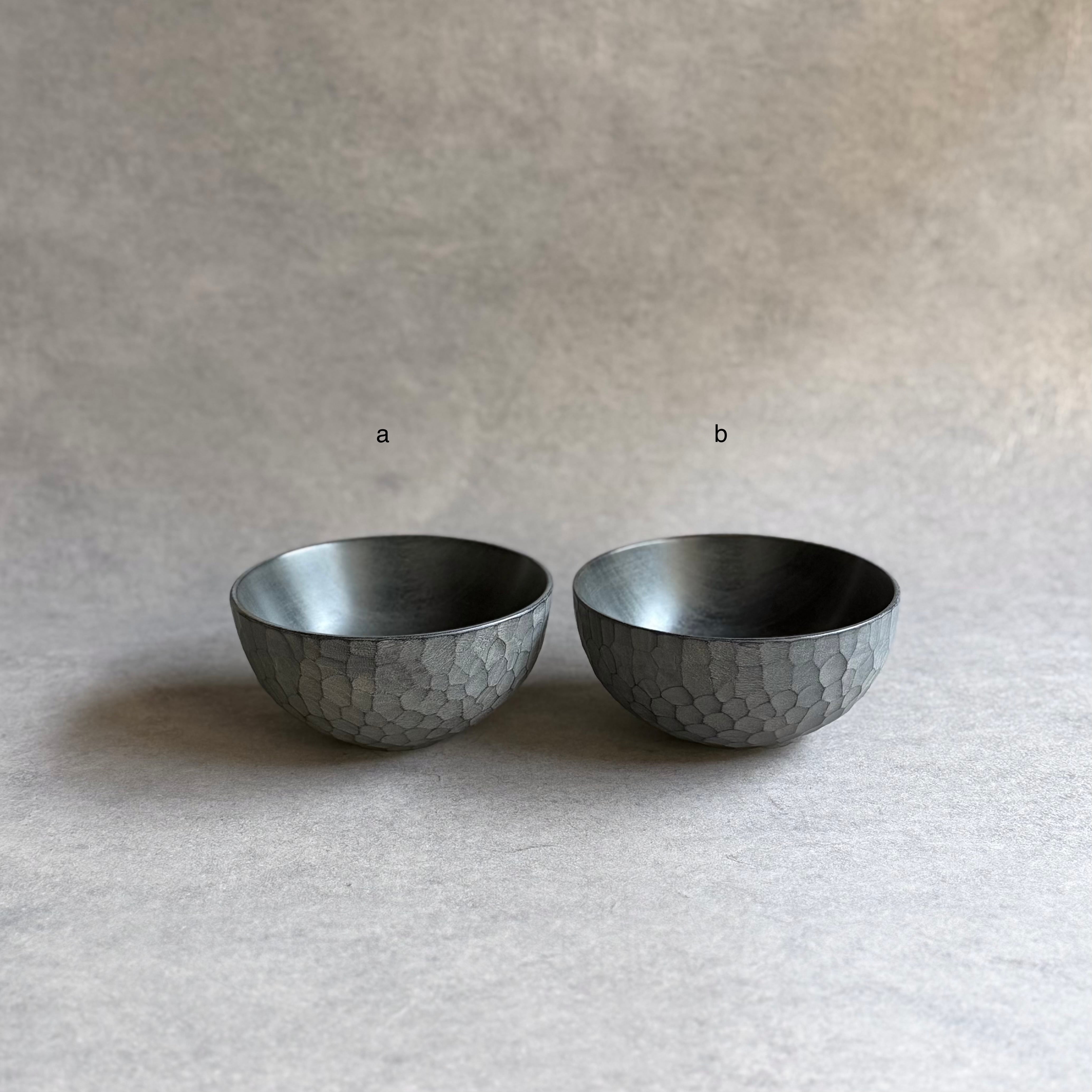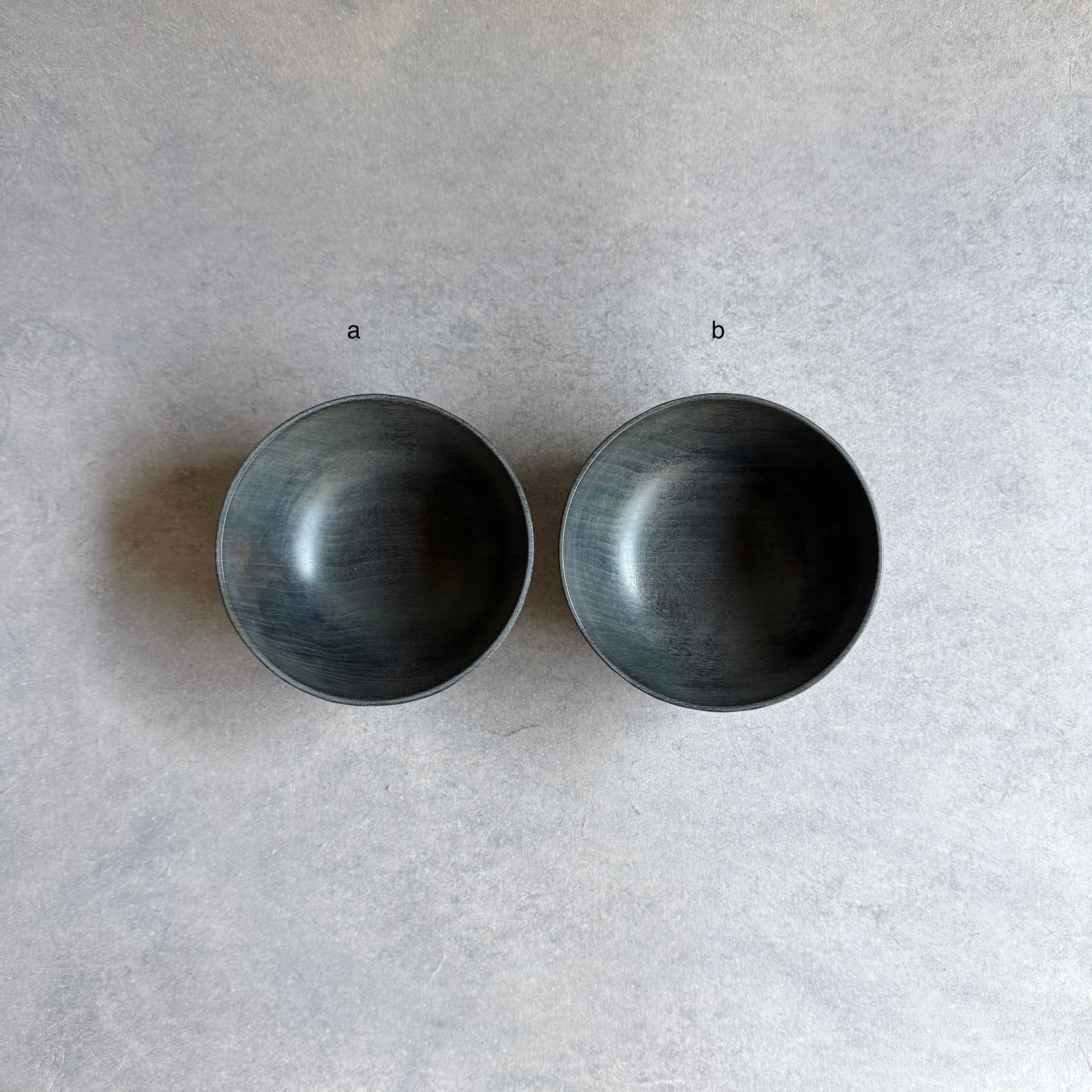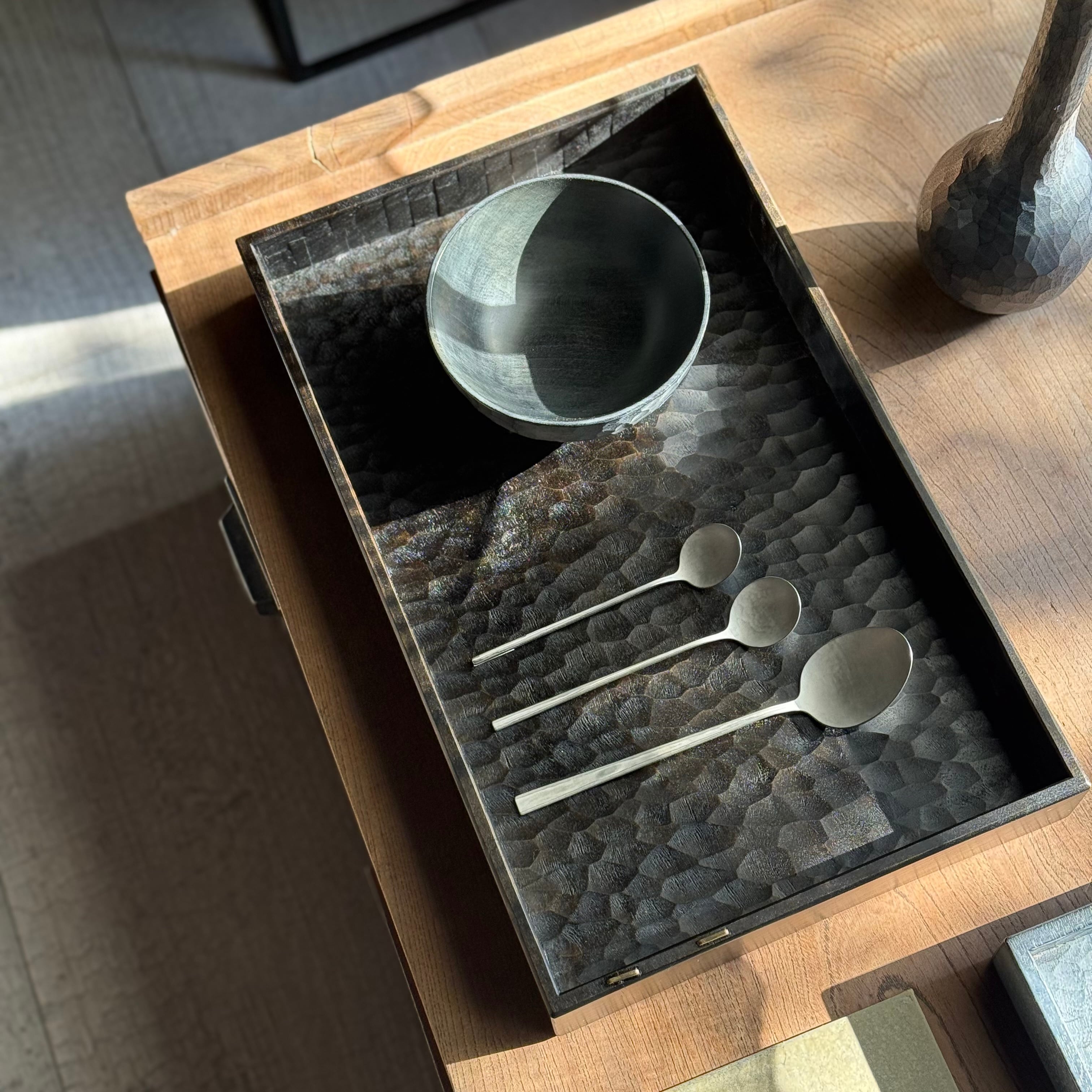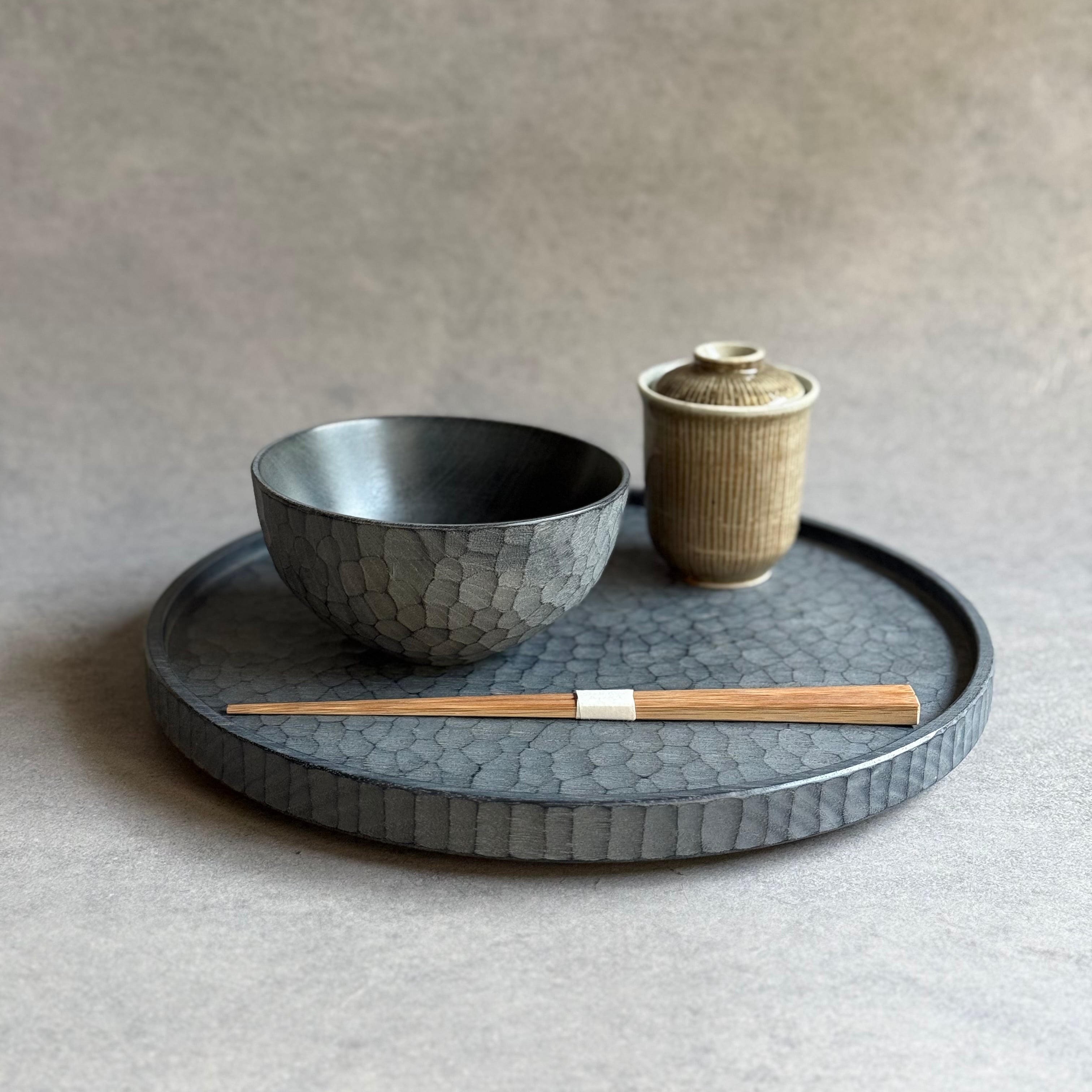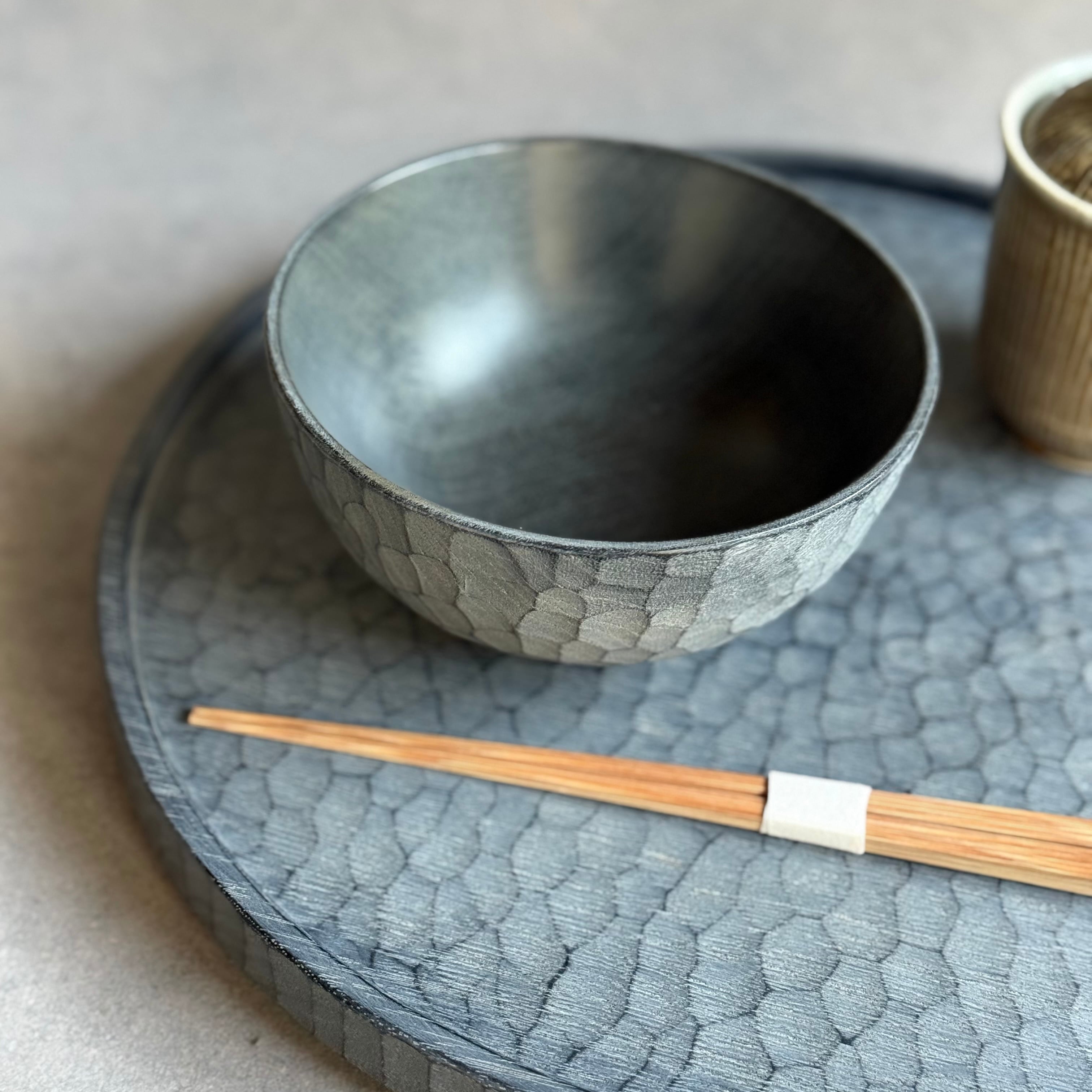 木と漆の質感を大切にしながら日常使いの器やお盆など、木の個性を生かした作品を制作される吉田欣司さん。程よい厚みの手彫りの仕上げは頼もしく、黒漆と白漆を何層にも塗り重ねて磨き上げる事で表れるブルーグレーの色合いはまるで霧を纏ったように柔らかく、使うほどに愛着が湧いてきます。