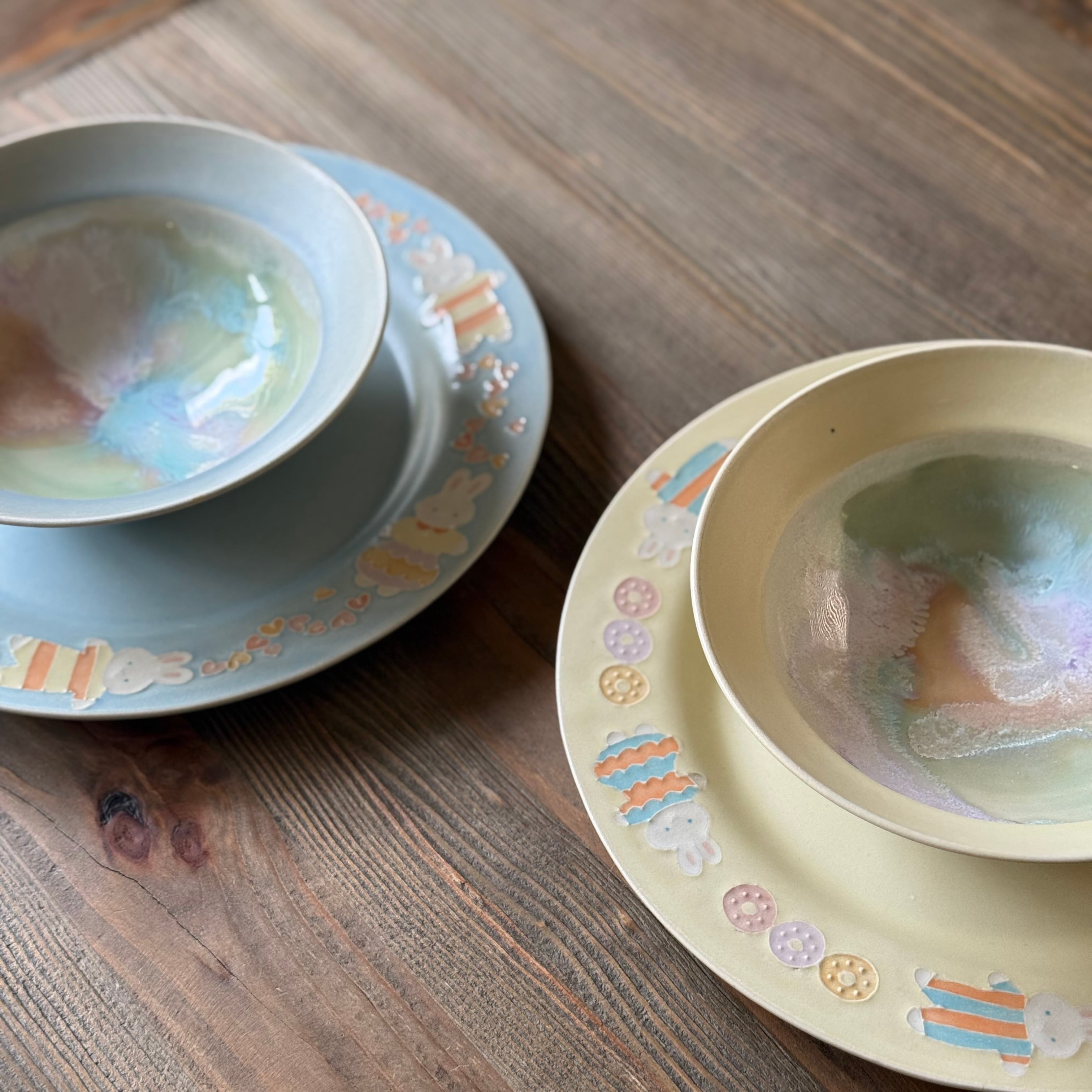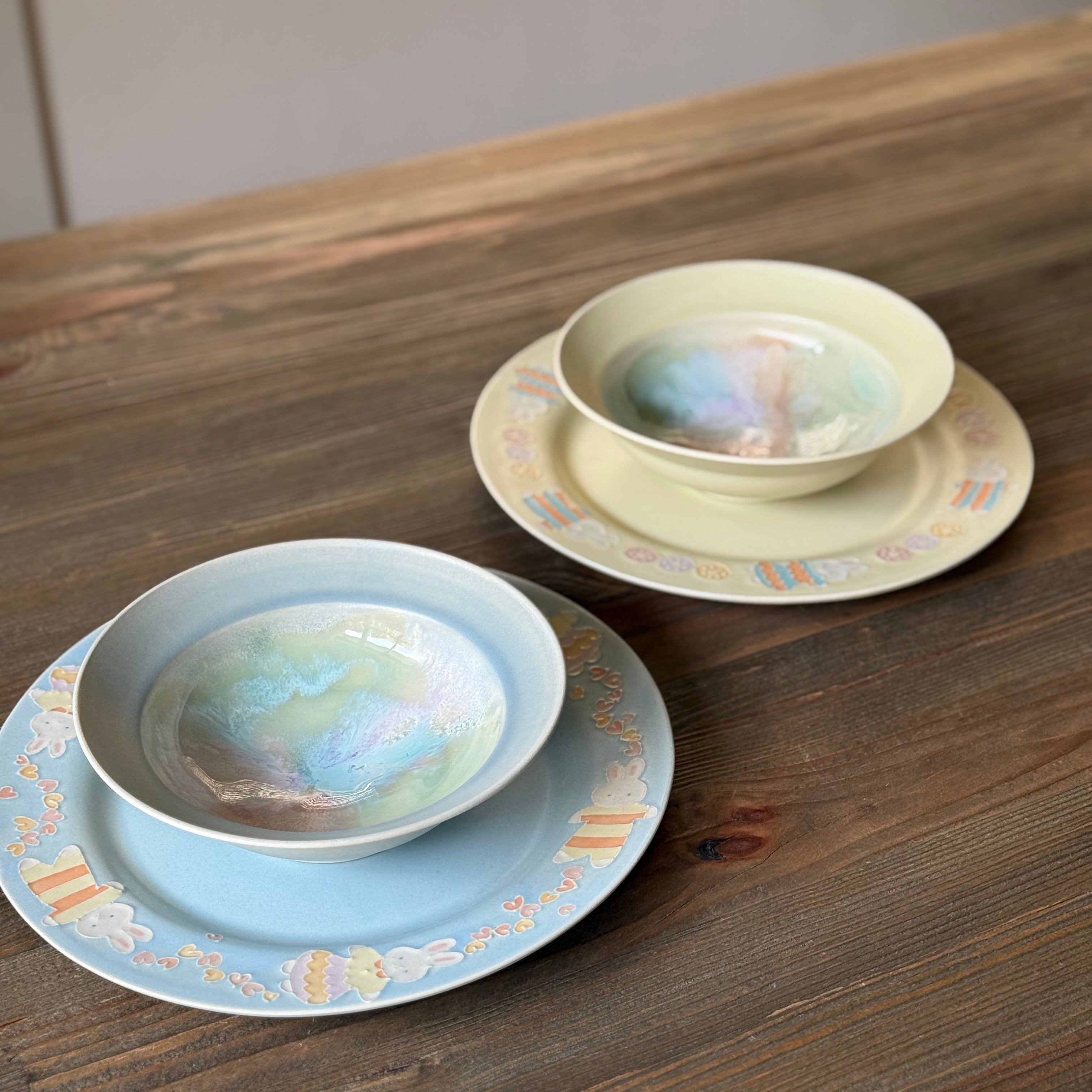 色遊びを楽しむような柔らかなシャーベットカラーの色合いと、いっちんと呼ばれる繊細な模様を組み合わせて、日常遣いの器から蓋物や飾り皿や花器など幅広く制作される中村 かりんさん。