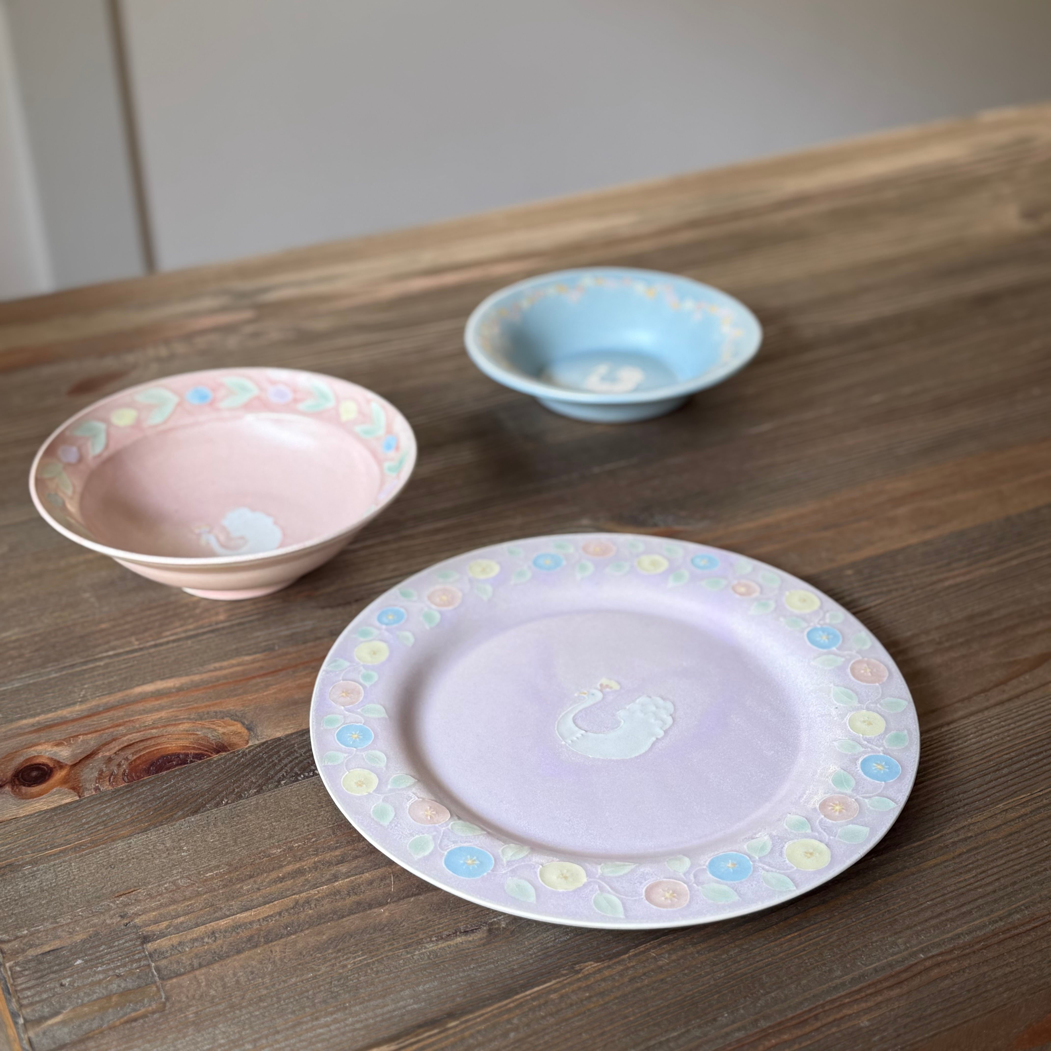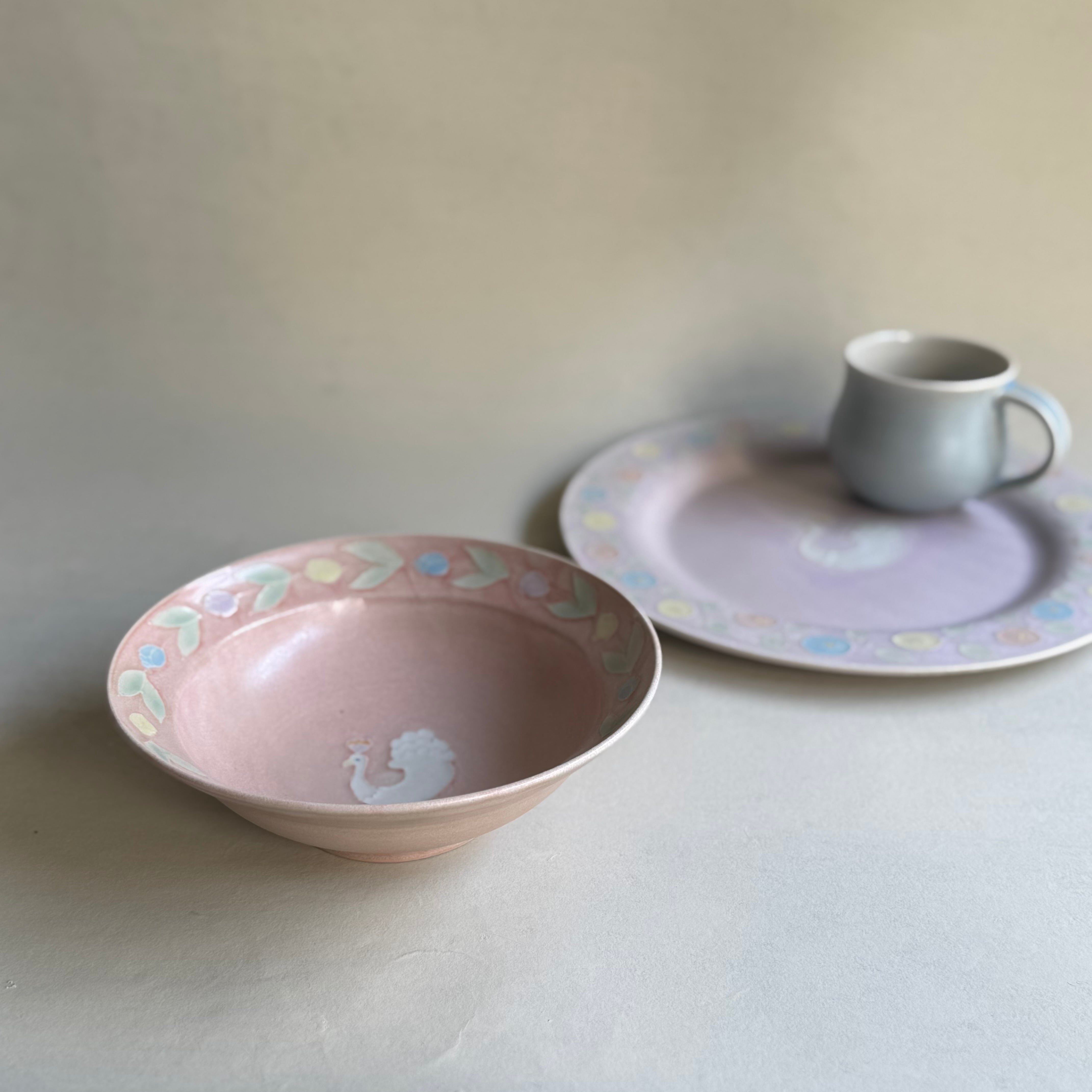 色遊びを楽しむような柔らかなシャーベットカラーの色合いと、いっちんと呼ばれる繊細な模様を組み合わせて、日常遣いの器から蓋物や飾り皿や花器など幅広く制作される中村 かりんさん。