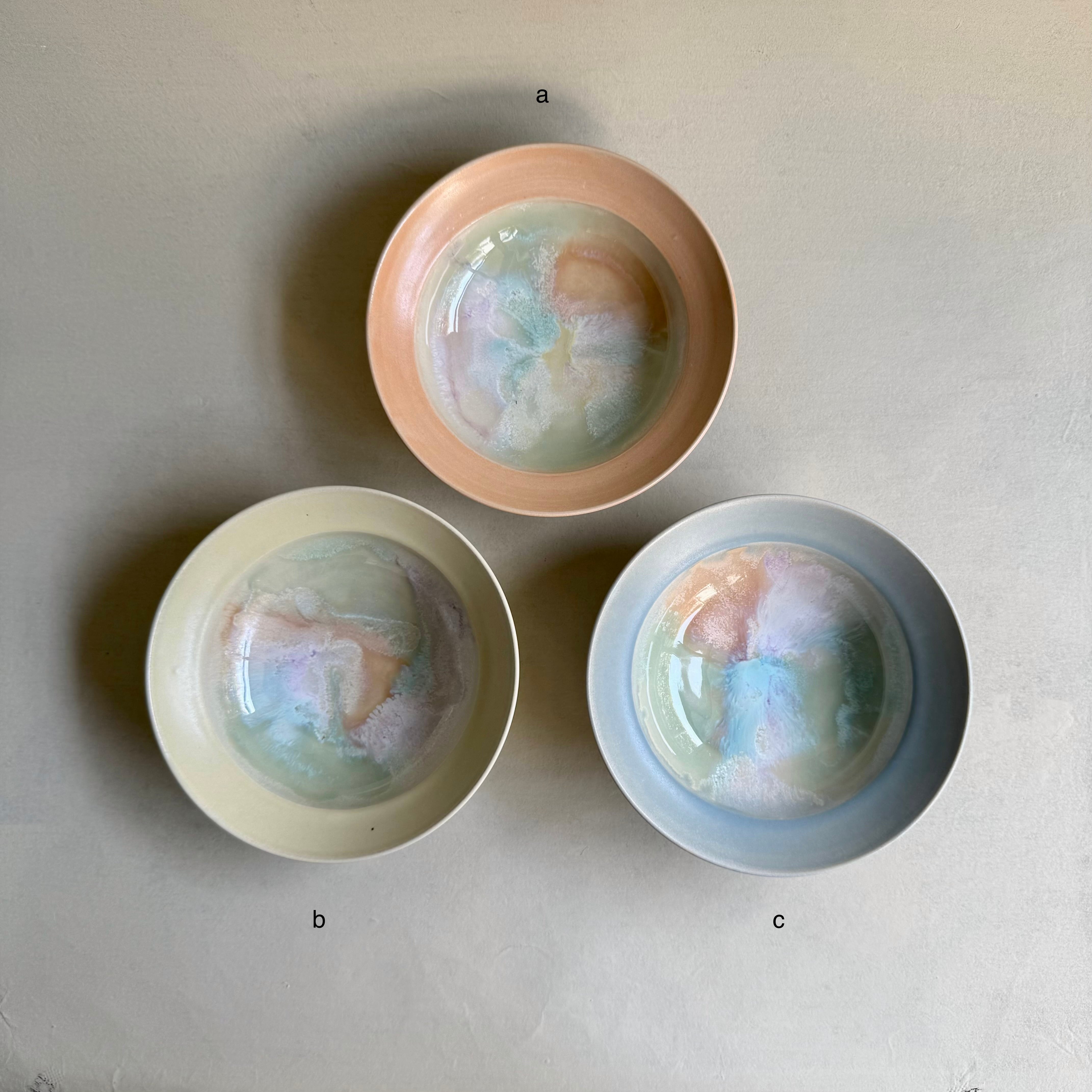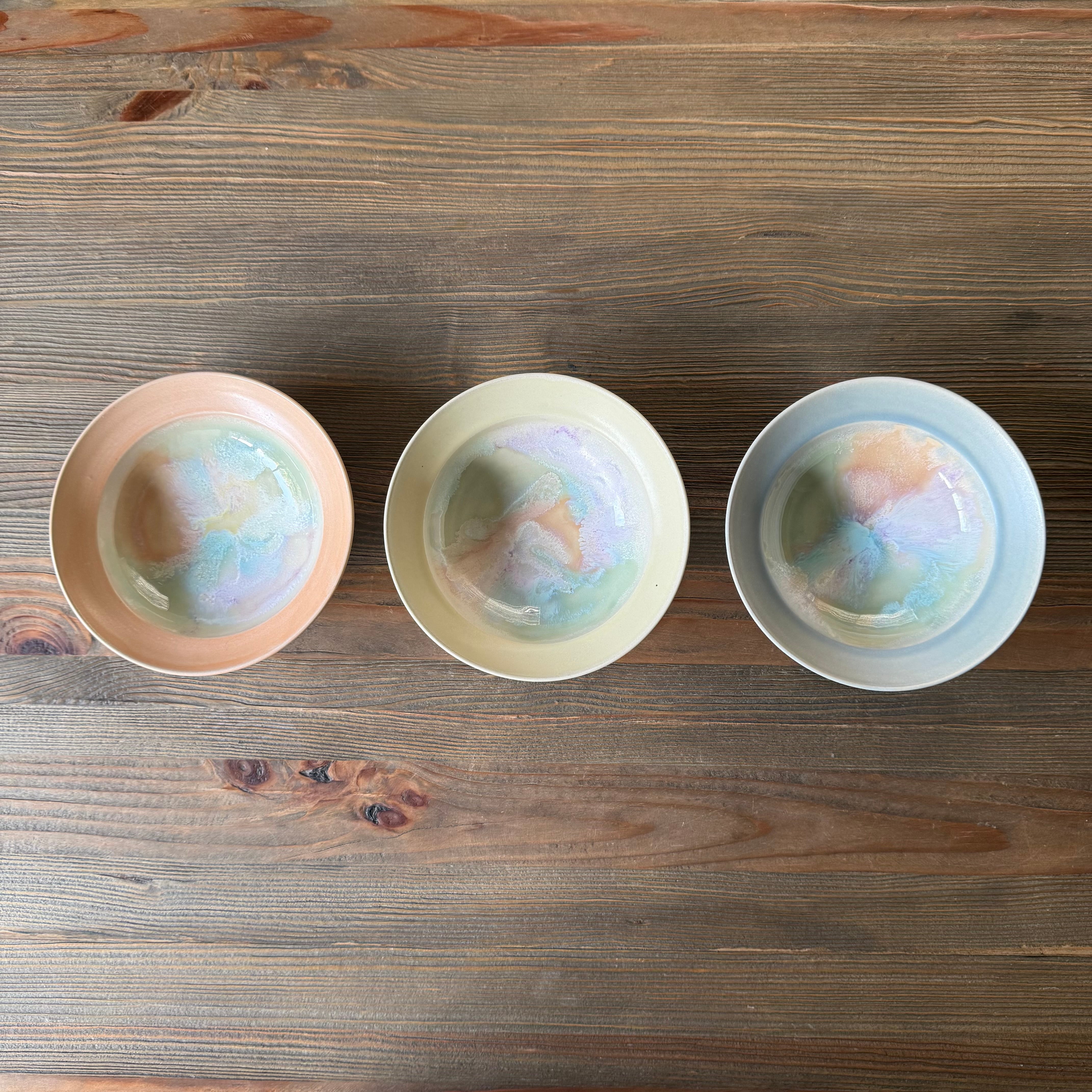 色遊びを楽しむような柔らかなシャーベットカラーの色合いと、いっちんと呼ばれる繊細な模様を組み合わせて、日常遣いの器から蓋物や飾り皿や花器など幅広く制作される中村 かりんさん。