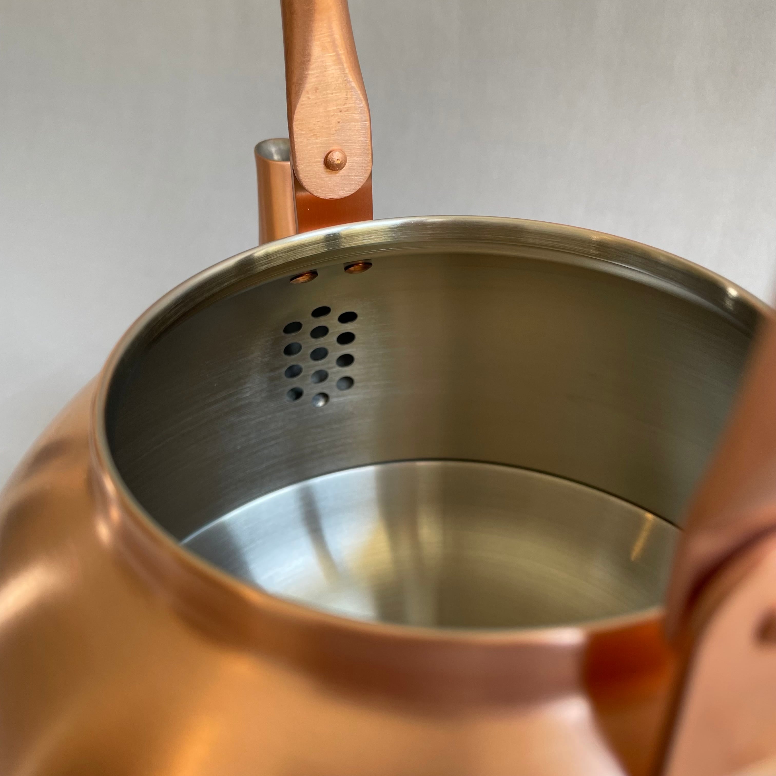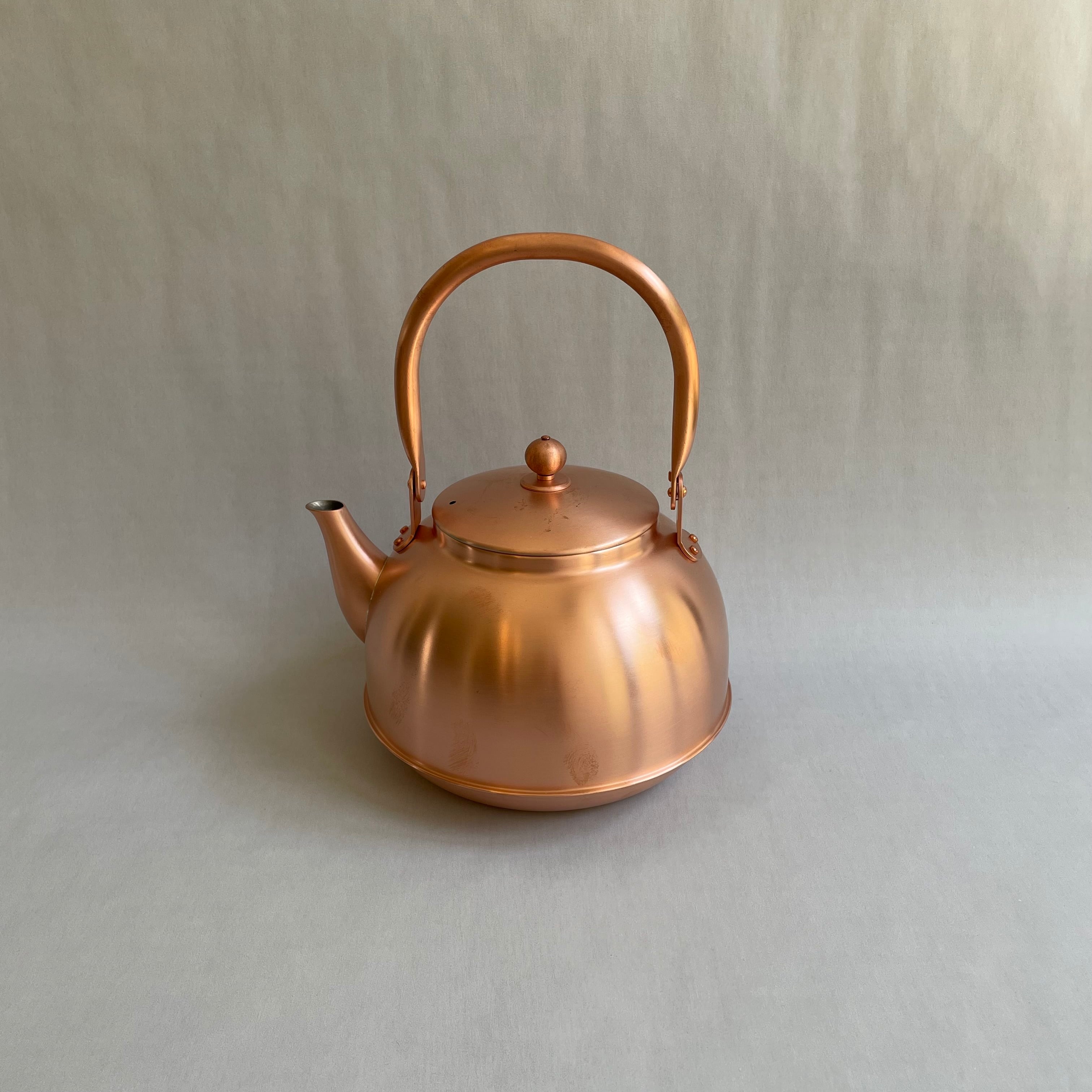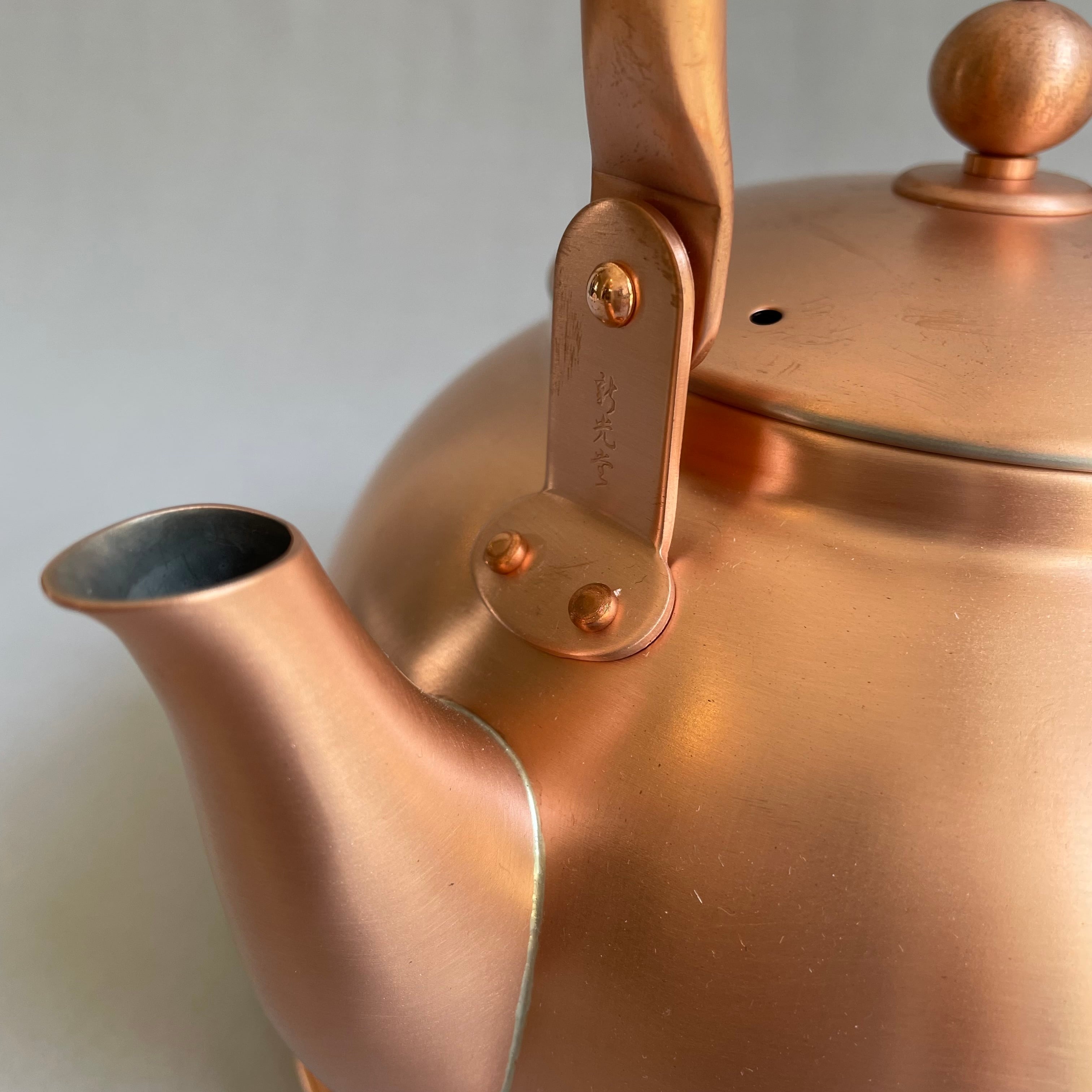 銅には抜群に優れた熱伝導と抗菌・除菌作用や塩素を分解する作用があり薬缶にとても適した素材です。使い込む程に赤金色から深みのある飴色へと風合いを増していきます。