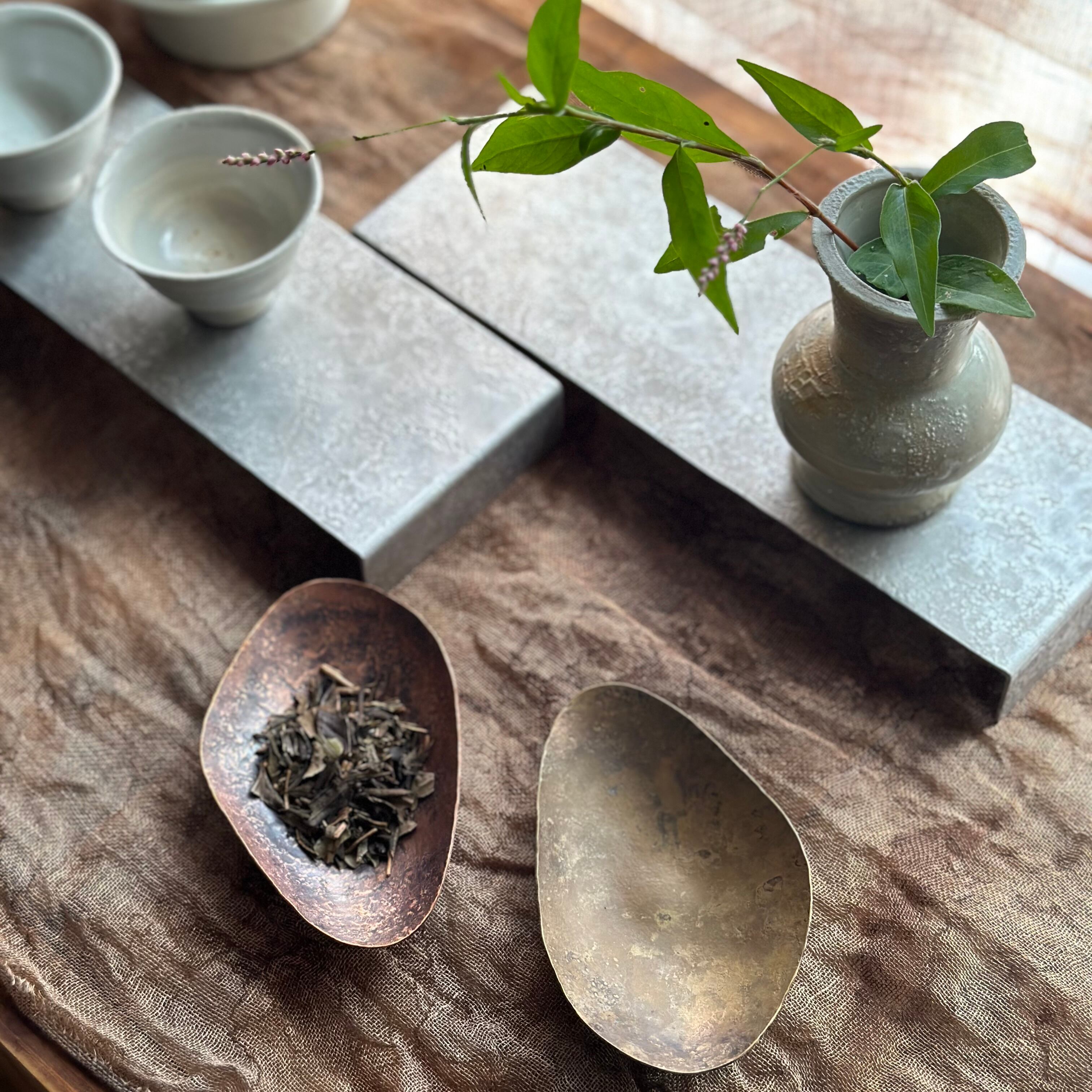 詫びた風情が美しい銅の茶則はお茶の室礼を美しく整える茶道具です。