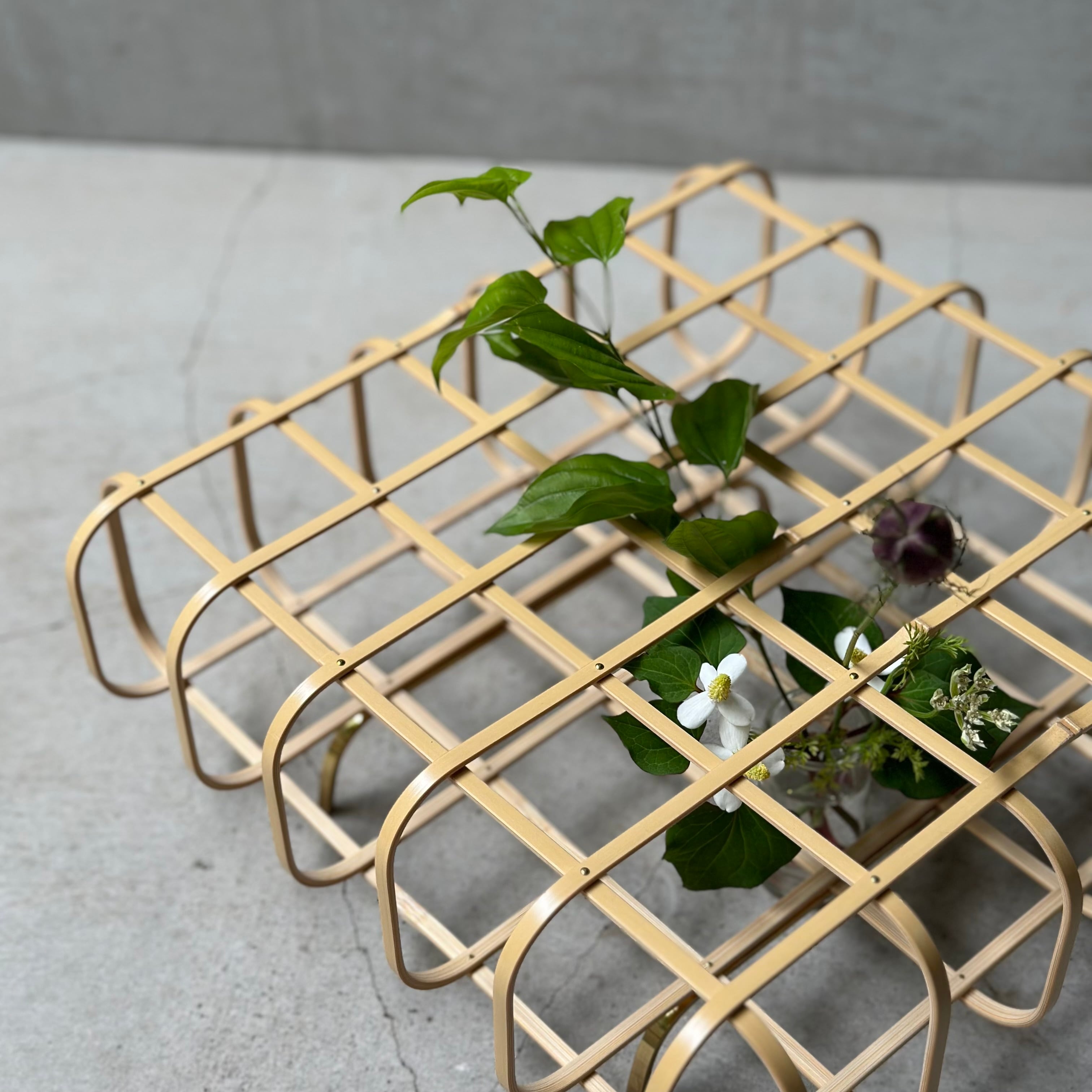このカゴは中にものが入れられないので、作品そのものをお愉しみいただくか、上にものを置くなどしてお使いいただけます。お花をいけると奥行きが生まれ、無造作に物を置いただけでも整然として絵になる作品です。