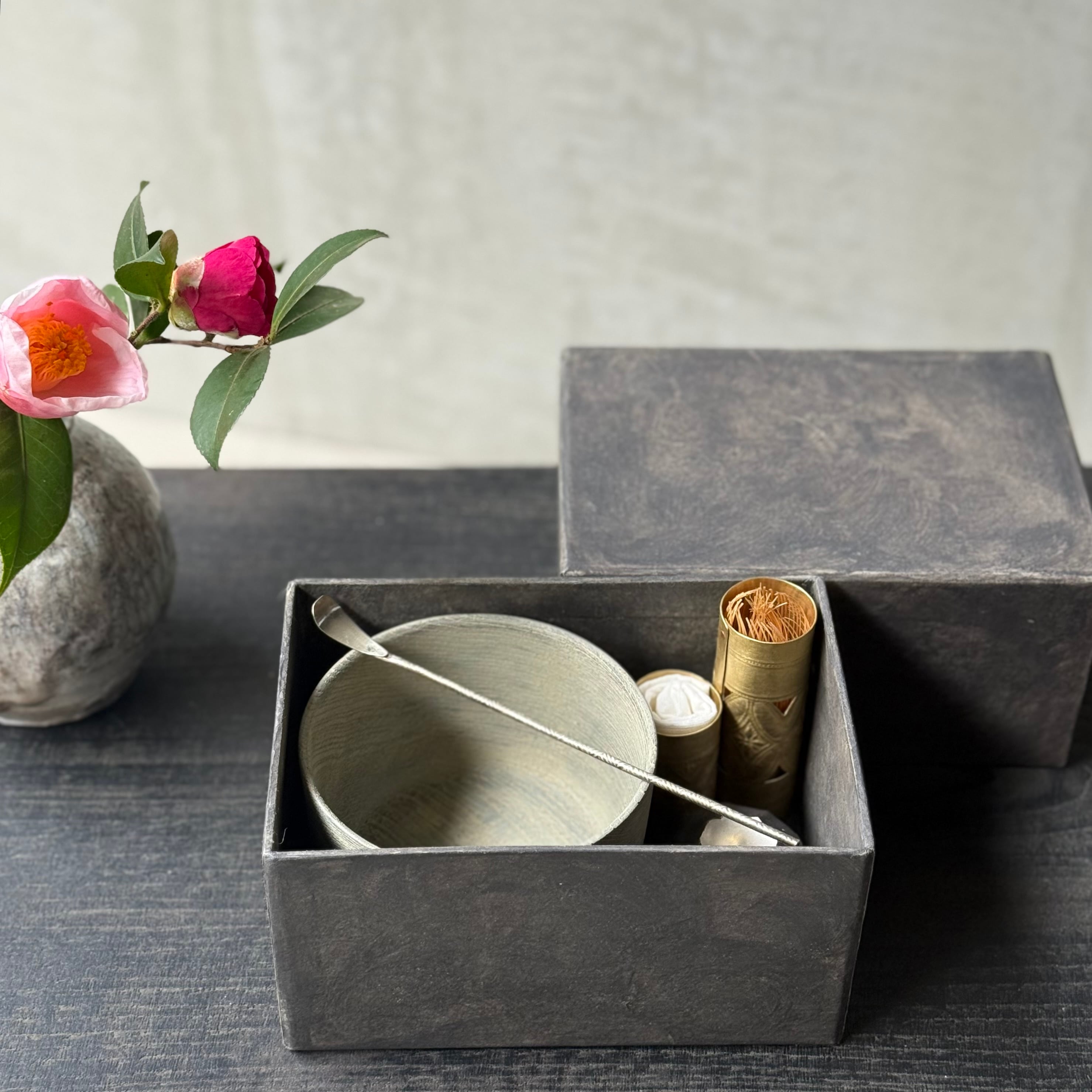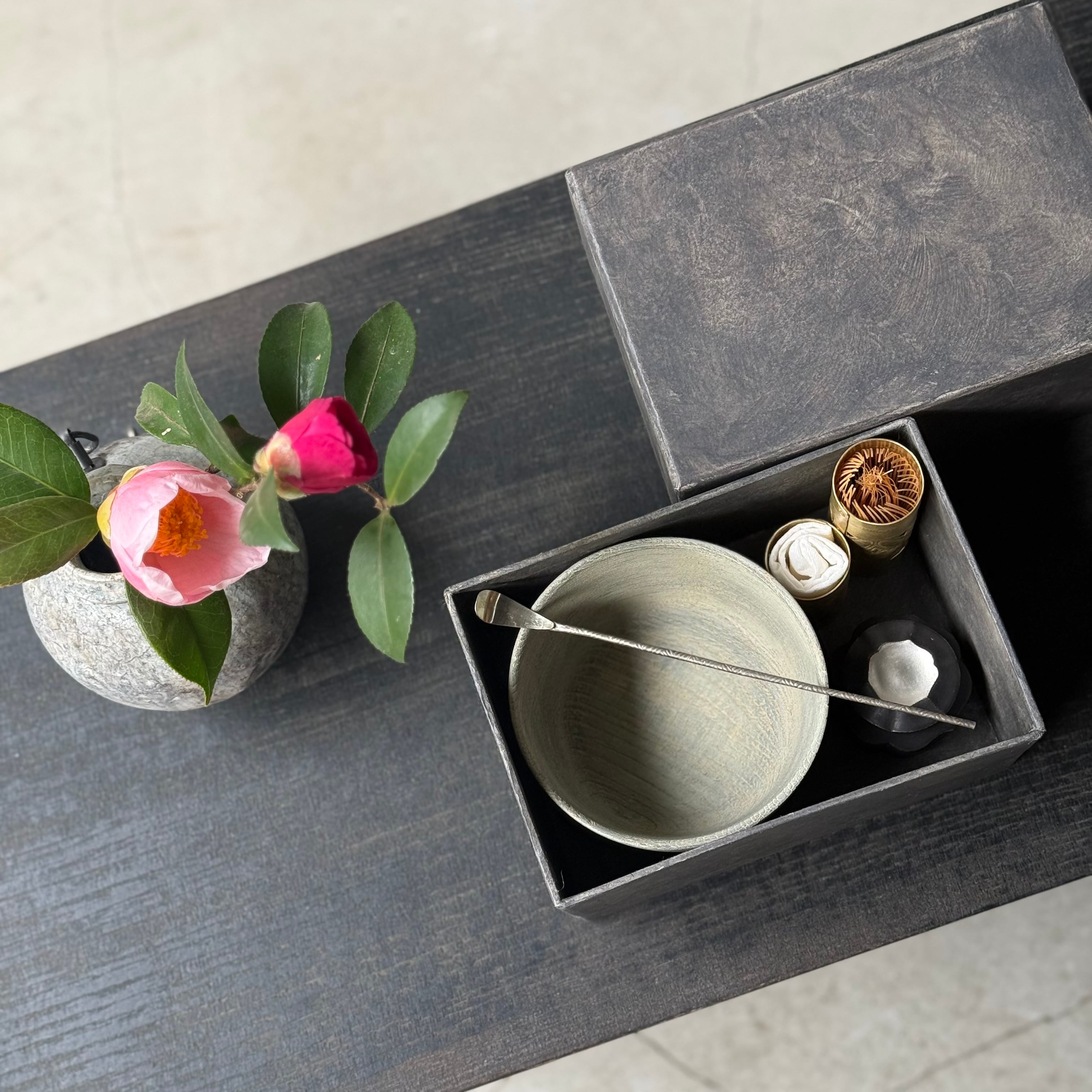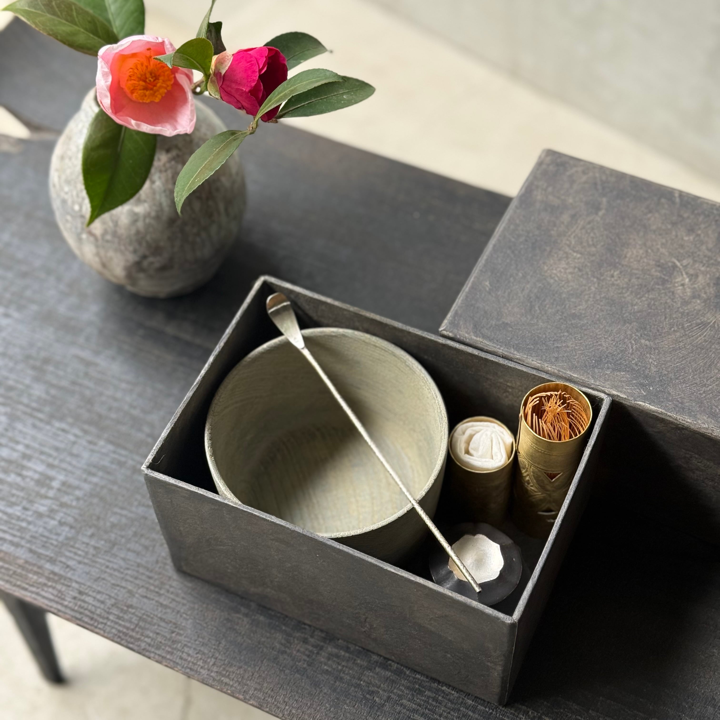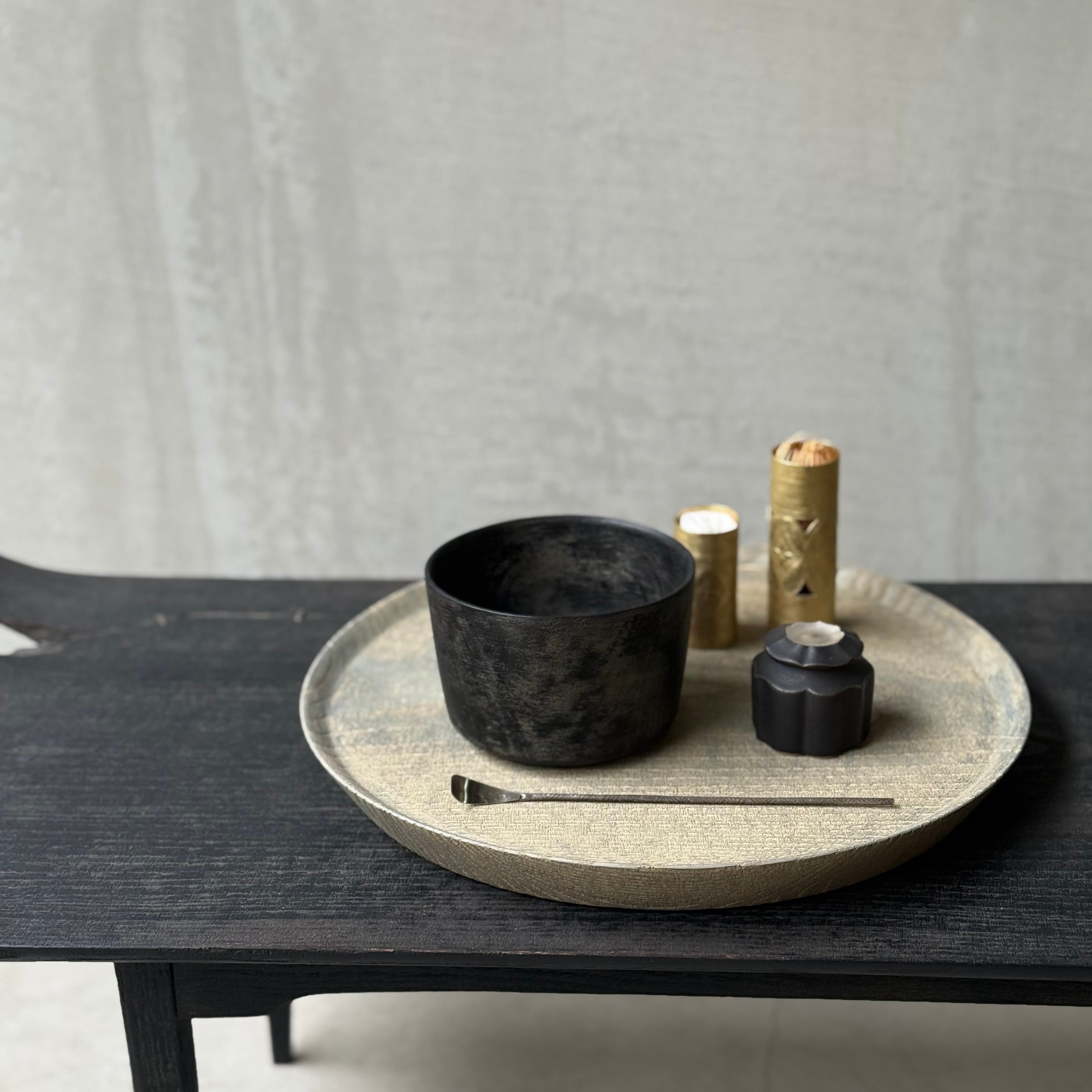 ひとつひとつ丁寧に打ち込まれた点や線、道具を使って丹念にたたくという緻密な作業と時間の重なりにより、異国情緒をも感じる佇まいに目を惹かれます。